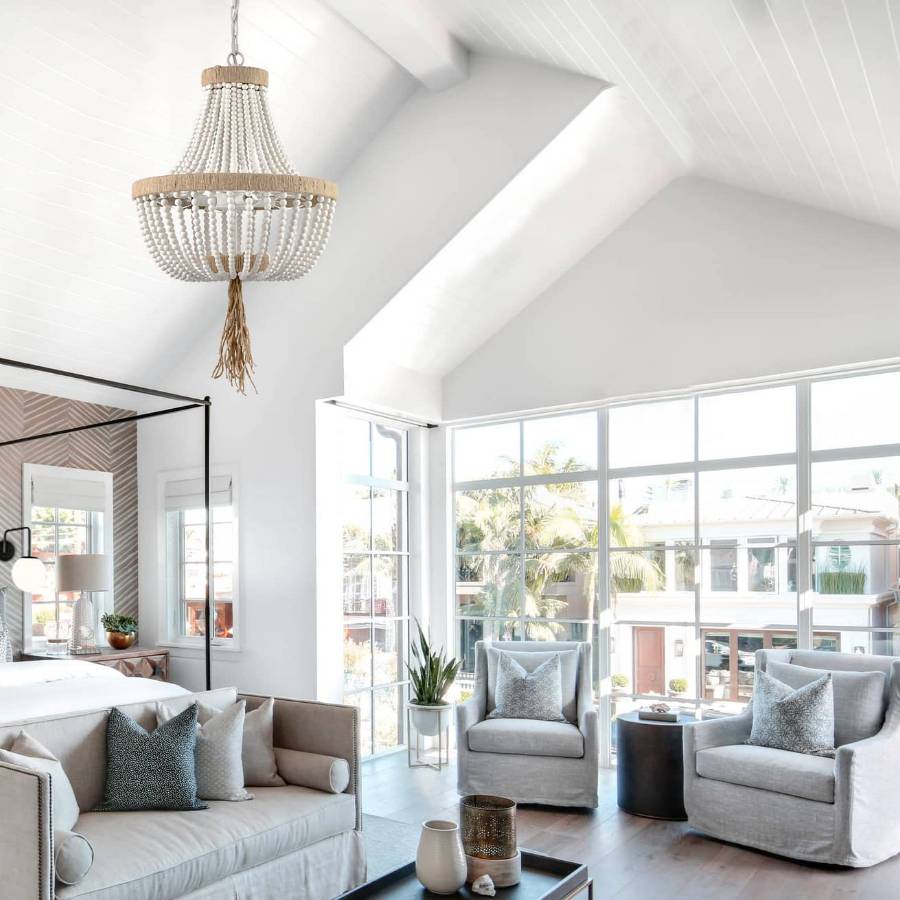 The extra large chandelier’s canopy, chain, wood beads, and lamp holders sport a white finish, delivering a hint of rusticity to the living room. Its metal frame, top accent, and bottom accent wrapped by tortilla hemp rope and the dangling tassel lend an unexpected touch and unbeatable character to the room. Elegant form meets a farmhouse vibe in this chandelier while the beads and metal make for a dramatic play. The chandelier boasts tapering wood bead strands on the upper tier while the glamorous wood bead garlands showcase a circular silhouette on the lower tier. It blends seamlessly into the space with its white finish going well with the white ceiling, the white walls, and the white windows. It lends a boho chic style and contributes so much to the visual impact of the living room.