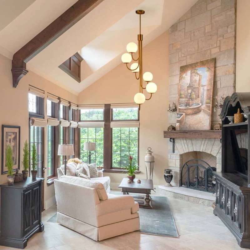 The contemporary large chandelier flaunts an electrophoretic brass finish, pepping up your interior with a touch of glitz. Showcasing a cluster of milk glass globes supported by scrolling arms, it completes the aesthetic with an elegant touch. Each arm of the large chandelier extends from a central body and curves outwards in a spiral pattern. The glass shades are supported by gracefully curved arms. Its milk glass shades contrast and compete with the gold finish, adding a ton of eye appeal and enhancing the piece's visual interest and beauty even further. It is showstopping addition to the living room with its gleaming finish and intricate design. It stands out and shines on its own and brings just the perfect amount of color to the space. The light fixture adds excitement to this otherwise neutral living room.