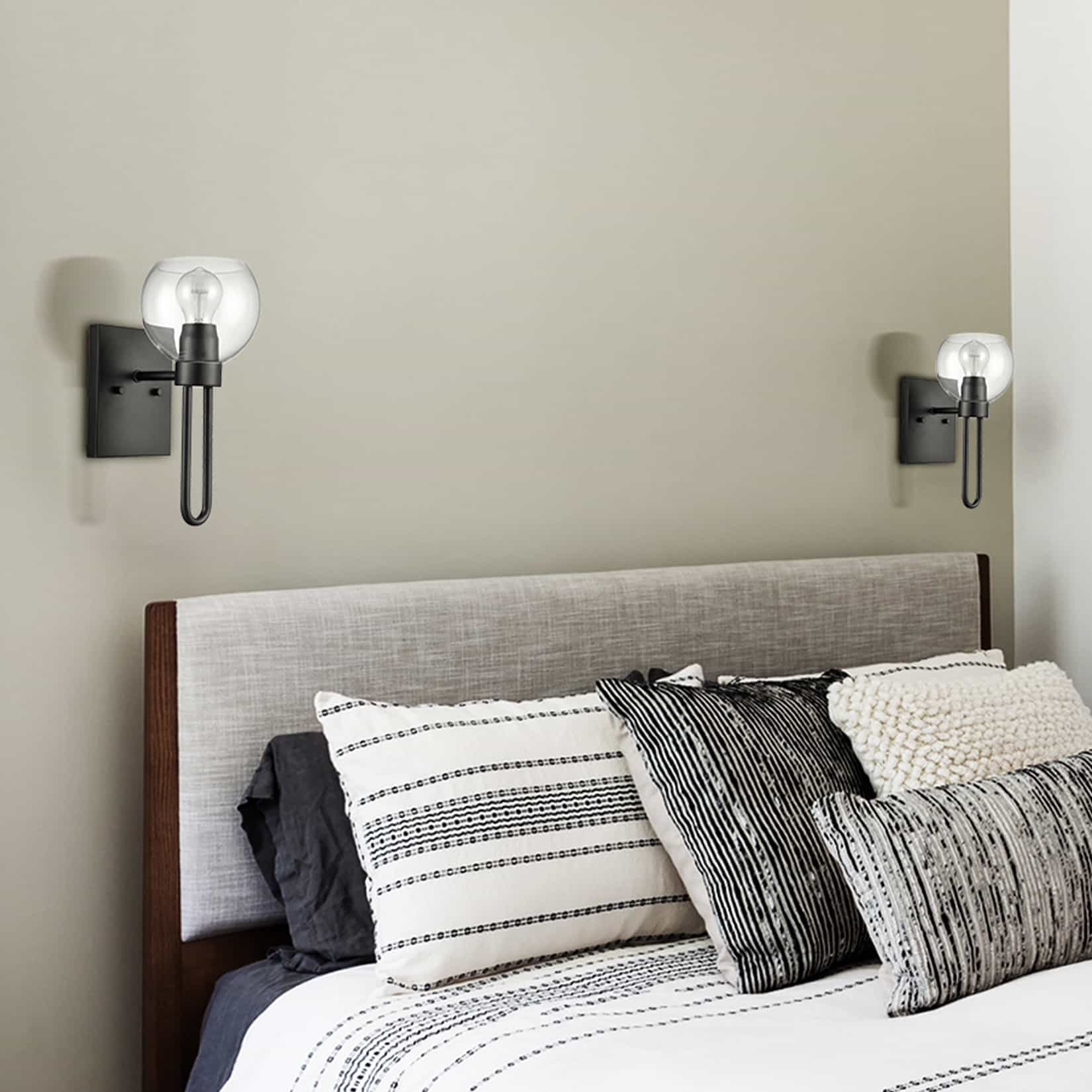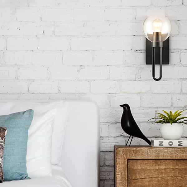 Dressed in a semigloss black finish, the wall sconce features a clear glass globe lampshade, a rectangular metal backplate, and a U-shape column stand, adding a farmhouse modern style and a touch of geometry to your living space. Its hand-blown clear glass globe shade is designed to house an exposed bulb to complete the aesthetic. Its sphere silhouette brings both stunning decorative detail and a touch of geometry. It can only be mounted as an uplight.