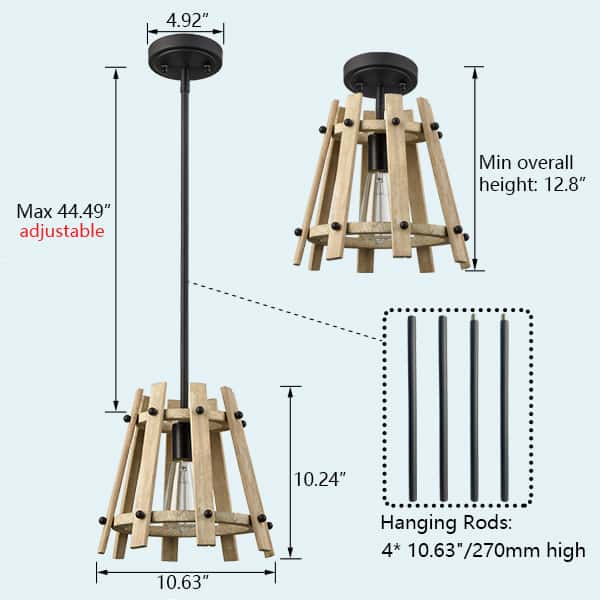Flaunting a semigloss black finish, the farmhouse wood pendant lighting’s canopy, hanging rod, and lamp holder bring a dash of drama to your home. Its open wooden cage adds a hint of rusticity to the living space with a beige finish. Two wood circles and a few wood slats are put together to form an airy trapezoid lampshade and encircle an exposed bulb, showcasing the beauty of geometry. A mix of finishes encompasses both nature-inspired and classic elements, yet maintains a modern edge. It is sloped ceiling adaptable and comes with four 10.63-inch rods.