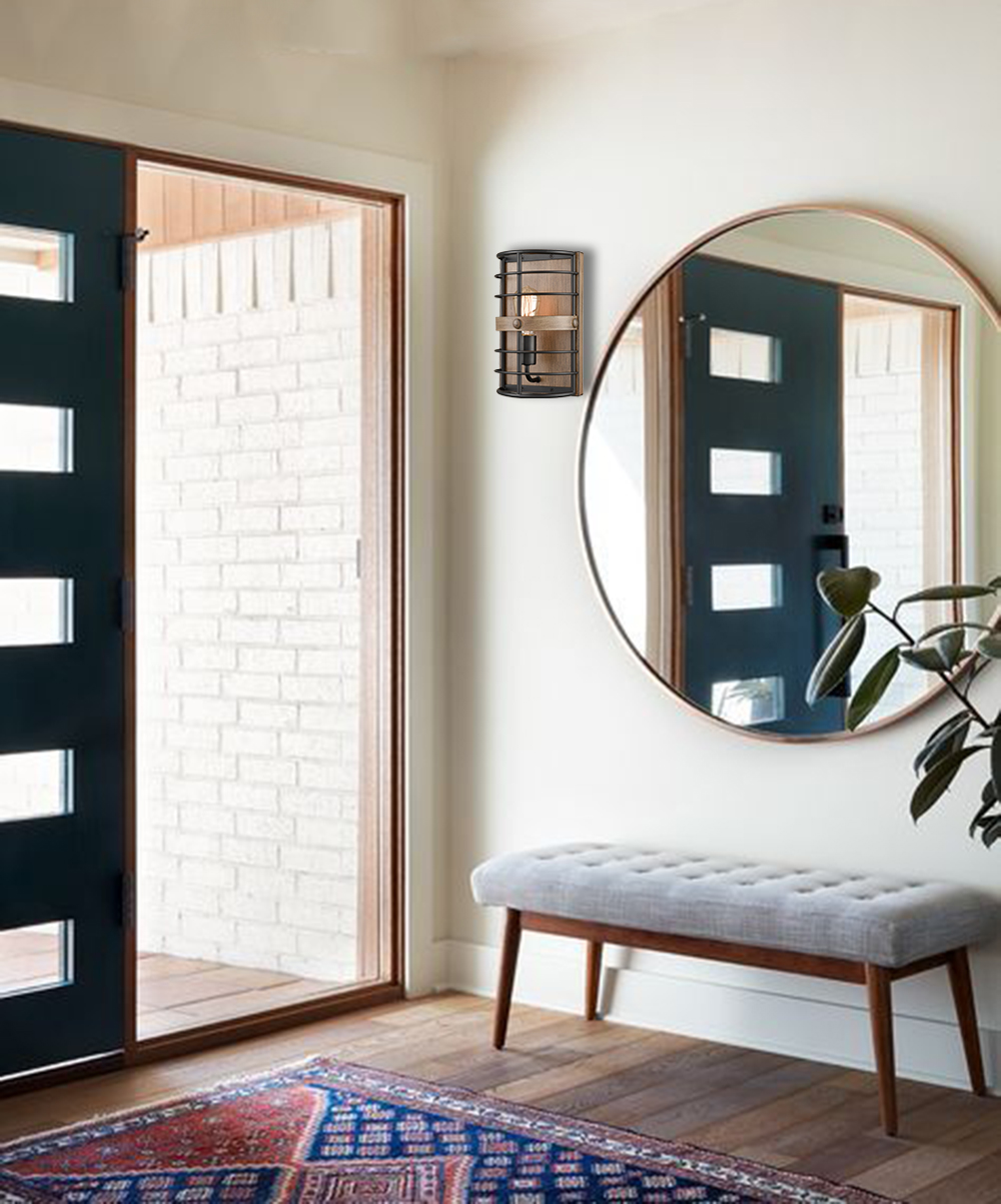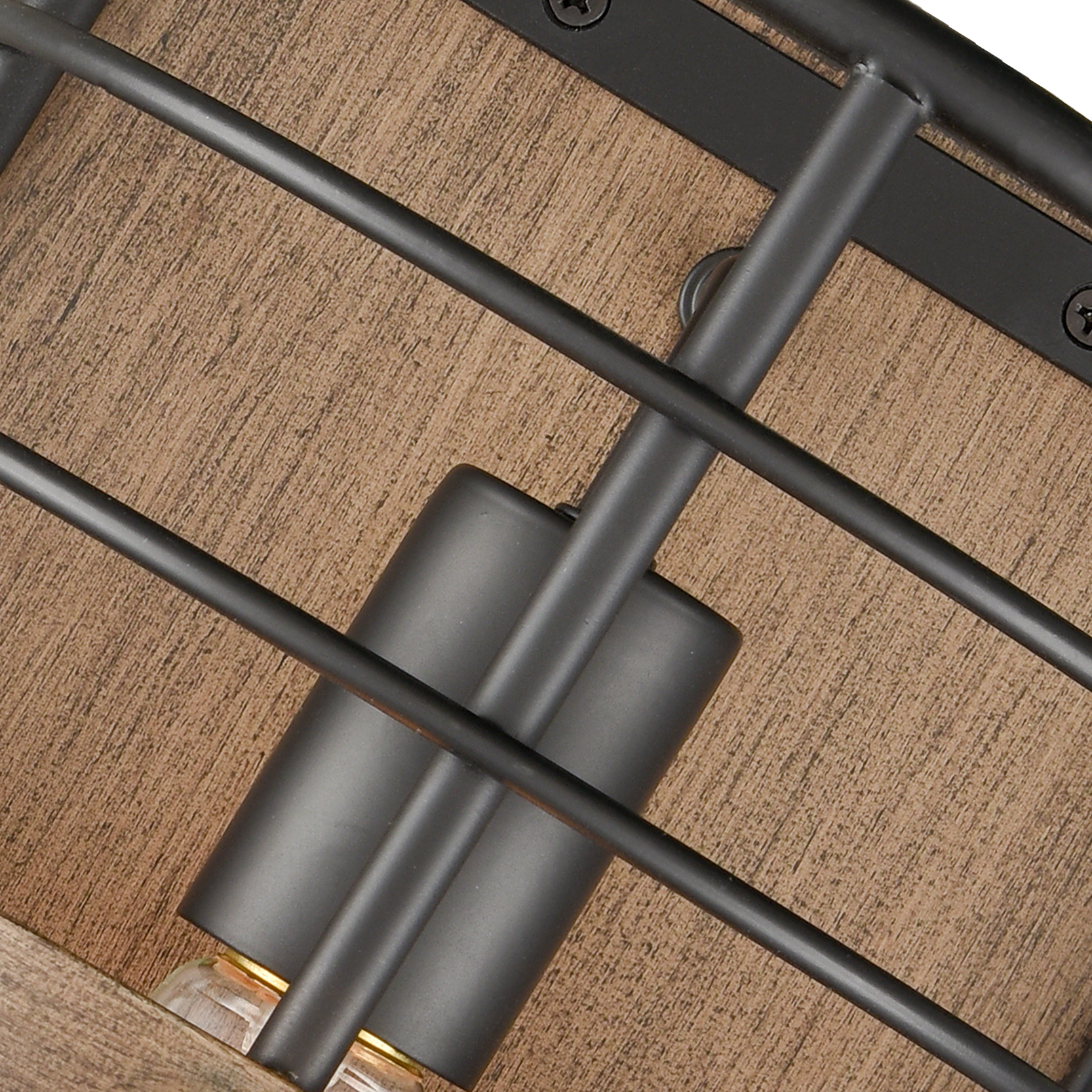The wall sconce’s metal cage, arm, and lamp holder are accented with semi-gloss black finish. A semicircular open cage is designed to house and protect an exposed bulb, allowing the lights to shine through freely. The metal cage shade is held aloft by a semicircular metal slat for bringing rich visual interest to your aesthetic. Its rectangular canopy and the semicircular metal slat are dressed in a faux wood finish. Its beautiful dual-tone finish encompasses both nature-inspired qualities and farmhouse elements, yet maintains a pastoral edge.