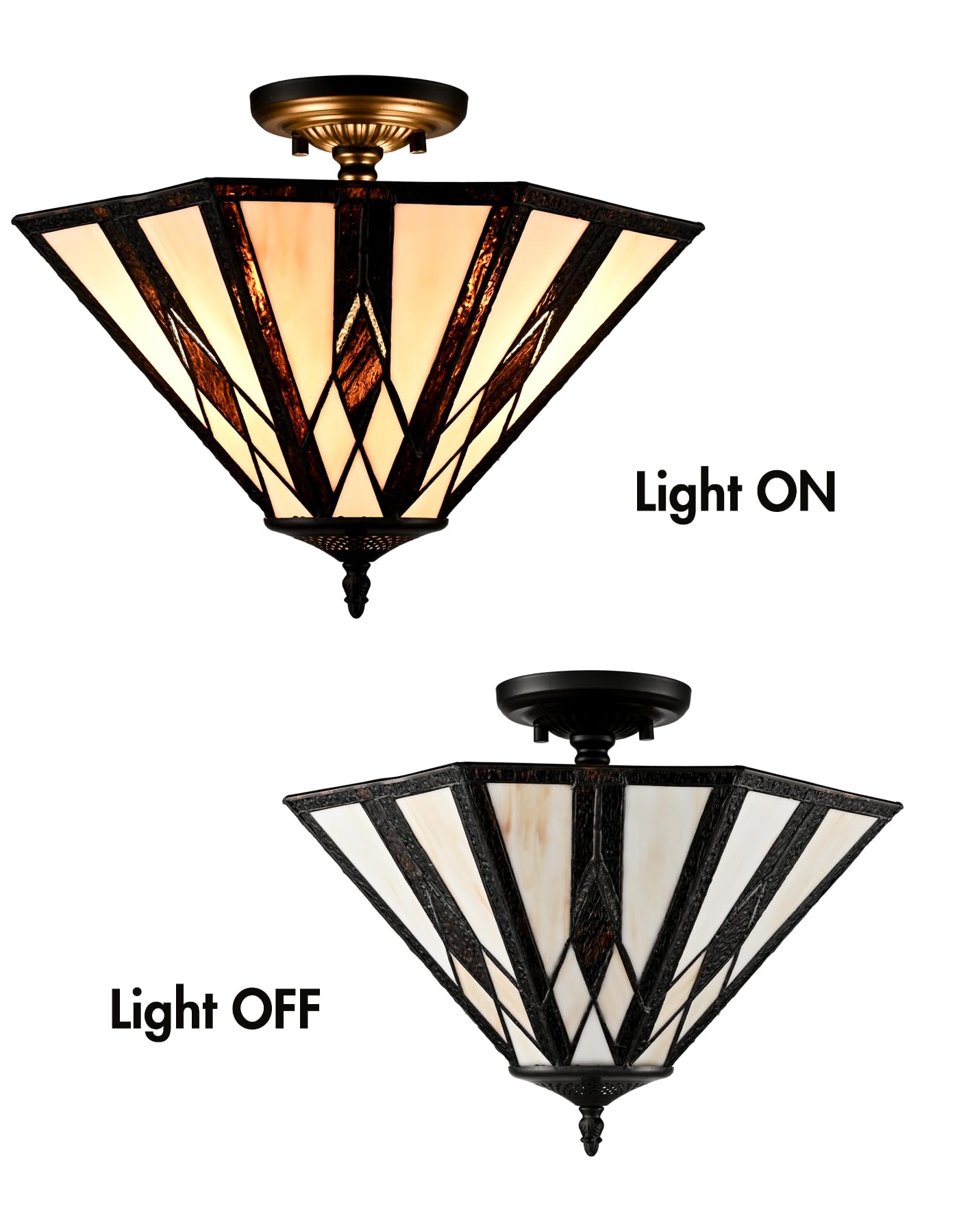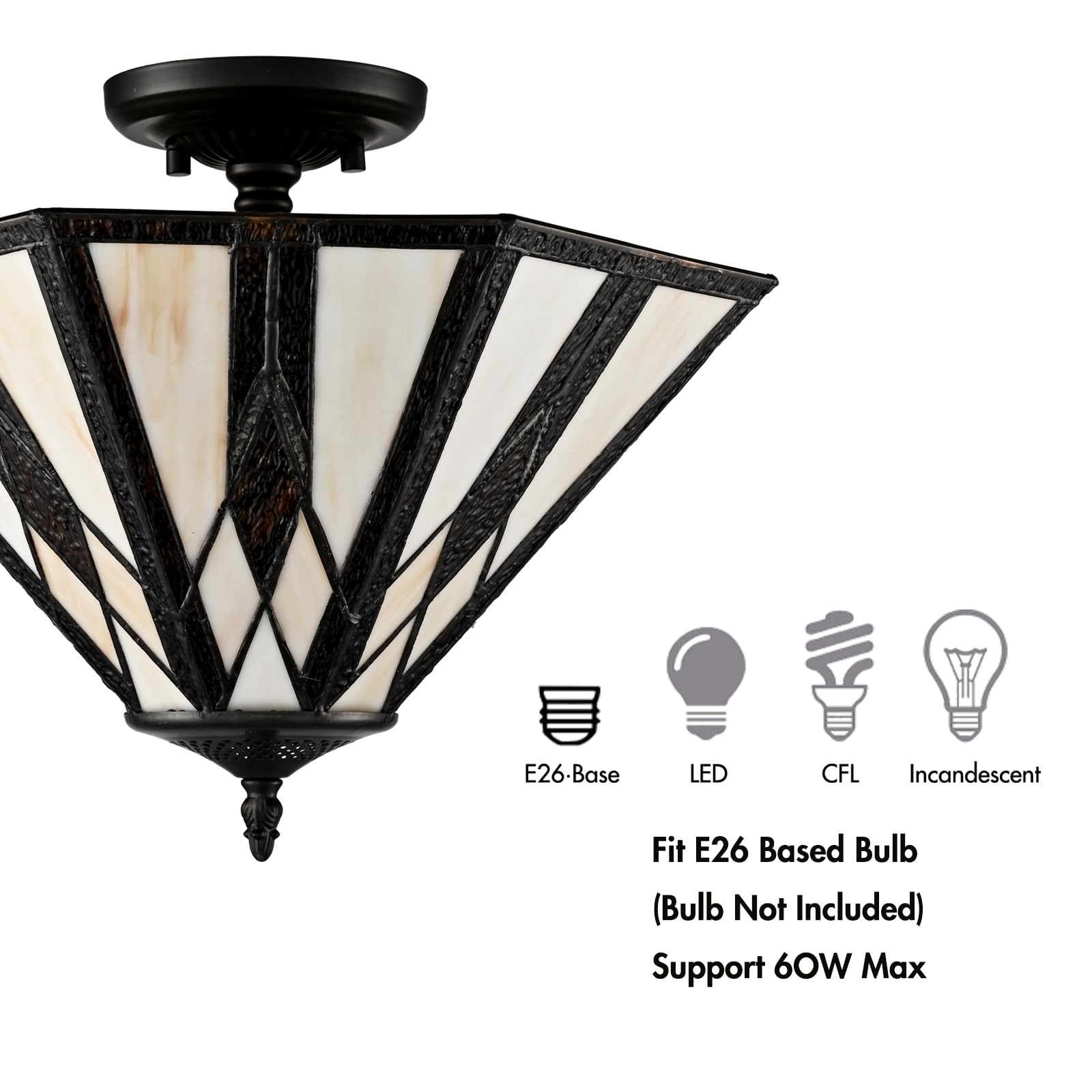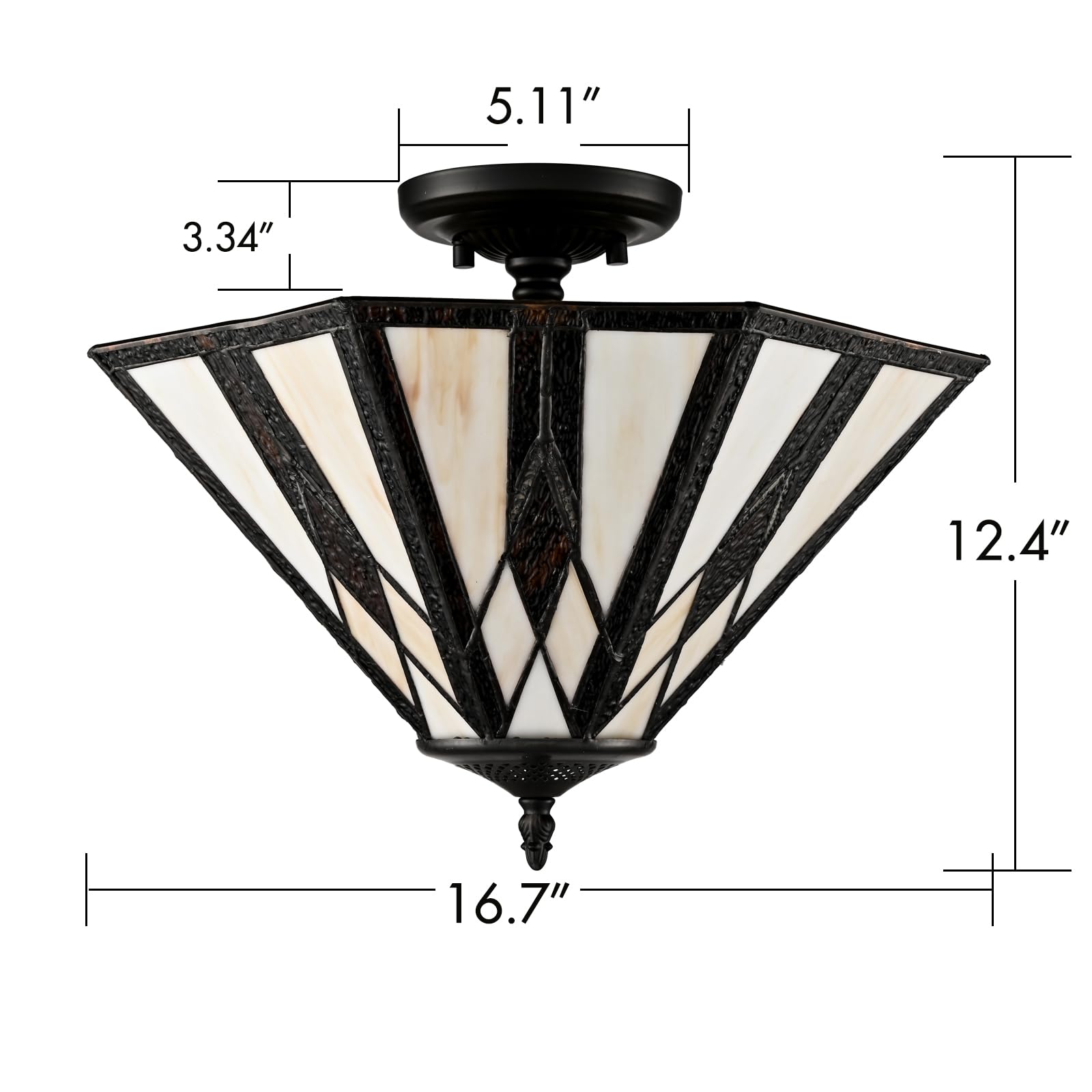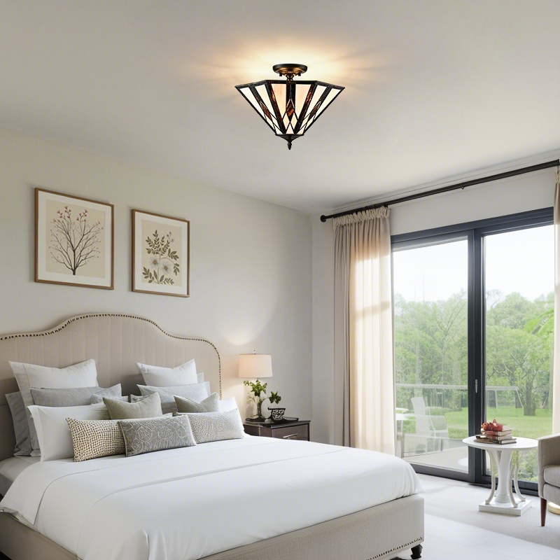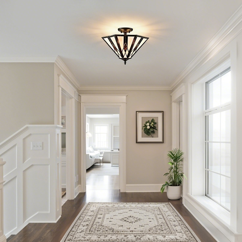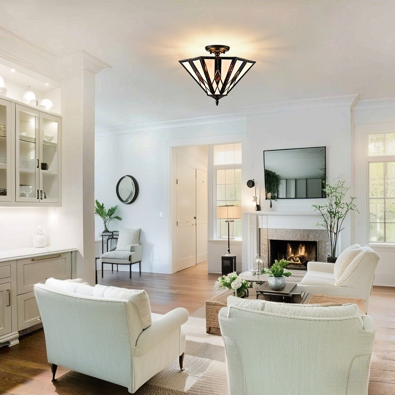 The Tiffany glass ceiling light's canopy, bottom accent, and lamp holders sport a black finish, livening up your interior with a touch of modern sophistication. It contains a number of hand-cut pieces of stained glass, each wrapped in fine copper foil. It is exquisitely crafted using high-quality materials and exceptional workmanship. Incorporating both artistic charm and rich colors, it adds an instant touch of style and drama to any room. It allows the light to gently filter through the stained glass shade and casts intriguing light effects and shades. The dark-colored detailing on the glass shade contrasts with the brisk colors, which enhances the piece's visual depth and beauty even further. Its hexagonal silhouette brings both stunning decorative element and a touch of geometry.