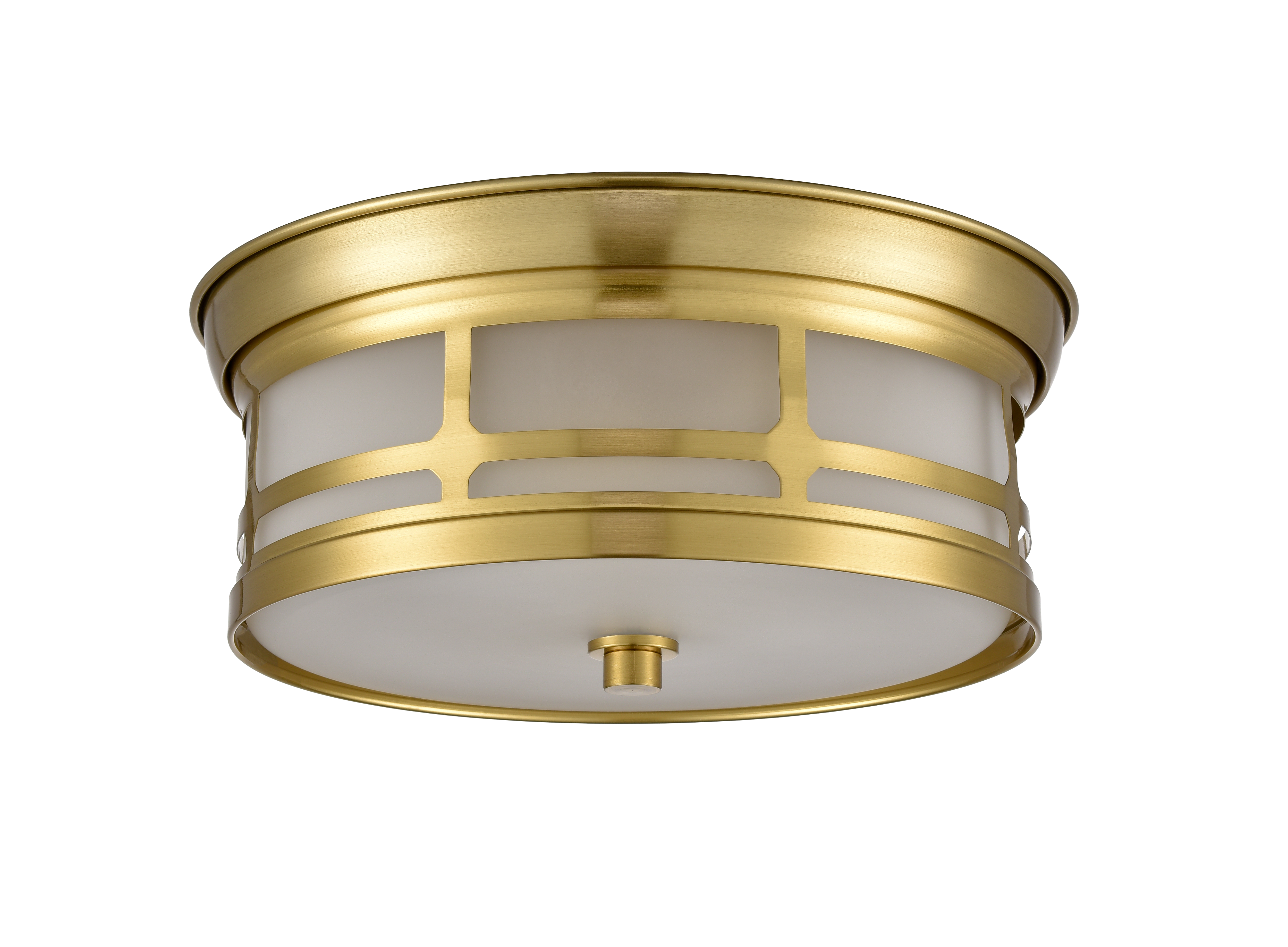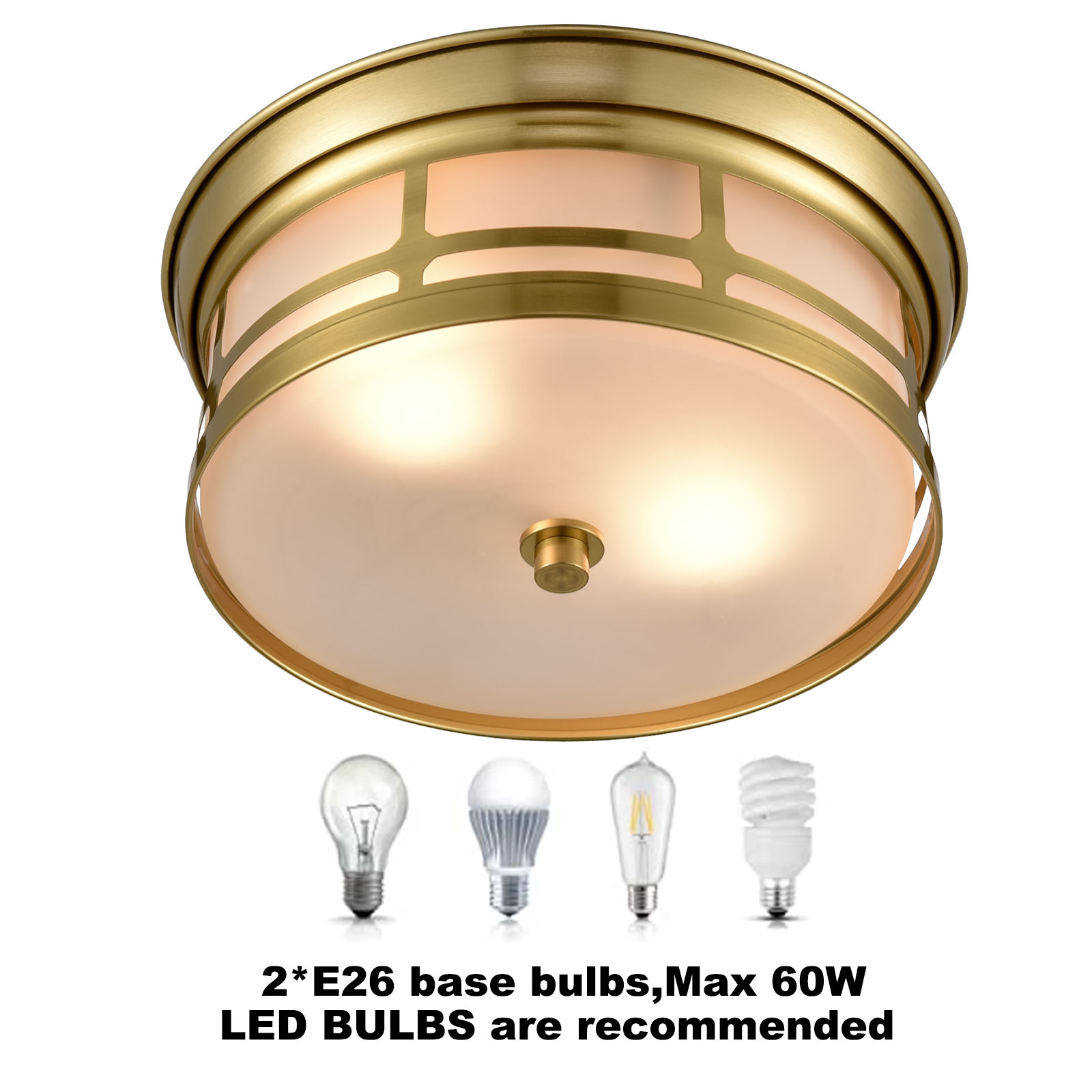 The flush mount ceiling light’s lamp-holders, bottom accent, and rounded metal frame show off a rustproof electrophoretic brass finish, pepping up your home decor with metallic pizzazz. The frosted glass drum shade is protected and held aloft by the rounded metal frame for bringing a rich visual appeal to your interior. The flush mount ceiling light’s handblown glass shade embraces the elegant artistry of nature. The glass shade is exquisitely crafted through a complicated process of manual grinding, polishing, and matte treatment. The lampshade flaunts even light distribution and allows a soft glow to pass right through, filling the space without any glare.