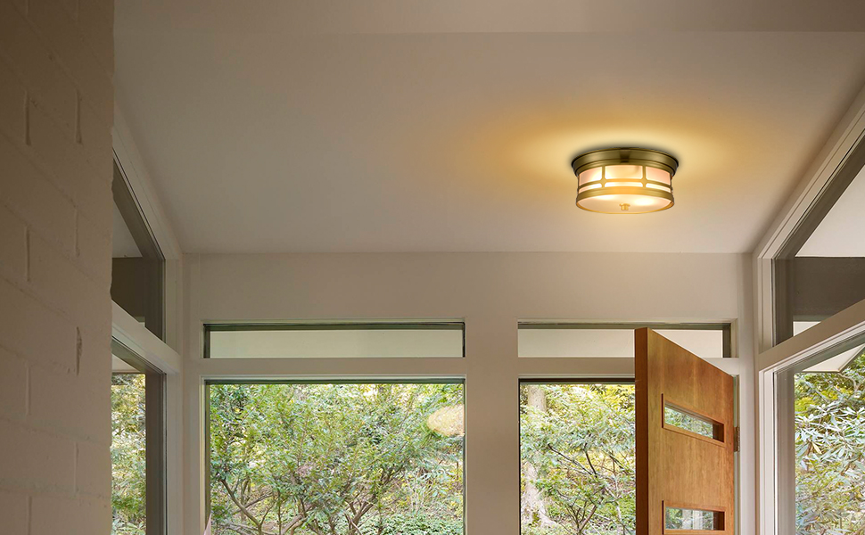 The flush mount ceiling light’s lamp-holders, bottom accent, and rounded metal frame show off a rustproof electrophoretic brass finish, pepping up your home decor with metallic pizzazz. The frosted glass drum shade is protected and held aloft by the rounded metal frame for bringing a rich visual appeal to your interior. The flush mount ceiling light’s handblown glass shade embraces the elegant artistry of nature. The glass shade is exquisitely crafted through a complicated process of manual grinding, polishing, and matte treatment. The lampshade flaunts even light distribution and allows a soft glow to pass right through, filling the space without any glare.