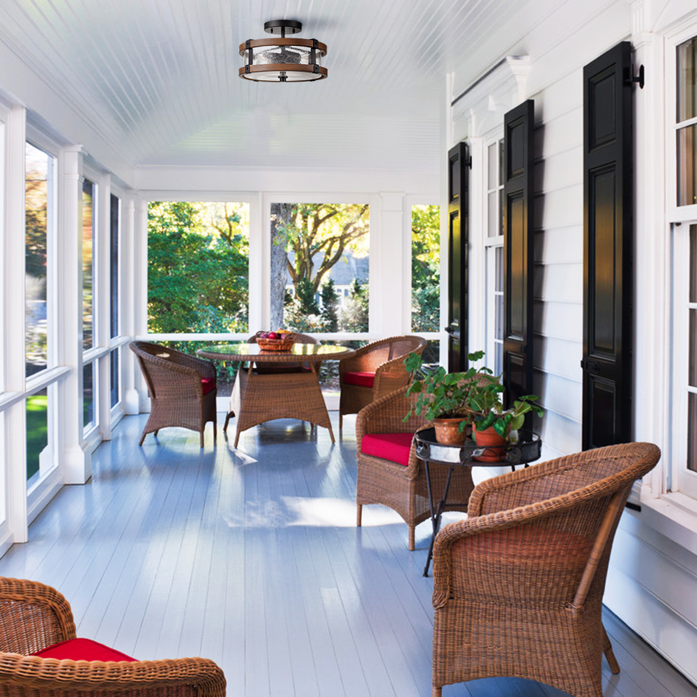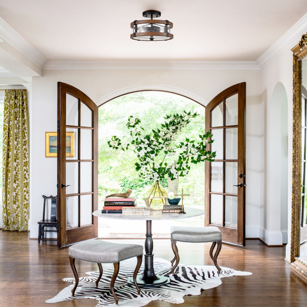 The black metal semi flush mount ceiling light’s canopy, bottom accent, metal frame, and lamp holders flaunt a semigloss black finish. The round metal bars that encircle the seeded glass panel are coated with a tawny faux wood finish, conveying a hint of rusticity to your living space. The ceiling light is held aloft by the metal frame to bring a rich visual appeal. It is a perfect fixture to transform your bathroom, bedroom, entryway, foyer, hallway, kitchen, living room, porch, patio, balcony, front door, entryway, and corridor.