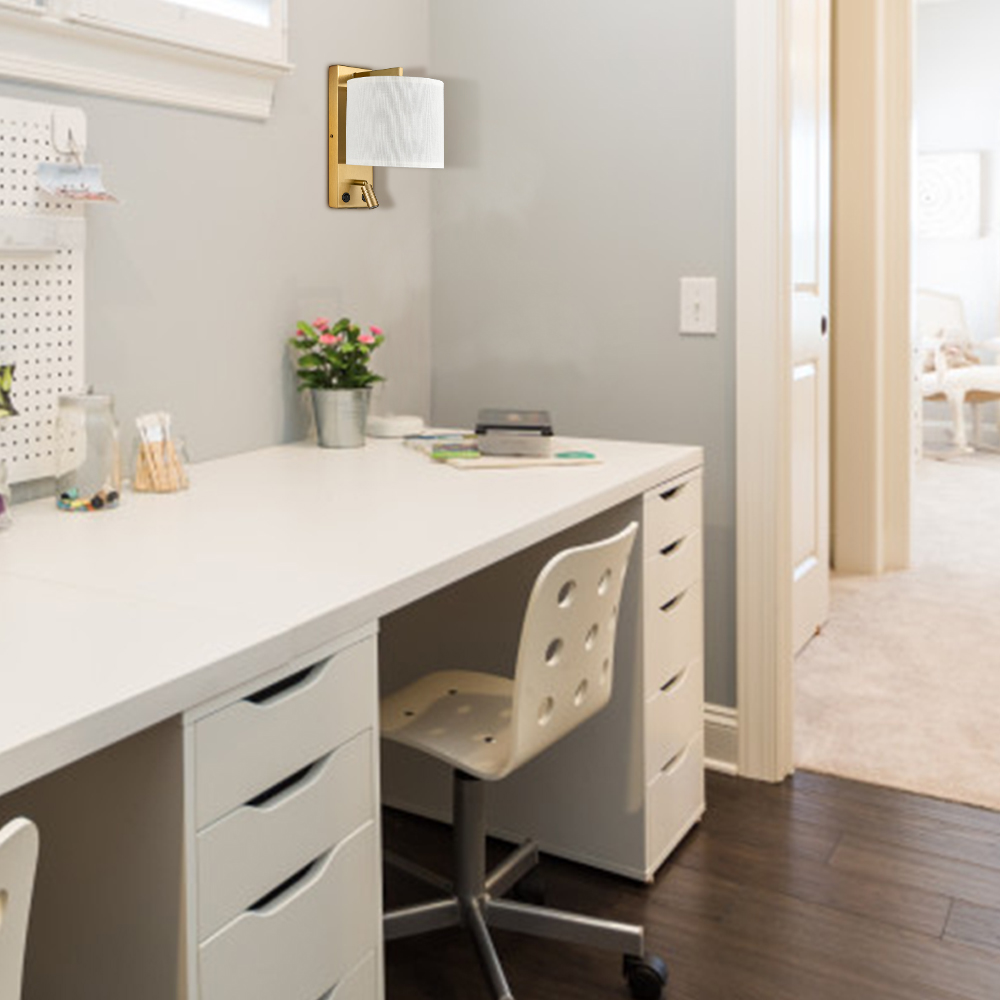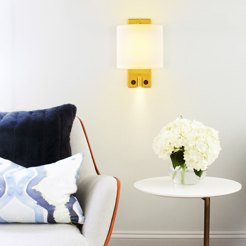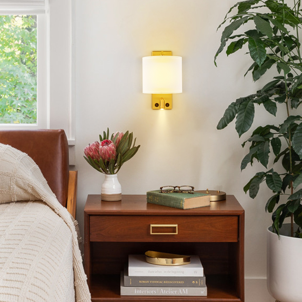 Boasting an electrophoretic brass finish, the bedside wall lamps pep up the living space with a touch of glitz. Their white cylinder linen lampshades cast an enchanting aura of elegance and make for a tasteful statement in your aesthetic.Featuring 80 CRI, 4000K color temperature, and 130LM, the 1.5W LED night light on the canopy is flicker-free and is able to serve as a light source for reading, photo shooting, and drawing focus to artwork.