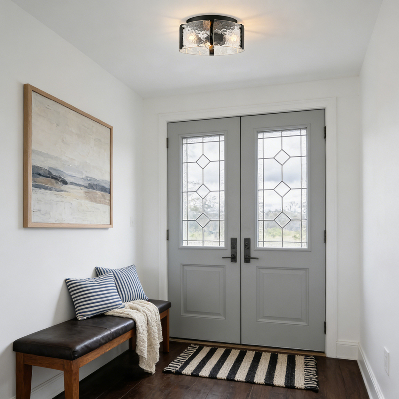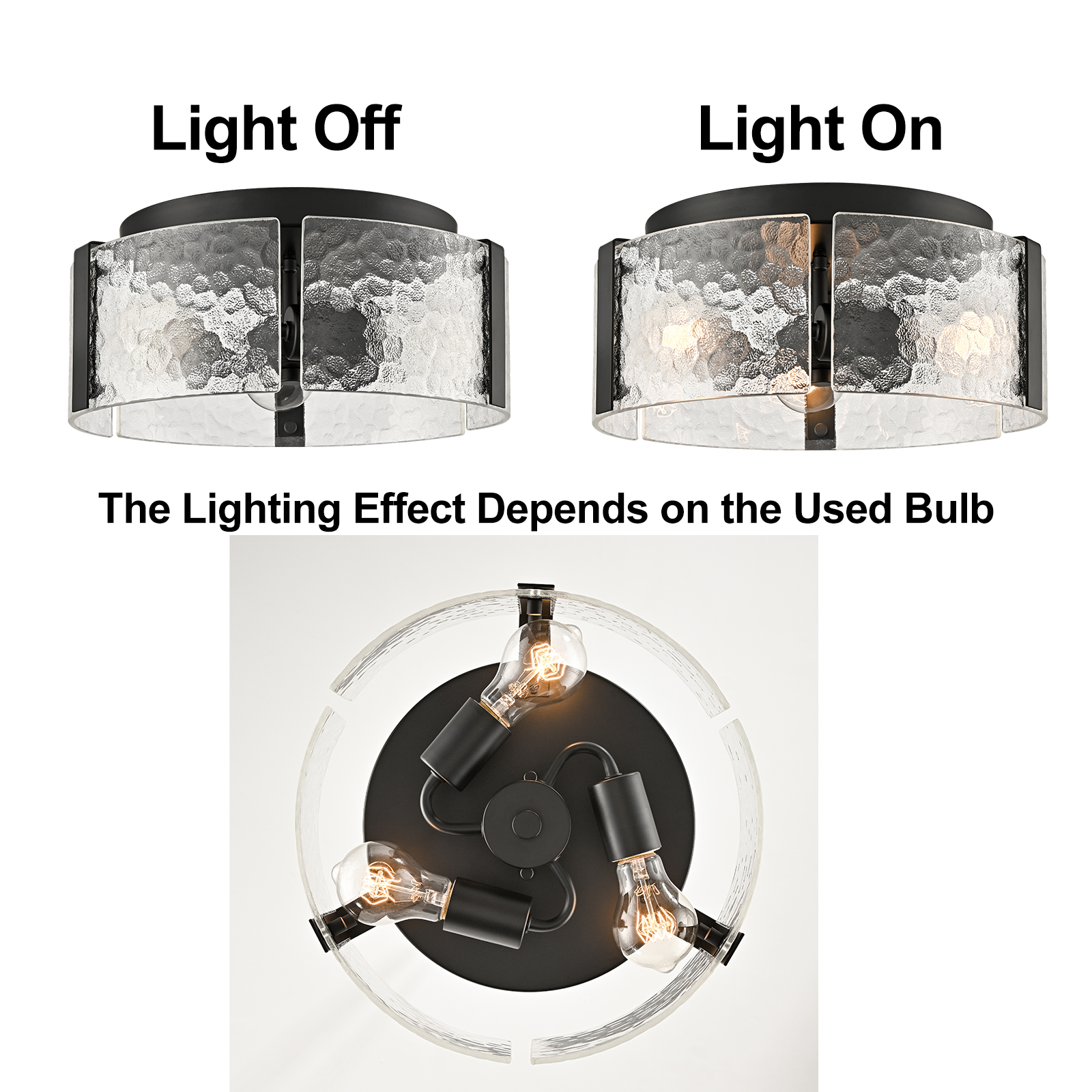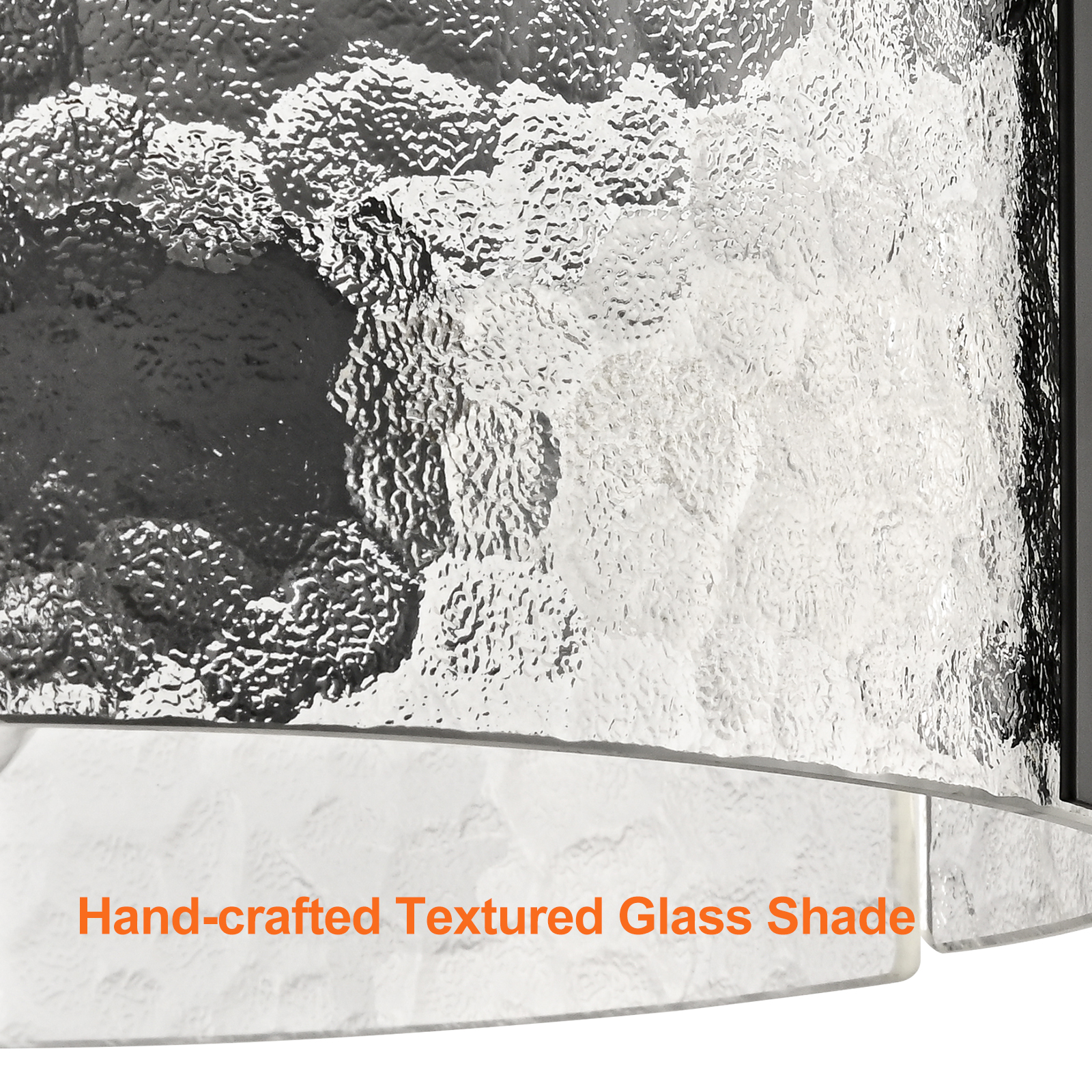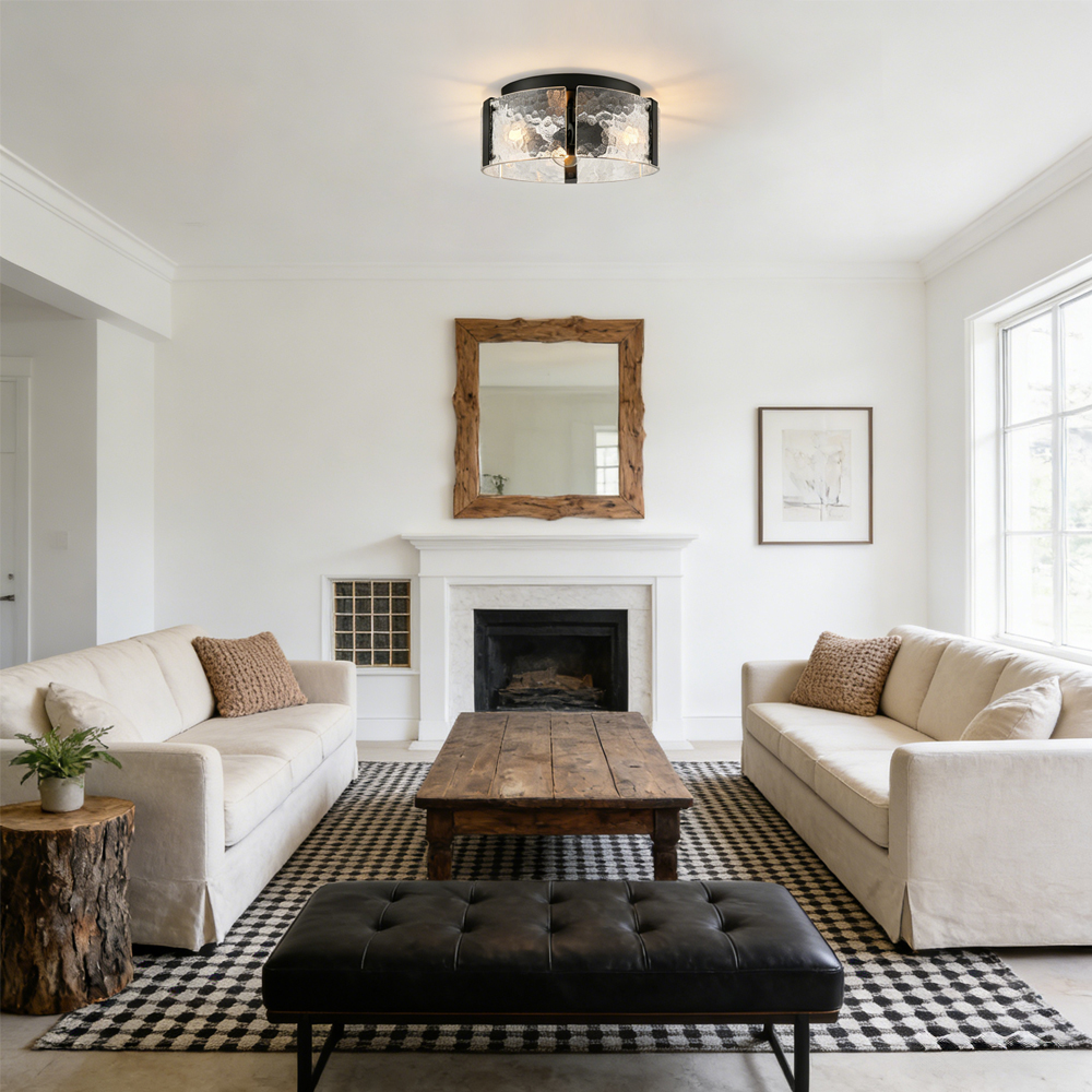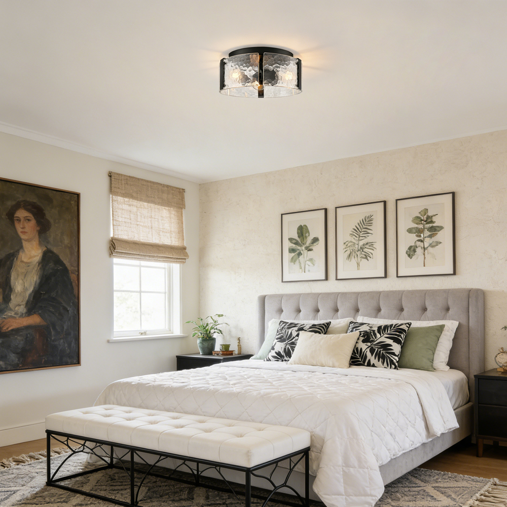The farmhouse ceiling light fixture brings a touch of modern sophistication to your living space with a semigloss black finish. Crafted of impurity-free hand-blown textured glass, its textured glass drum shade gives your living space a glamorous touch and an artistic charm. Its glass drum shade is held aloft by the three-pronged metal frame, adding rich visual interest to your interior. Its black finish and textured glass shade draw the eye upward to a beautiful display of glass and metal suspended above. With its black finish standing out against the glass drum shade, the light fixture is a guaranteed showstopper in the interior.