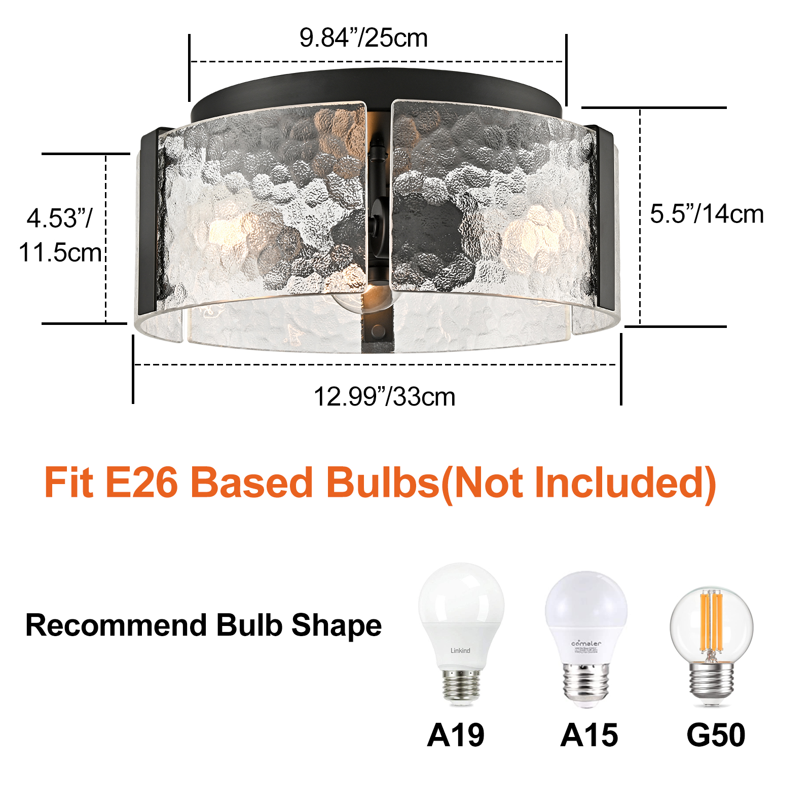 The ceiling light comes with 3 E26-base sockets which are compatible with a variety of bulb types: LED, INCANDESCENT, CFL.
