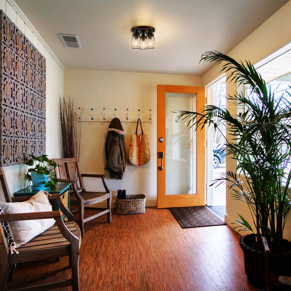 Finished in antique gold with a black tinge, the mason jar ceiling light perks up your living space with a boost of sparkle. Three clear glass mason jars of the same size are suspended at the same hanging heights from a solid metal canopy, which resembles the look of Aeolian bells. It makes a farmhouse statement in your aesthetic and adds an element of surprise and whimsy. The mason jar glass shades contrast the glimmering finish and add alluring visual interest to the living area.