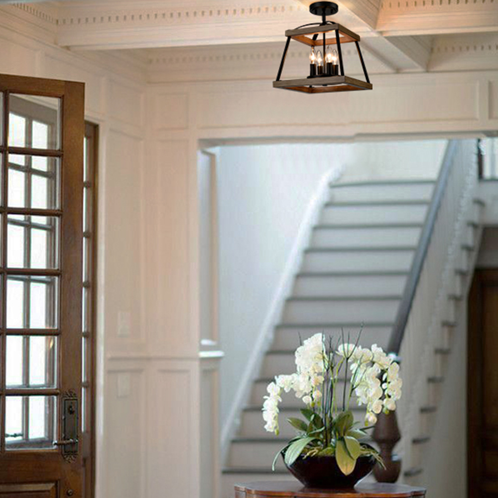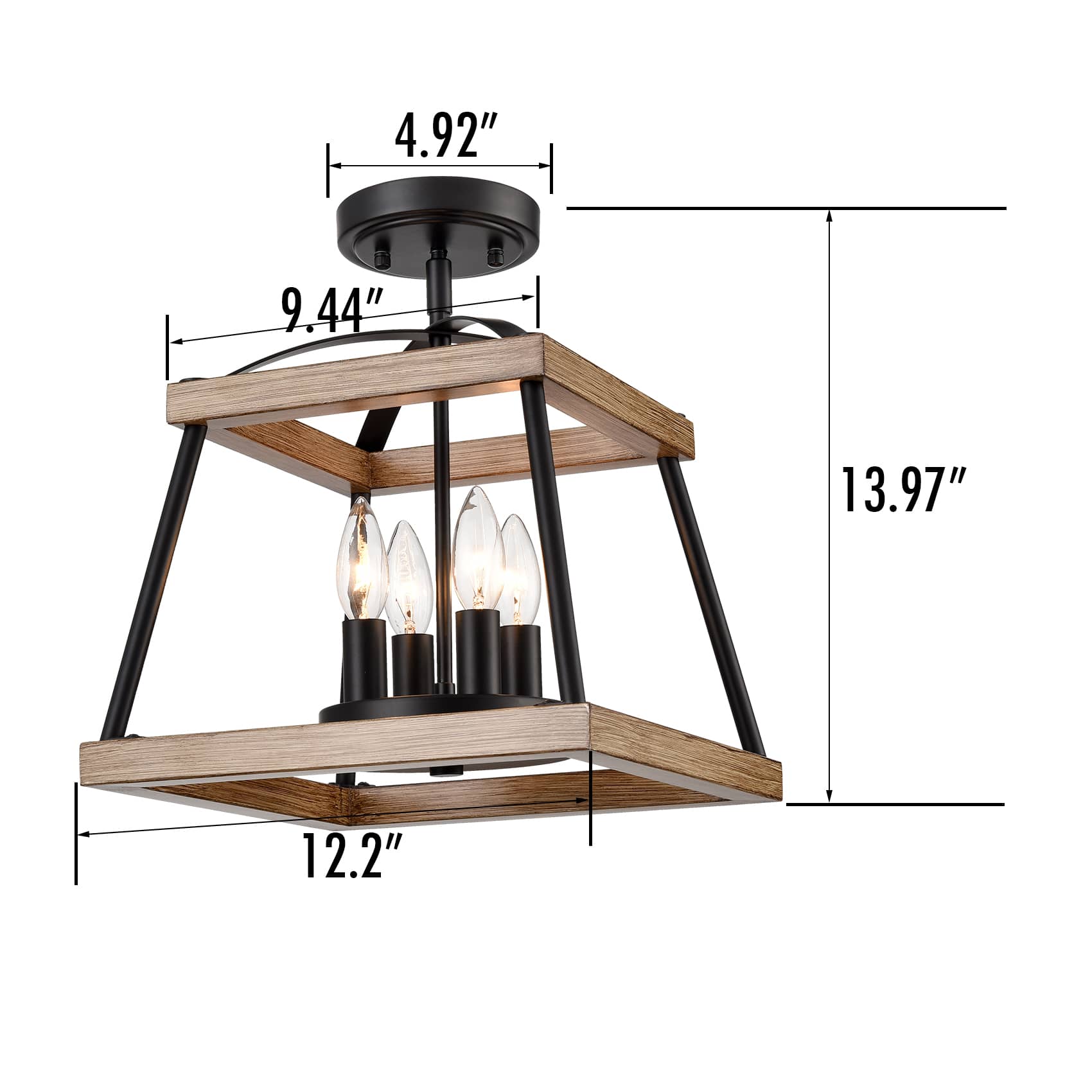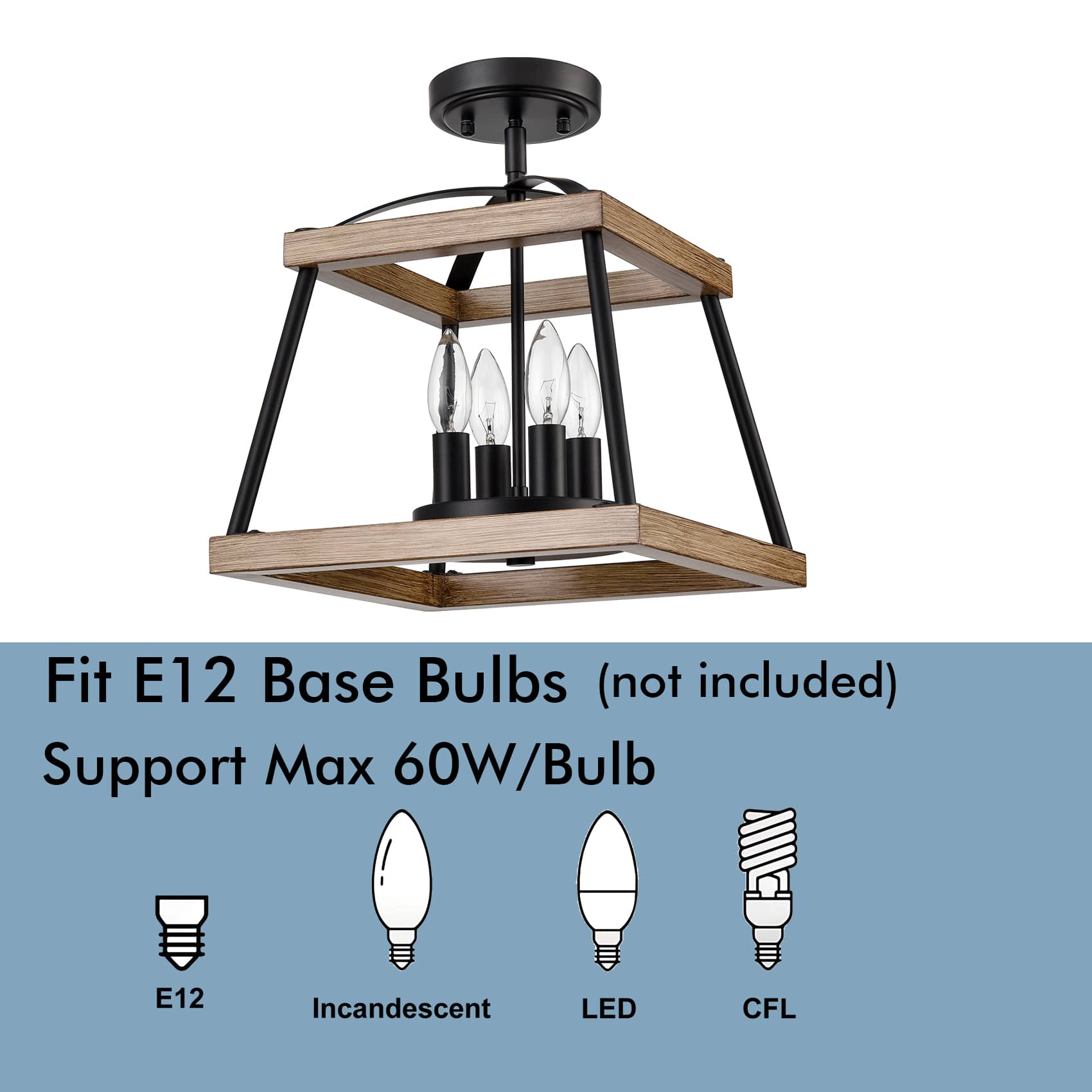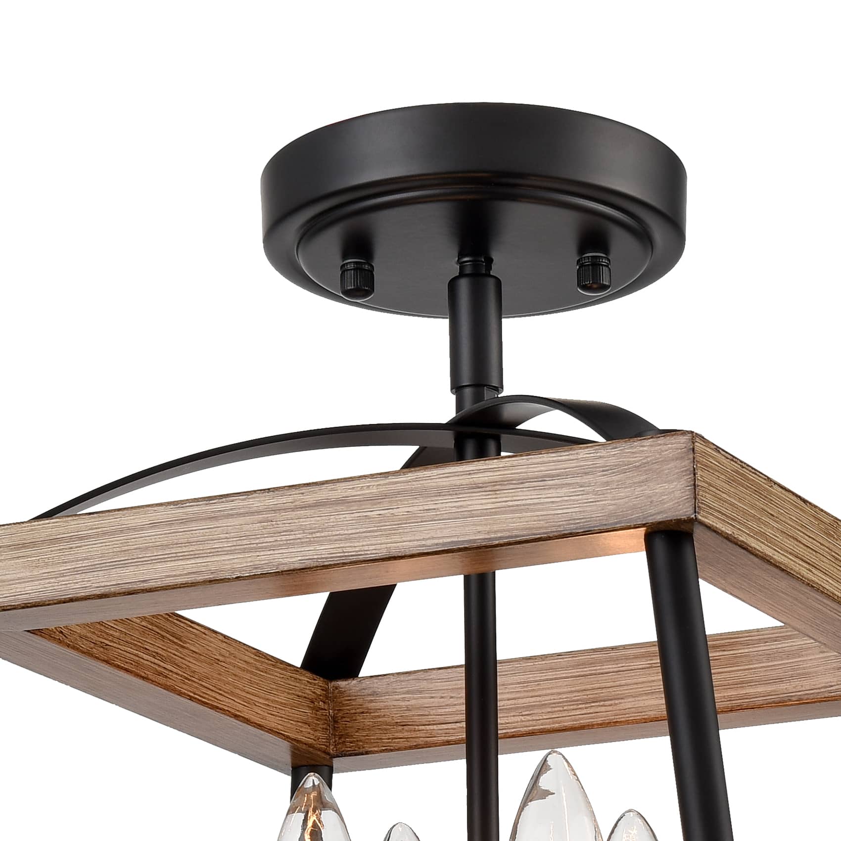 The farmhouse semi flush mount ceiling light’s canopy, hanging rod, lamp holders, curved metal slats on top of the lamp body, and four vertical bars composing the cage flaunt a black finish while the square frames on the top and bottom of the cage sport a beige brown wood grain finish. Its open cage is designed to house four candelabra-inspired lamp holders pointing upward. The cage is topped with two curved metal slats, generating a dramatic look that will impress. Its beautiful dual finish encompasses both nature-inspired qualities and a hint of rusticity, yet maintains an industrial edge.
