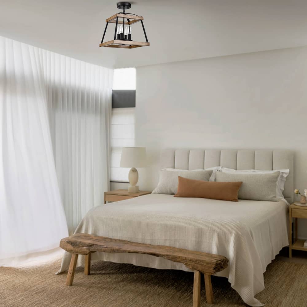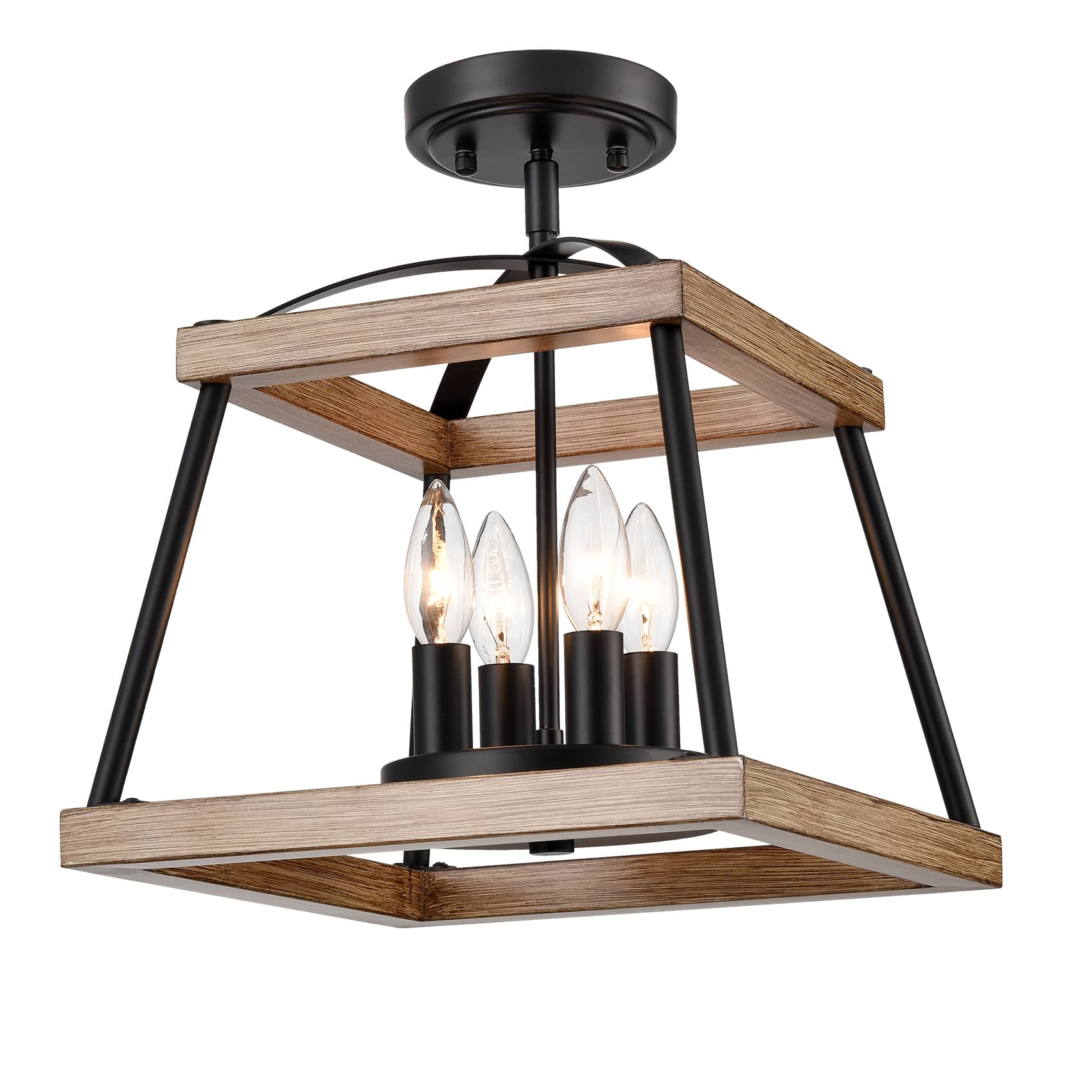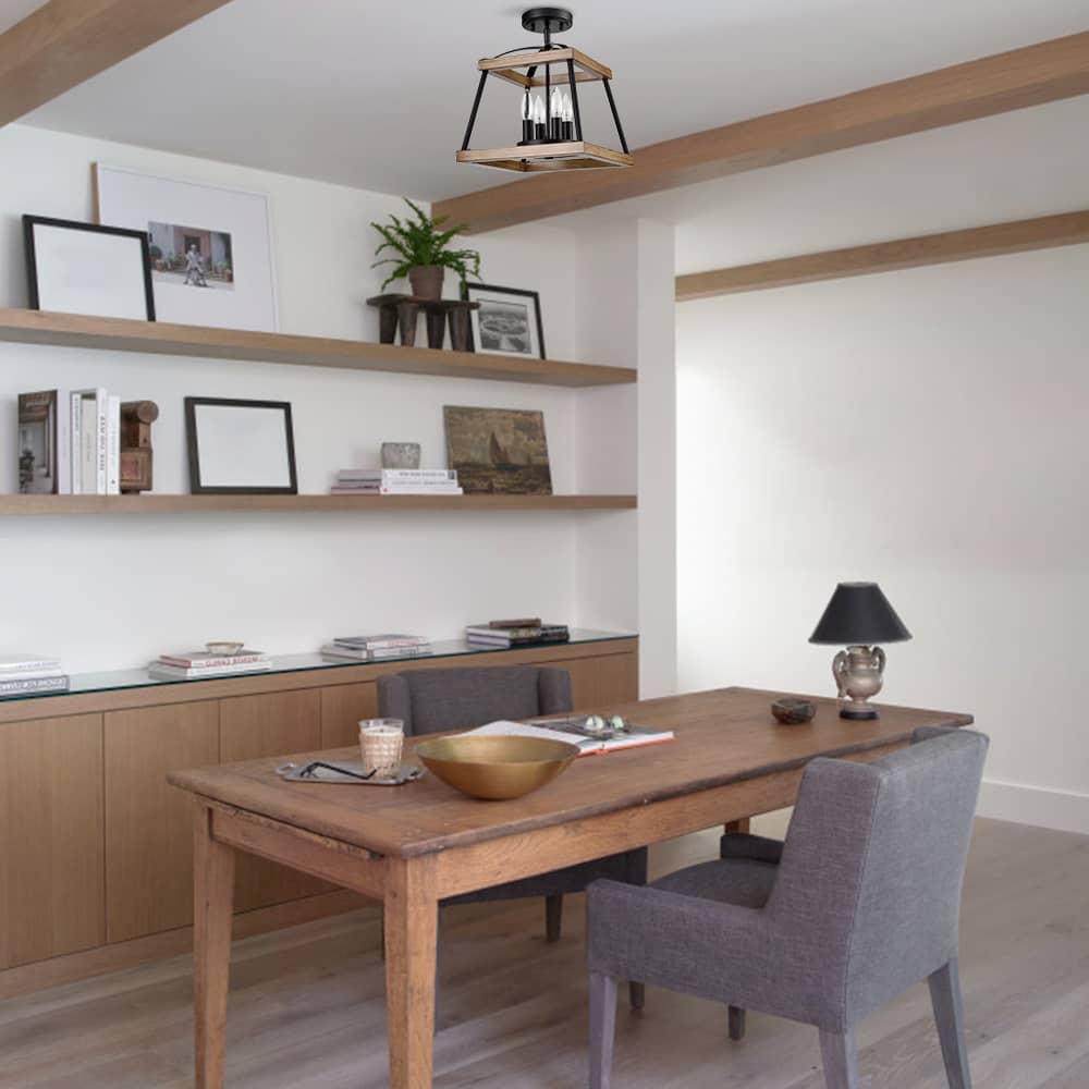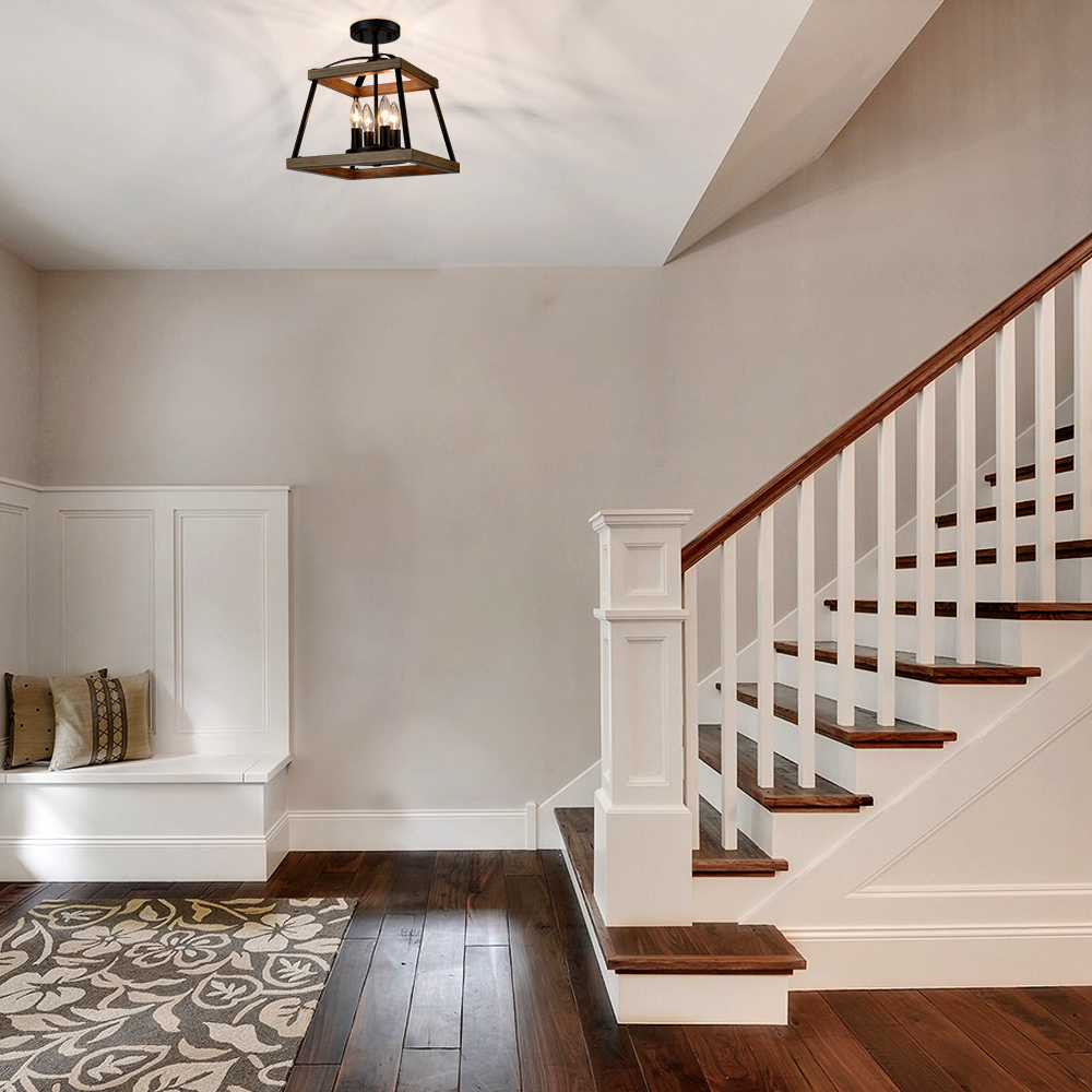 The farmhouse semi flush mount ceiling light’s canopy, hanging rod, lamp holders, curved metal slats on top of the lamp body, and four vertical bars composing the cage flaunt a black finish while the square frames on the top and bottom of the cage sport a beige brown wood grain finish. Its open cage is designed to house four candelabra-inspired lamp holders pointing upward. The cage is topped with two curved metal slats, generating a dramatic look that will impress. Its beautiful dual finish encompasses both nature-inspired qualities and a hint of rusticity, yet maintains an industrial edge.