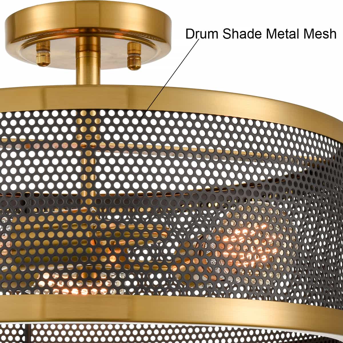 The semi flush mount ceiling light’s canopy, rod, lamp-holders, arms, and the rim of drum shade are fashioned with a dazzling brass finish, imparting a bit of metallic pizzazz to your interior. Dressed in a semi-gloss black finish, its open drum shade sports a metal mesh accent, adding a factory-inspired touch to your decor scheme.