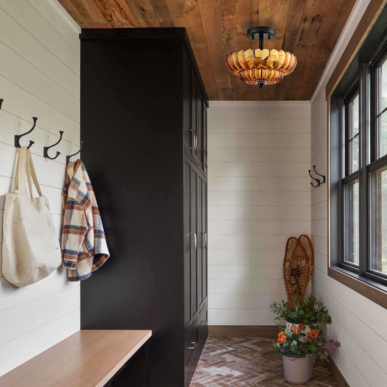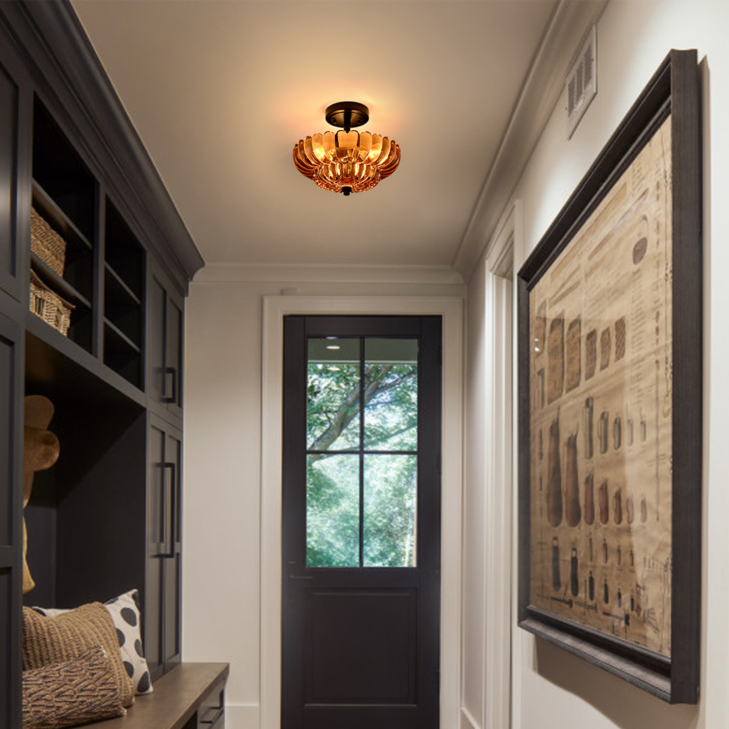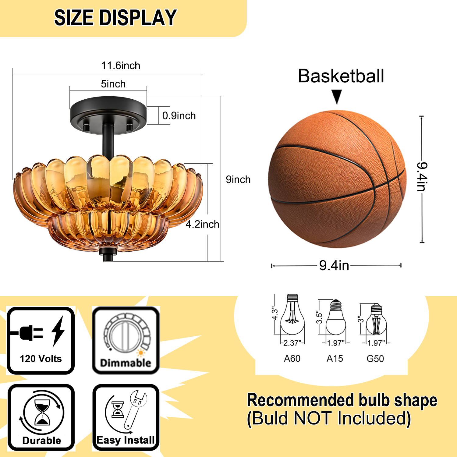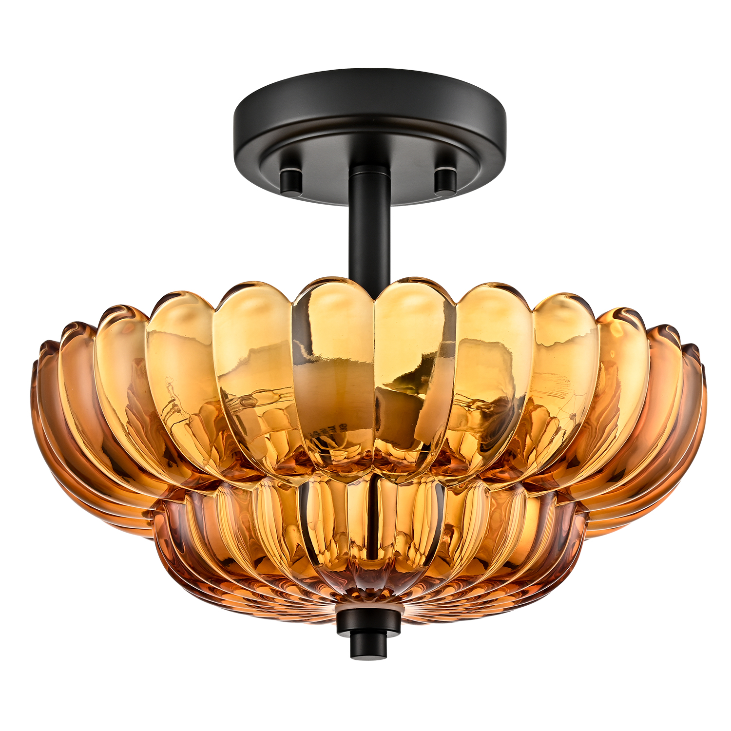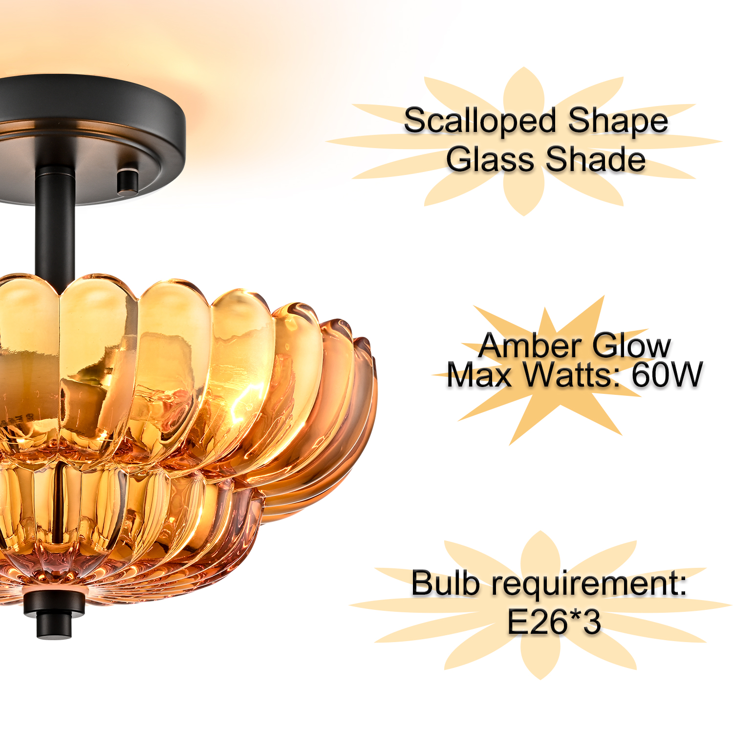 The modern black semi flush mount ceiling light boasts a semigloss black finish, livening up your interior with a dash of drama. The light fixture’s layered scalloped amber glass shade gives your living space a dose of whimsy and an artistic charm. With the semigloss black finish standing out against the amber glass shade, it is a guaranteed showstopper in your living space. It allows the light to gently filter through the amber glass shade and casts intricate shadows. It adds depth and character to the space, creating an alluring eye appeal.