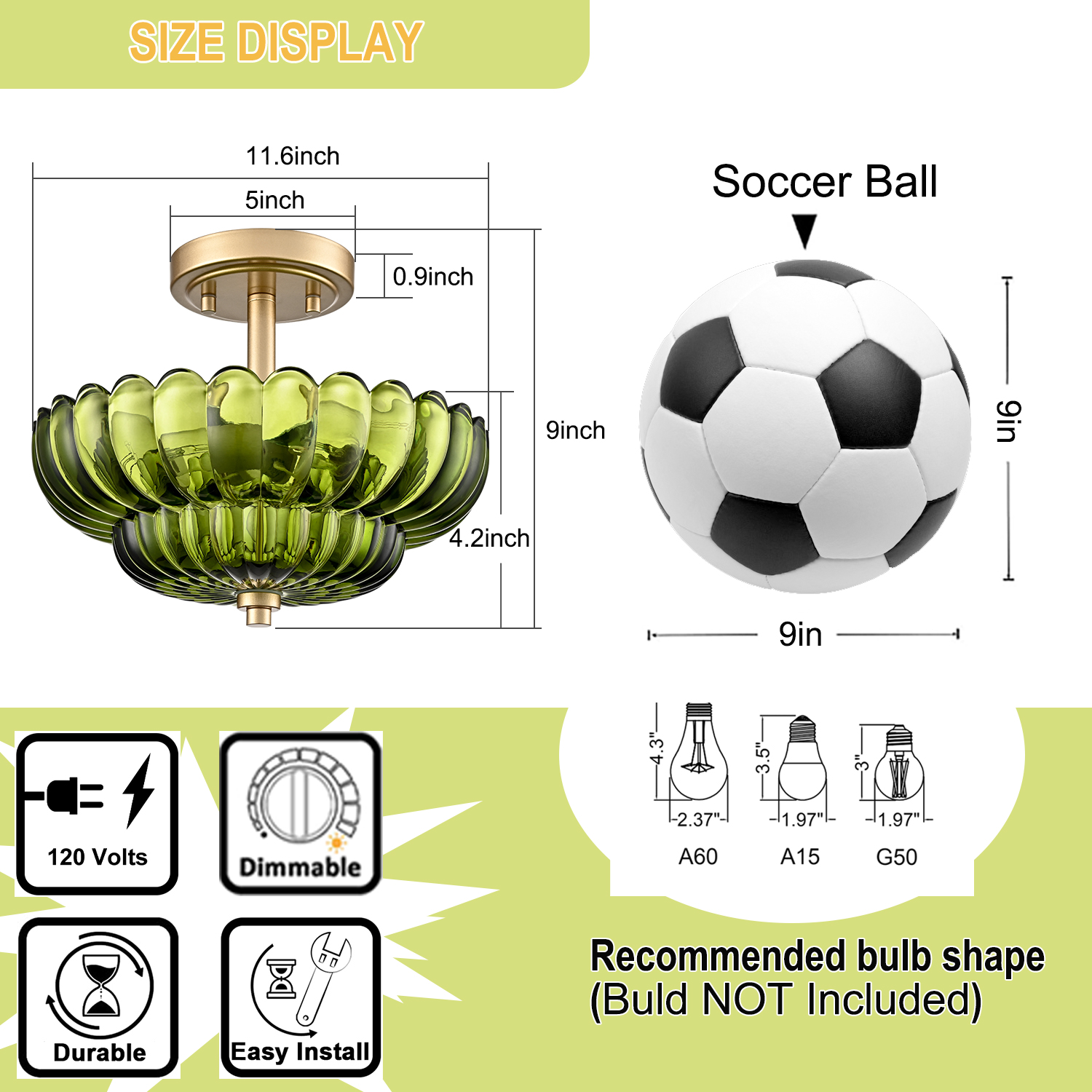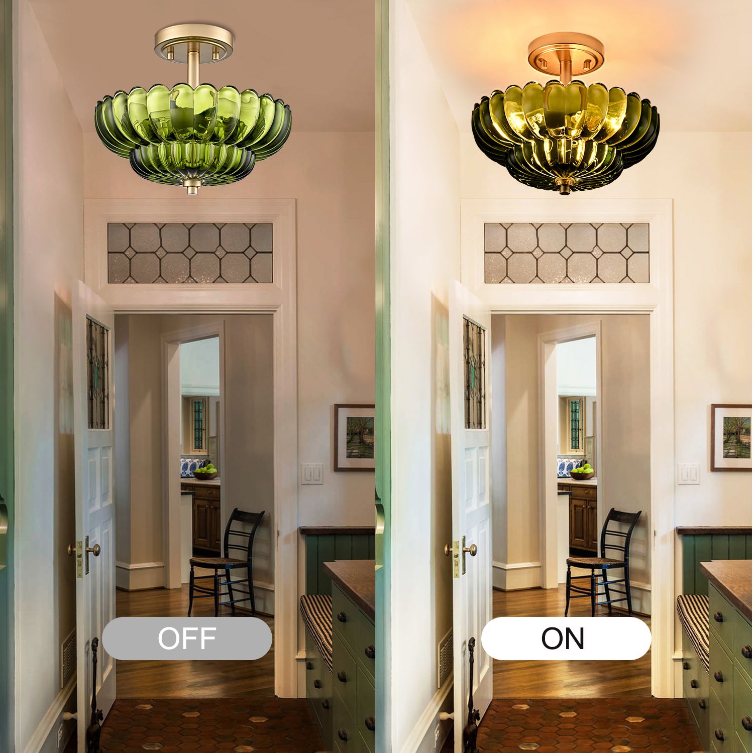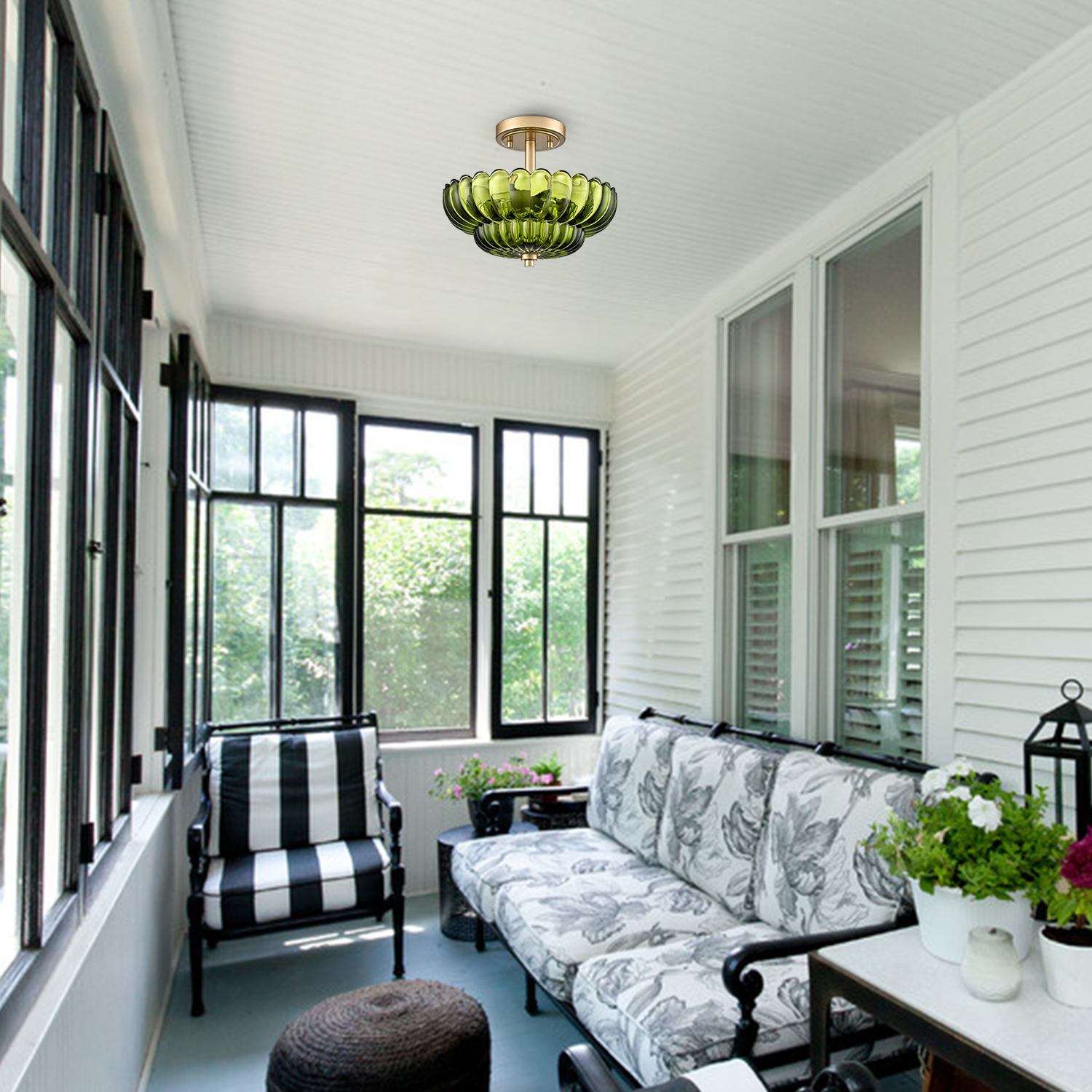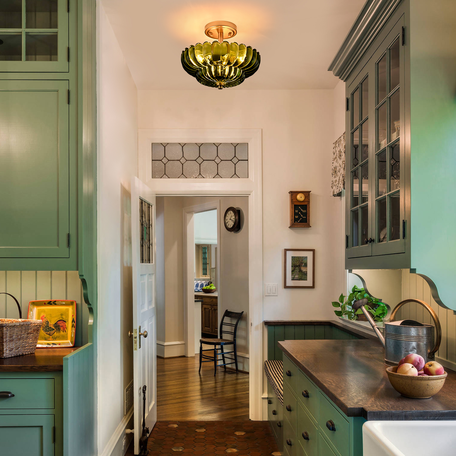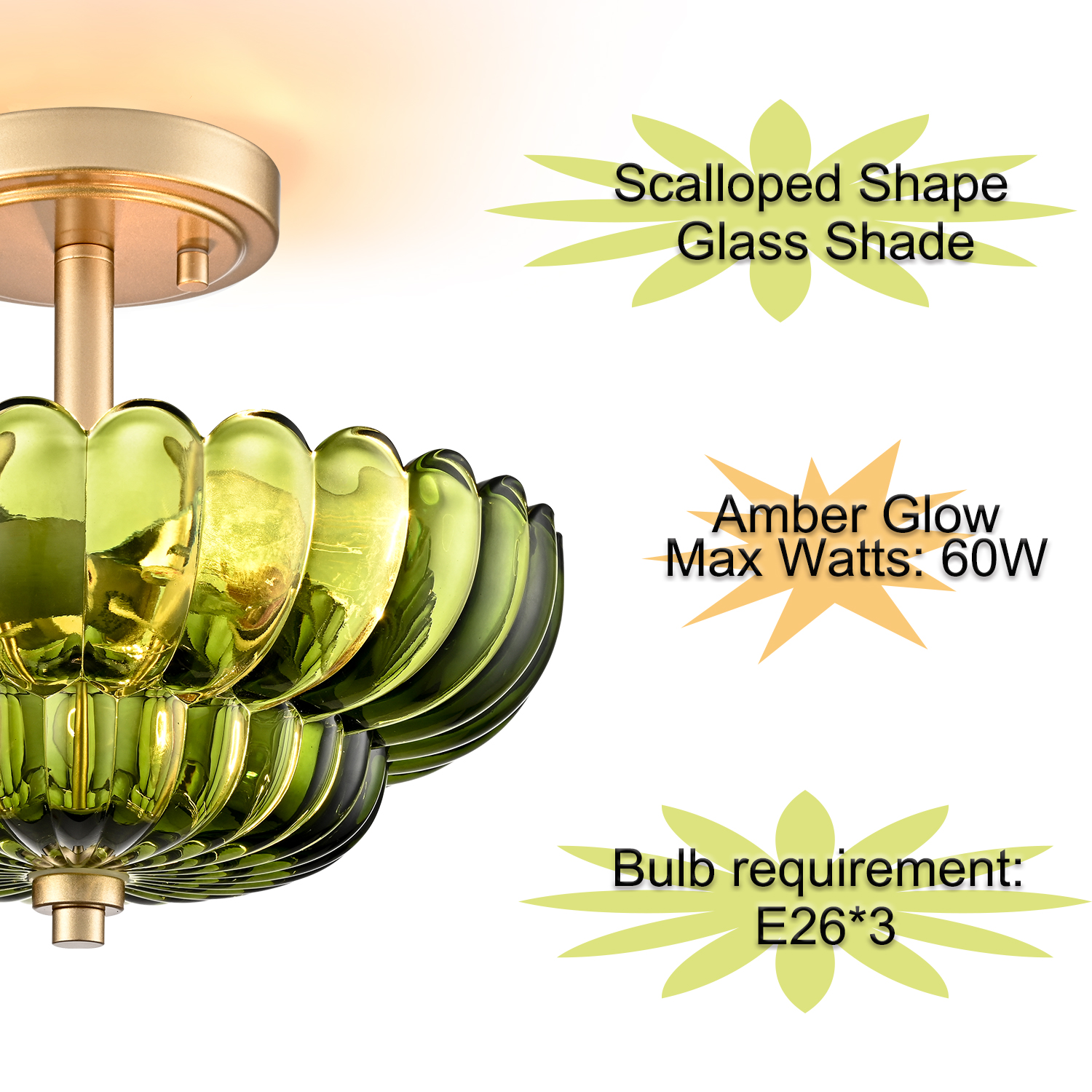 The modern gold semi flush mount ceiling light flaunts a lustrous gold finish, pepping up your interior with a glint of glamour. The light fixture’s layered scalloped green glass shade gives your living space a dose of whimsy and artistic charm. With the gold finish standing out against the green glass shade, it is a guaranteed showstopper in your living space. It allows the light to gently filter through the green glass shade and casts intricate shadows. Its green glass shade gives your living space a snappy look and a glamorous, refreshing vibe.