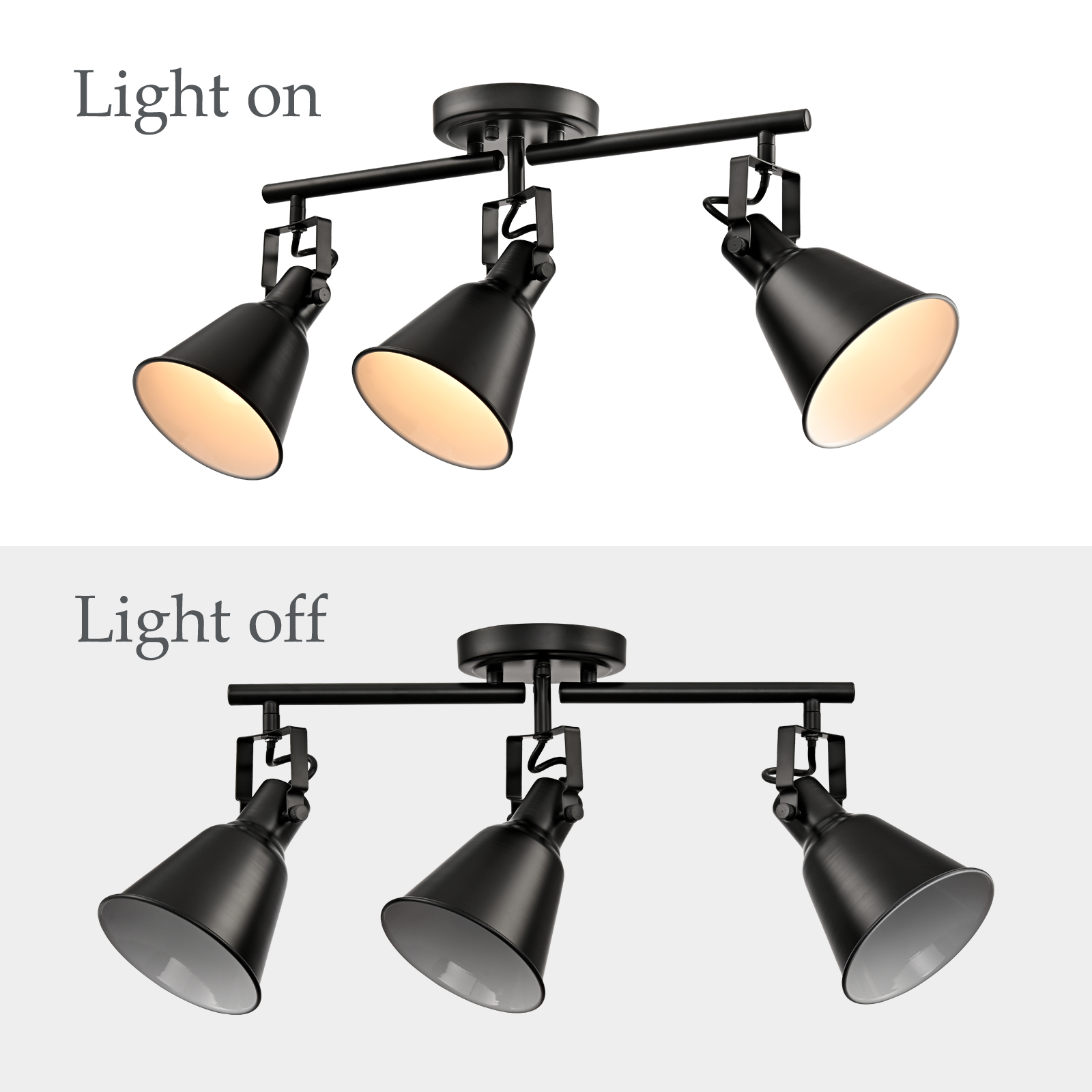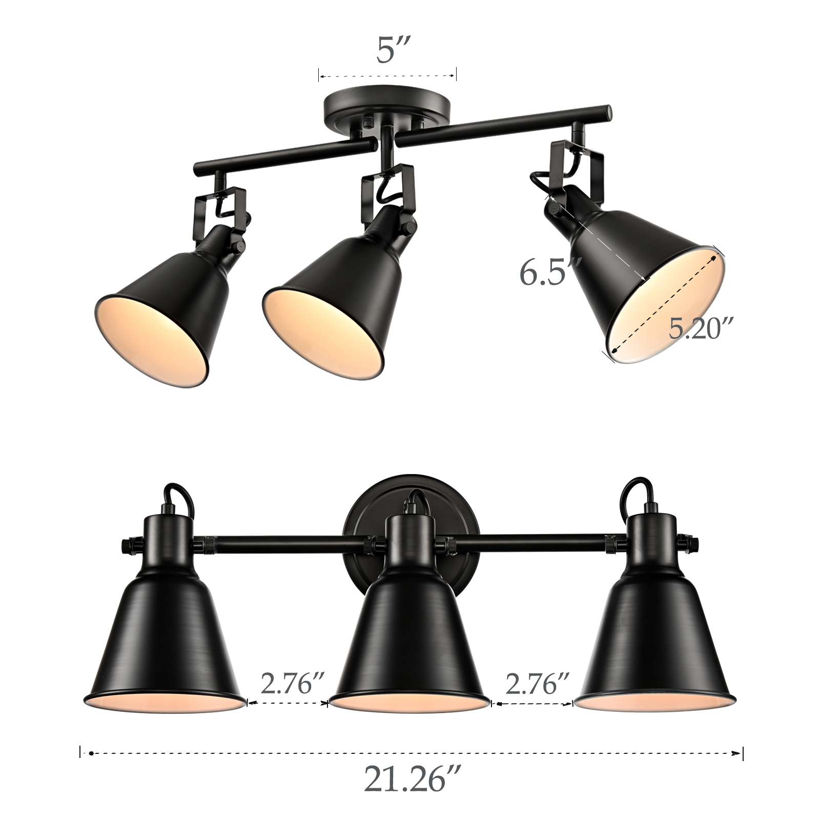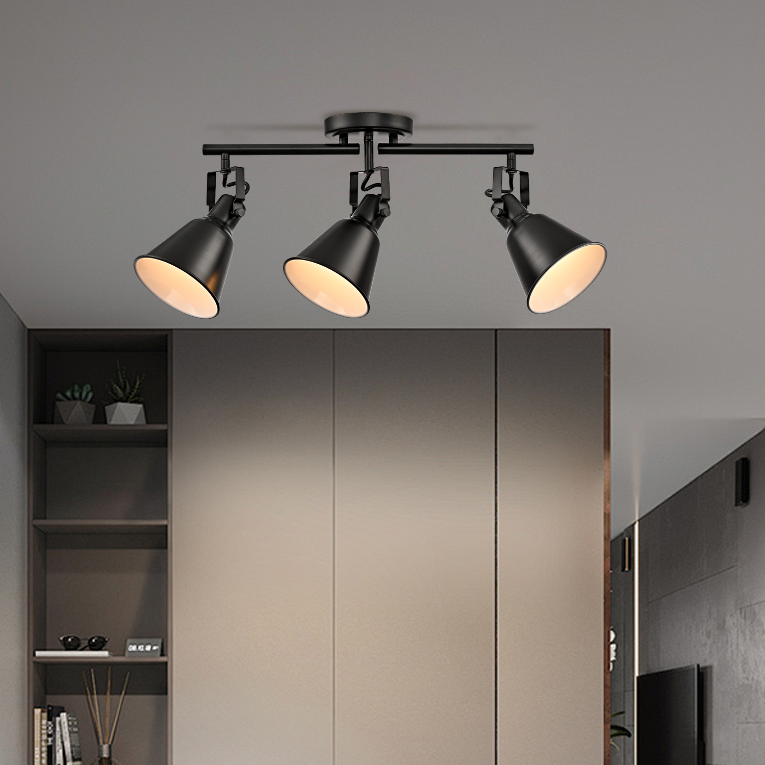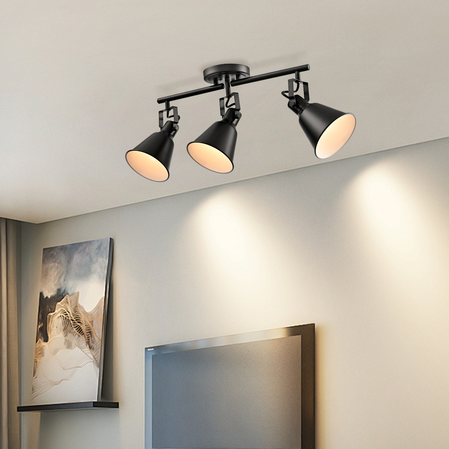 Crafted with solid metal, the ceiling track lighting's lampshades, arm, and canopy boast a rustproof matte black finish on the outer surface while it flaunts a white finish on the inner surface. The white interior of the lampshades helps reflect the light. A mix of finishes encompasses both modern qualities and classic elements, yet maintains an industrial edge. It boasts a minimalist but edgy look with 3 cone shades attached to a matching canopy for a clean and cohesive look. The lampshades’ of ceiling track lighting can be adjusted to direct light where it is needed most. It can either be mounted to ceilings or walls.