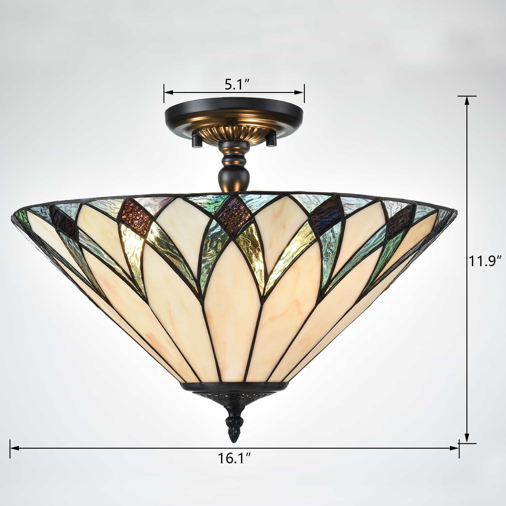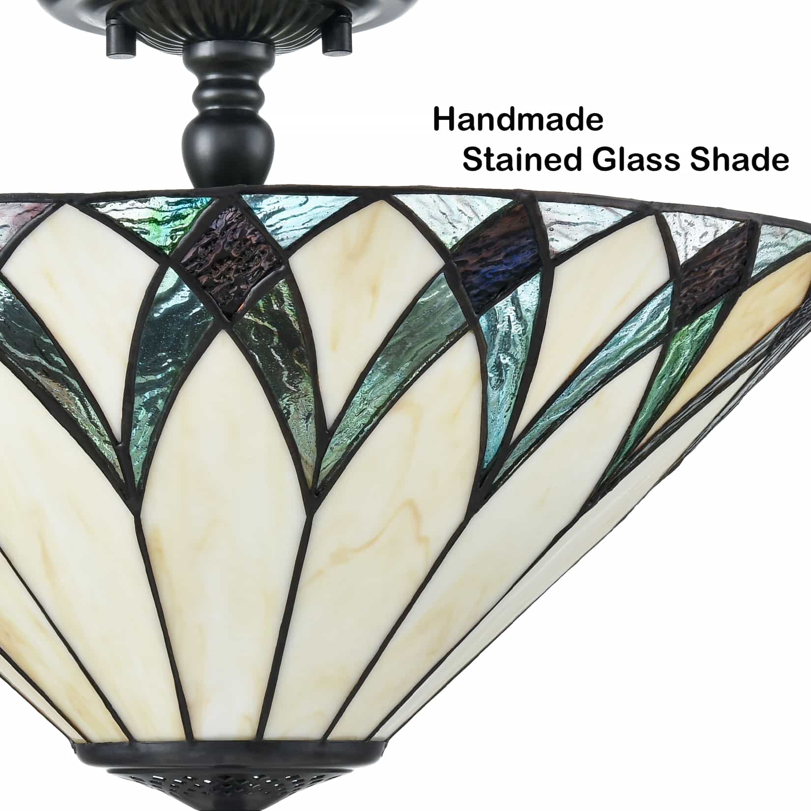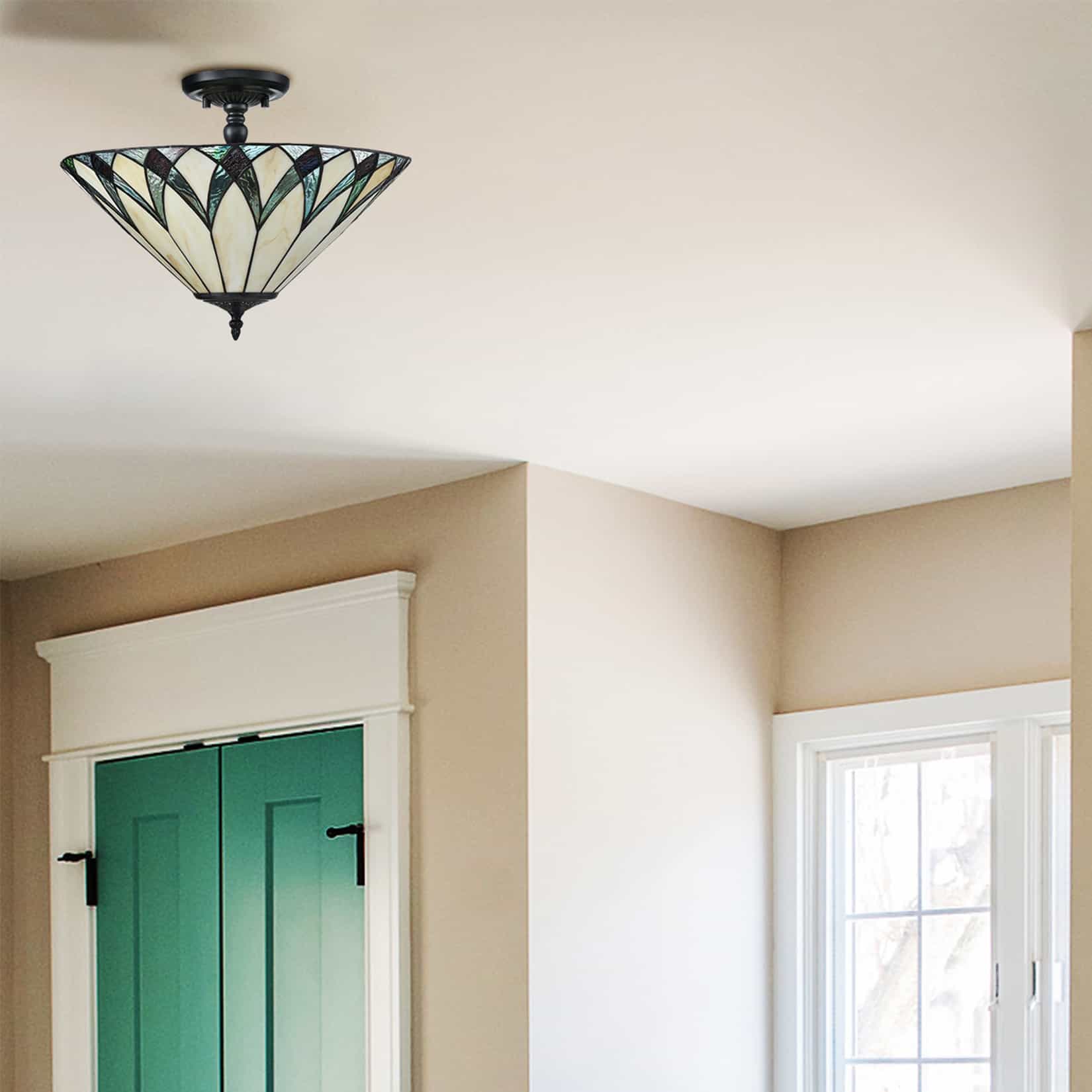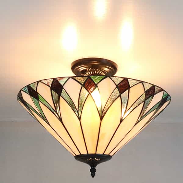 The glass semi flush mount ceiling light's canopy, bottom accent, and lamp holders sport a black finish, livening up your interior with a touch of modern sophistication. It contains a number of hand-cut pieces of stained glass, each wrapped in fine copper foil. It is exquisitely crafted using high-quality materials and exceptional workmanship. Incorporating both artistic charm and rich colors, it adds an instant touch of style and drama to any room. It allows the light to gently filter through the stained glass shade and casts intriguing light effects and shades. The dark-colored detailing on the glass shade contrasts the brisk colors, which enhances the piece's visual depth and beauty even further. Its conic silhouette brings both stunning decorative elements and a touch of geometry.