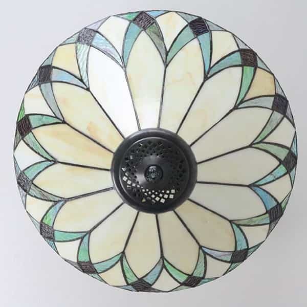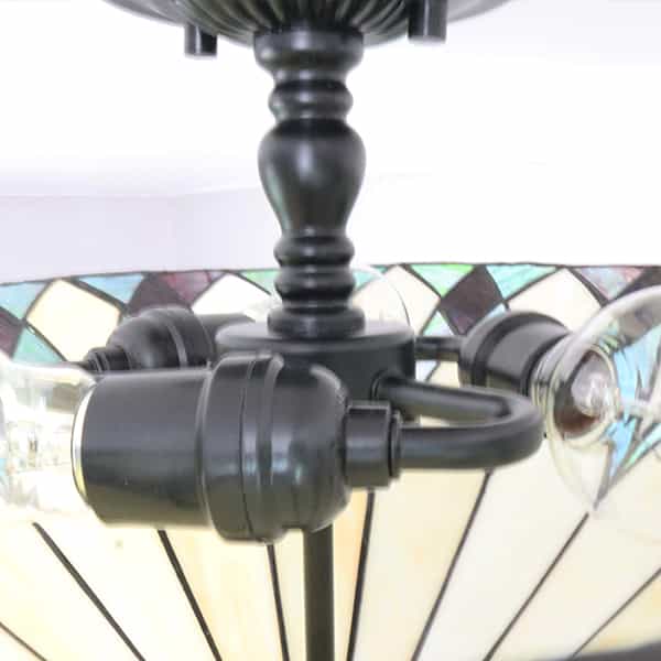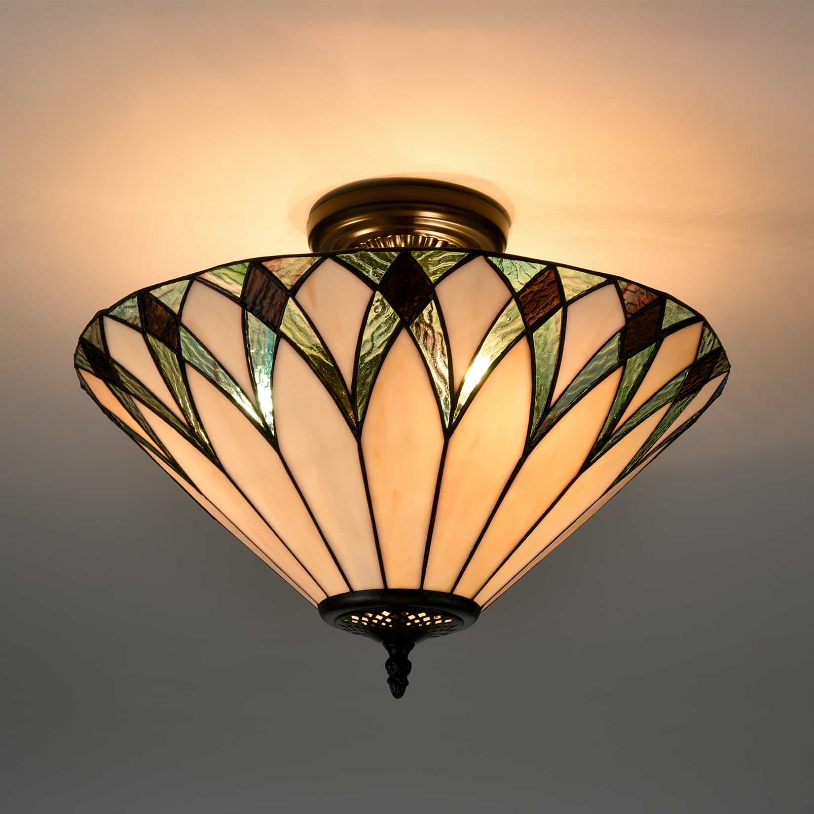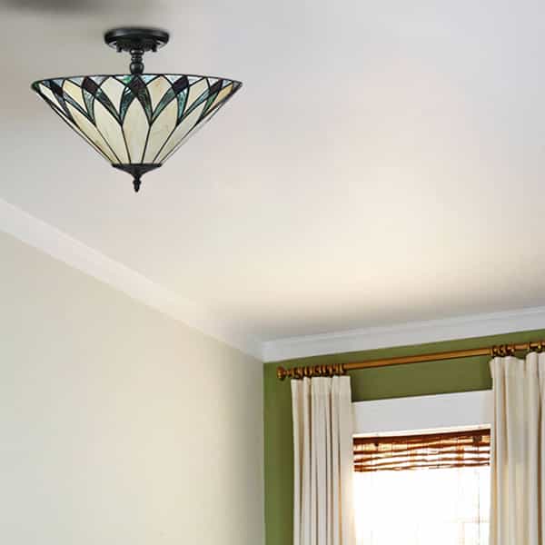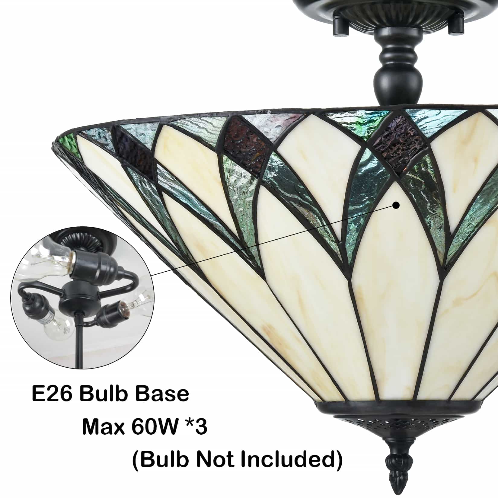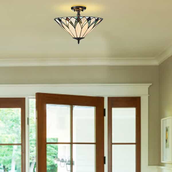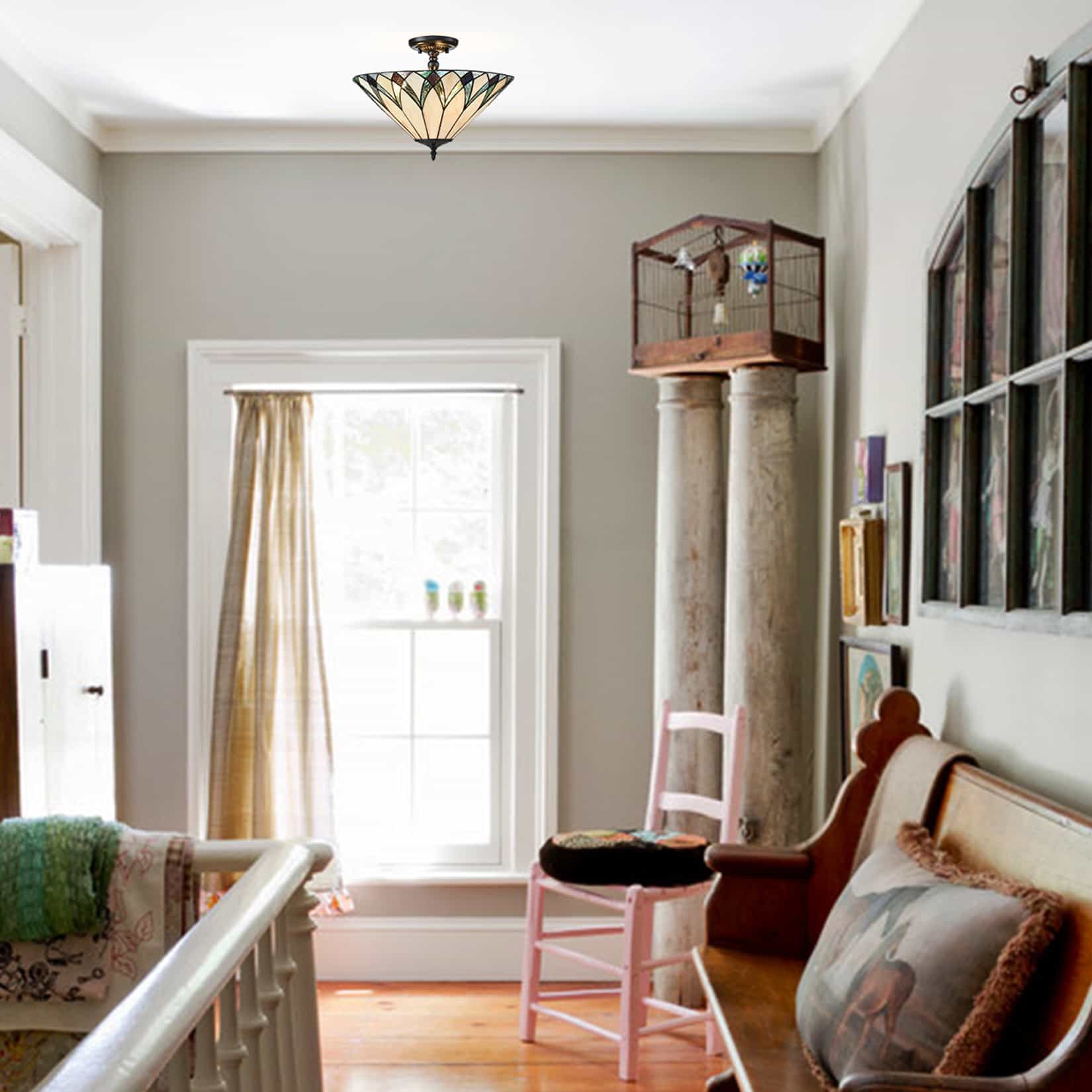 The glass semi flush mount ceiling light's canopy, bottom accent, and lamp holders sport a black finish, livening up your interior with a touch of modern sophistication. It contains a number of hand-cut pieces of stained glass, each wrapped in fine copper foil. It is exquisitely crafted using high-quality materials and exceptional workmanship. Incorporating both artistic charm and rich colors, it adds an instant touch of style and drama to any room. It allows the light to gently filter through the stained glass shade and casts intriguing light effects and shades. The dark-colored detailing on the glass shade contrasts the brisk colors, which enhances the piece's visual depth and beauty even further. Its conic silhouette brings both stunning decorative elements and a touch of geometry.