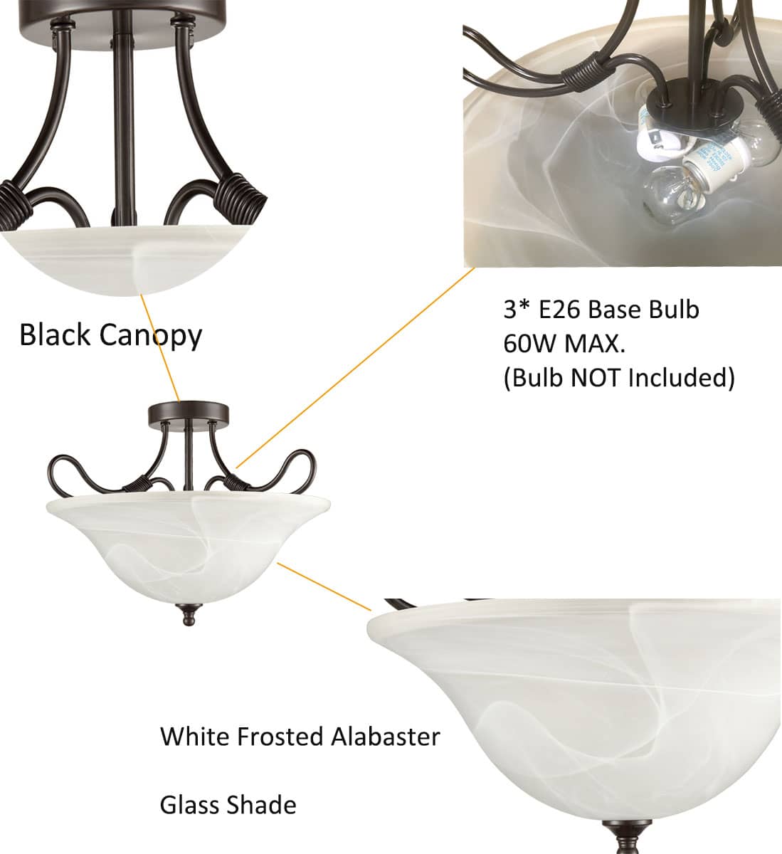 It is an appealing addition to your aesthetic with its lovely alabaster glass shade. Add this amazing piece to your living room, dining room, bedroom, hallway, and foyer. Compatible with three 60-watt E26-based bulbs (NOT included). Fully dimmable with a compatible dimmer switch and dimmable bulbs.