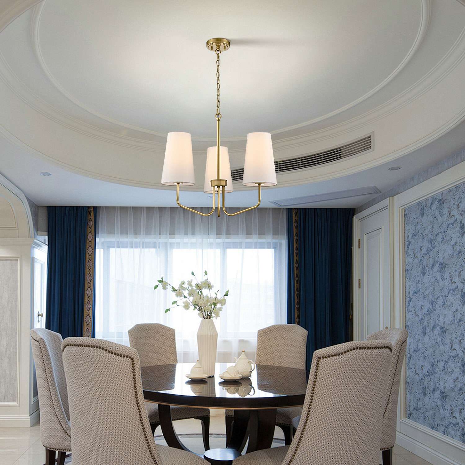 Flaunting a gold finish, the vintage gold pendant light fixture perks up your living space with a boost of sparkle. Three beige linen cone shades showcase the beauty of geometry and convey a refined touch. The light pouring through the fabric shades is gently muted and distributed evenly, filling the space without any glare. Three fabric shades are supported by gracefully curved arms, providing attractive eye appeal to the interior. The glistening finish offers a stark contrast to the beige linen cone shades, adding charisma and drama to the space. It comes with a 47.24-inch adjustable chain.