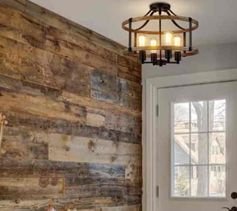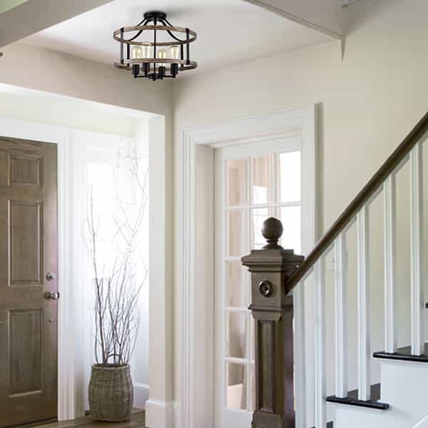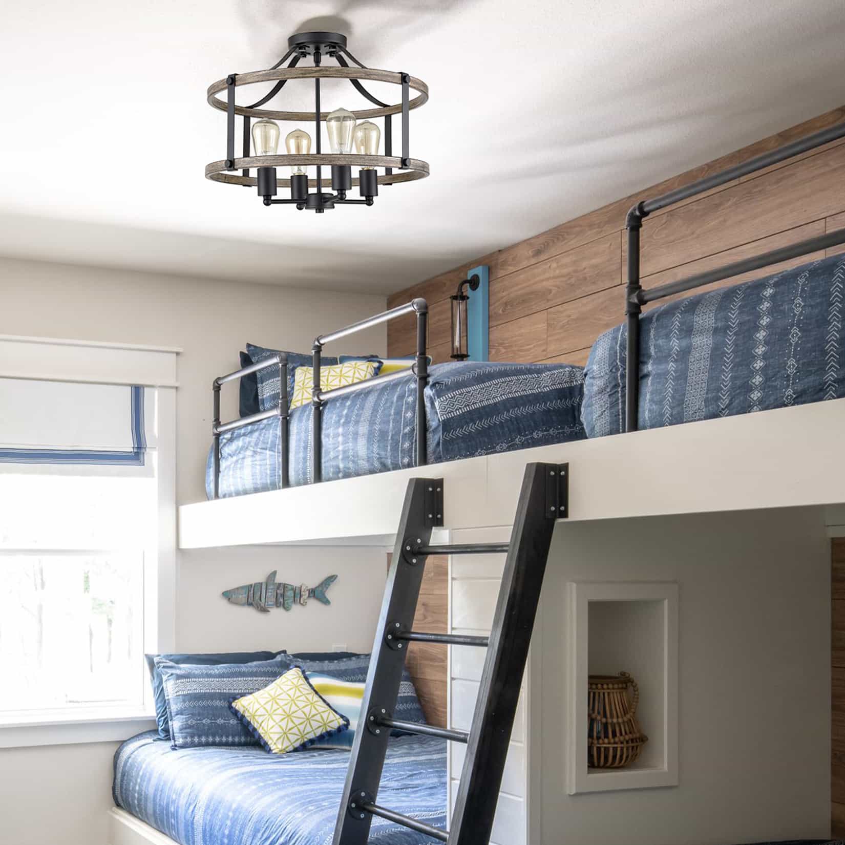 Briarwood ceiling light finished in semi-gloss black and circular metal frame features a wood grain finish and encircles three bulbs in the middle, the ceiling light infuses an industrial-inspired charm to your interior. It flaunts a unique drum shade look that keeps your home feel open and airy.