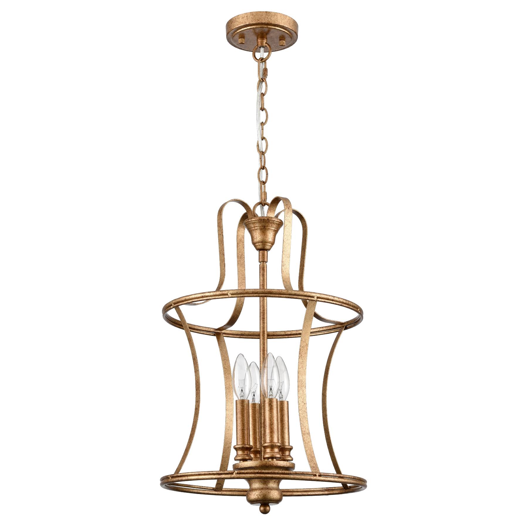 The farmhouse chandelier lantern pendant light delivers a huge dose of sparkle and shine to your interior with a rusty antique gold finish. Crafted of solid metal, its open cage shade is adorned by four arched metal bars. Its hourglass-inspired design adds visual interest and character to your living space. Its open cage surrounds four candelabra-inspired lights standing upright in the middle. The cage is topped with four curved arms, generating a dramatic look that will impress. Its open cage design allows the light to pass right through and creates intriguing light effect and shades.