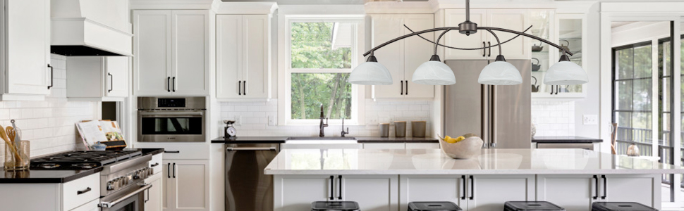 With a unique bronze finish, the kitchen island lighting equipped with bowl frosted alabaster glass shades, gracefully arched design, it's a great addition to your home
