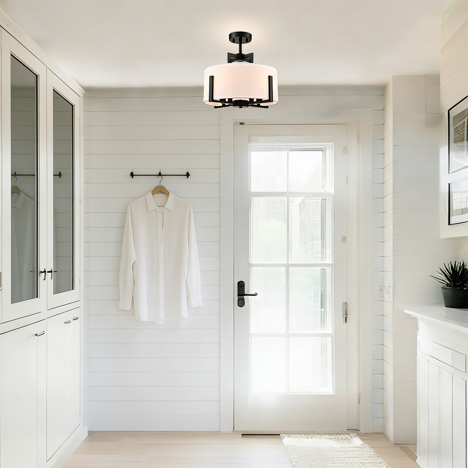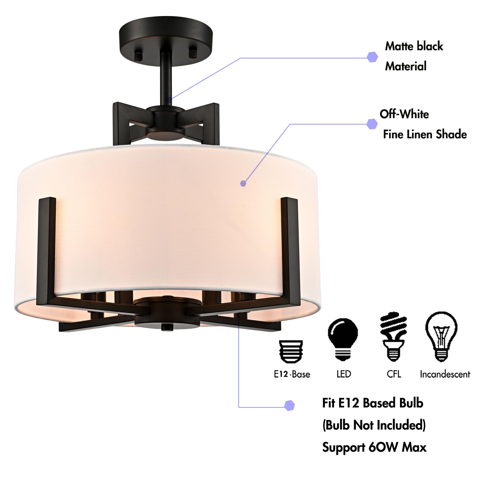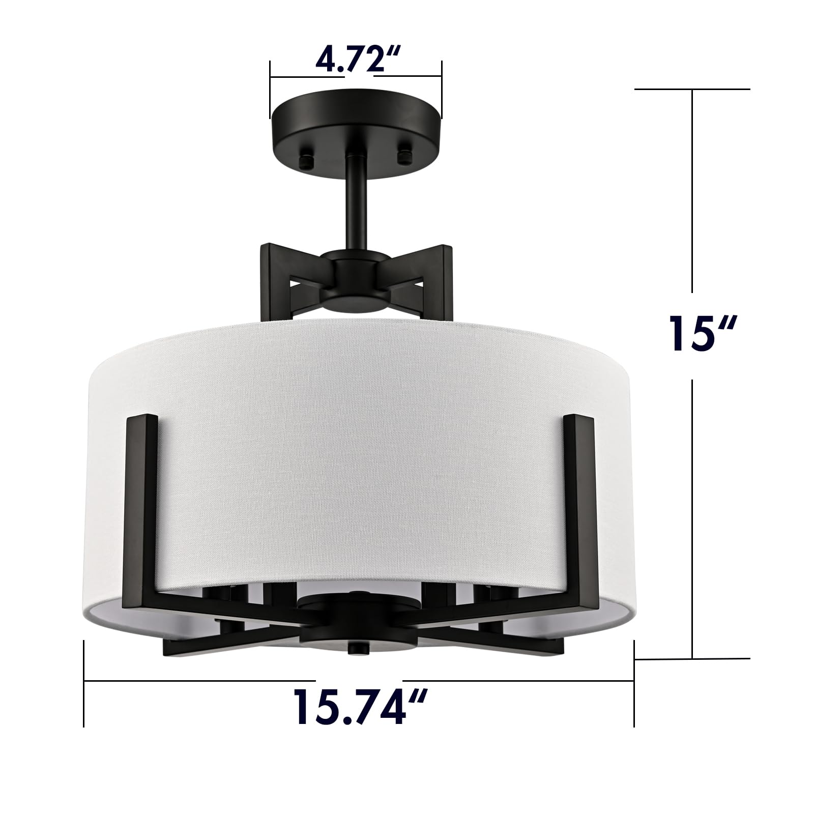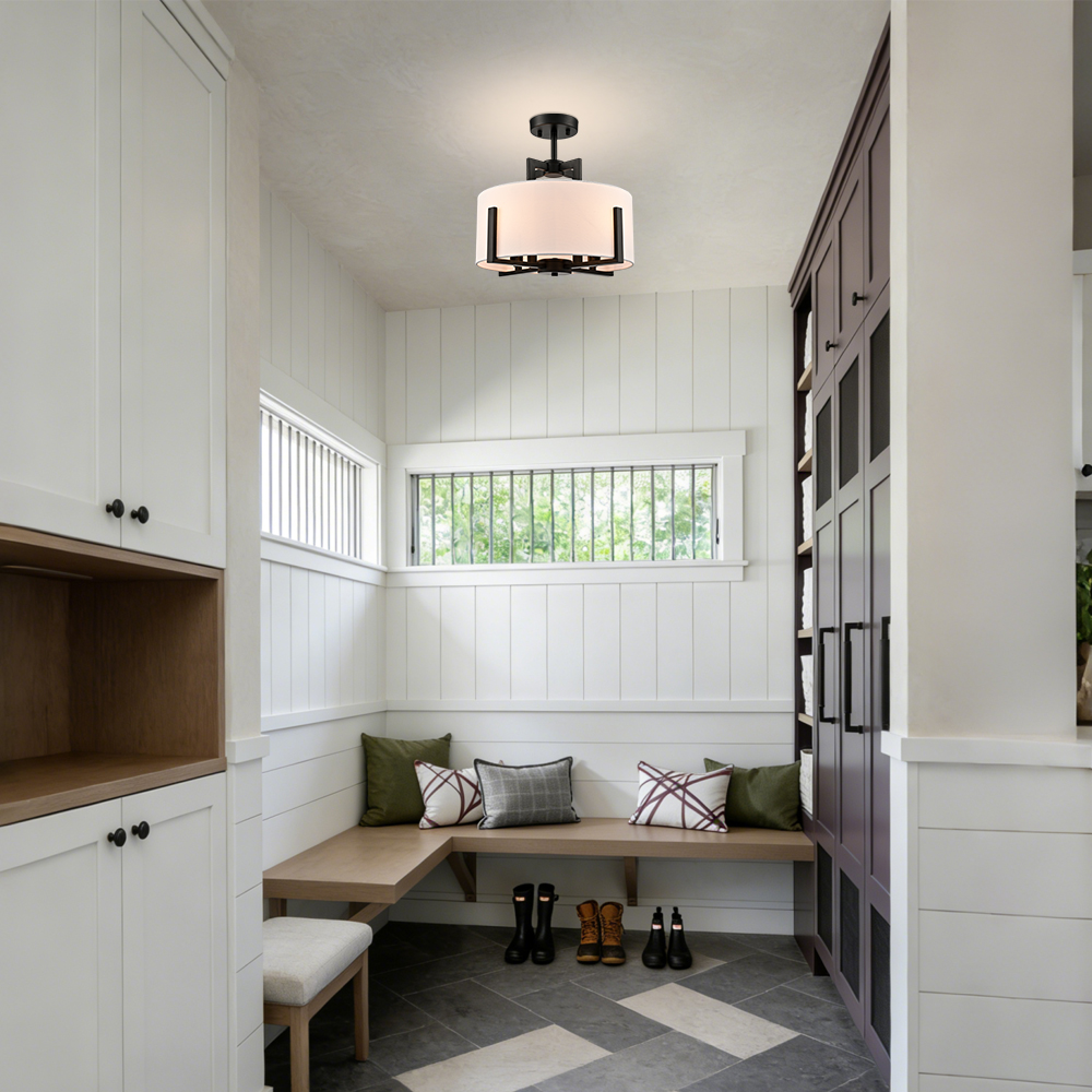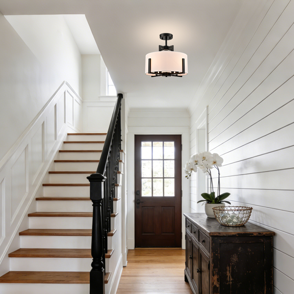 The black semi flush mount ceiling light flaunts a rustproof black finish, adding a touch of modern sophistication to your living space. Its white linen drum shade is held aloft by the four-pronged black metal frame, which brings rich visual interest to your interior. The light pouring through the linen drum shade is gently muted and fills the room without any glare. Its rounded drum shade gives your home a touch of geometry. Its black finish contrasts with the white linen drum shade and adds a ton of eye appeal to the space.