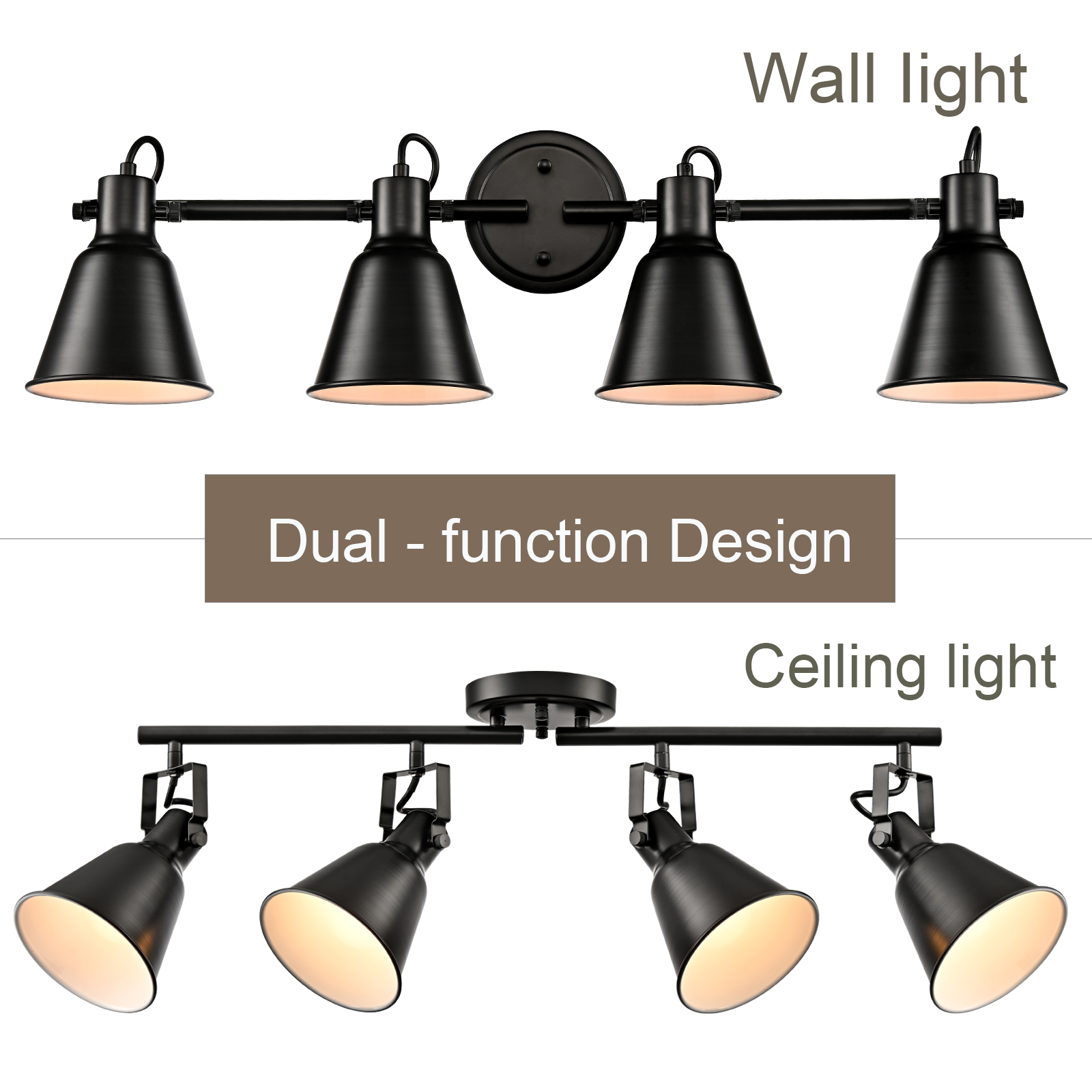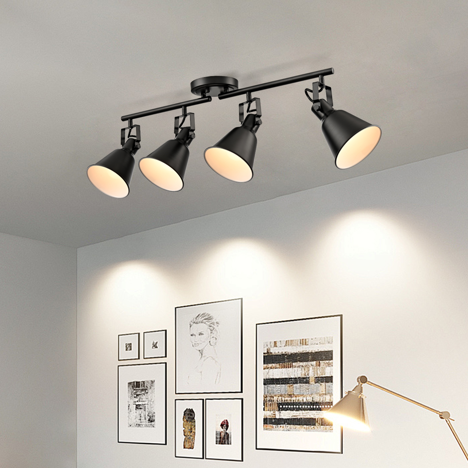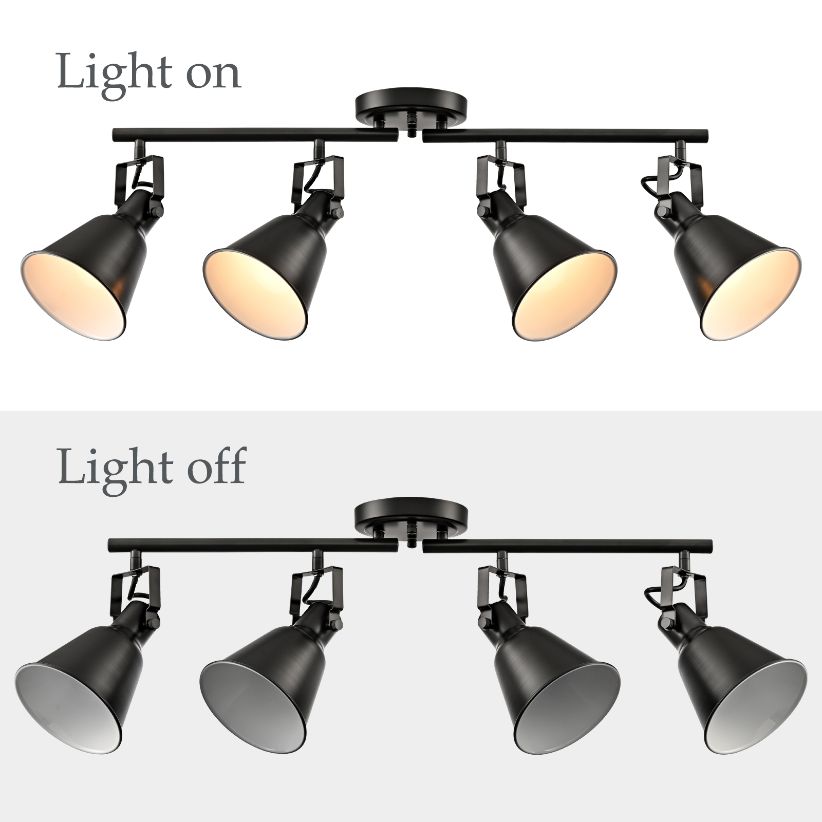 Crafted with solid metal, the ceiling track lighting's lampshades, arm, and canopy boast a rustproof matte black finish on the outer surface while it flaunts a white finish on the inner surface. The white interior of the lampshades helps reflect the light. A mix of finishes encompasses both modern qualities and classic elements, yet maintains an industrial edge. It boasts a minimalist but edgy look with 4 cone shades attached to a matching canopy for a clean and cohesive look. The lampshades’ of ceiling track lighting can be adjusted to direct light where it is needed most. It can either be mounted to ceilings or walls.