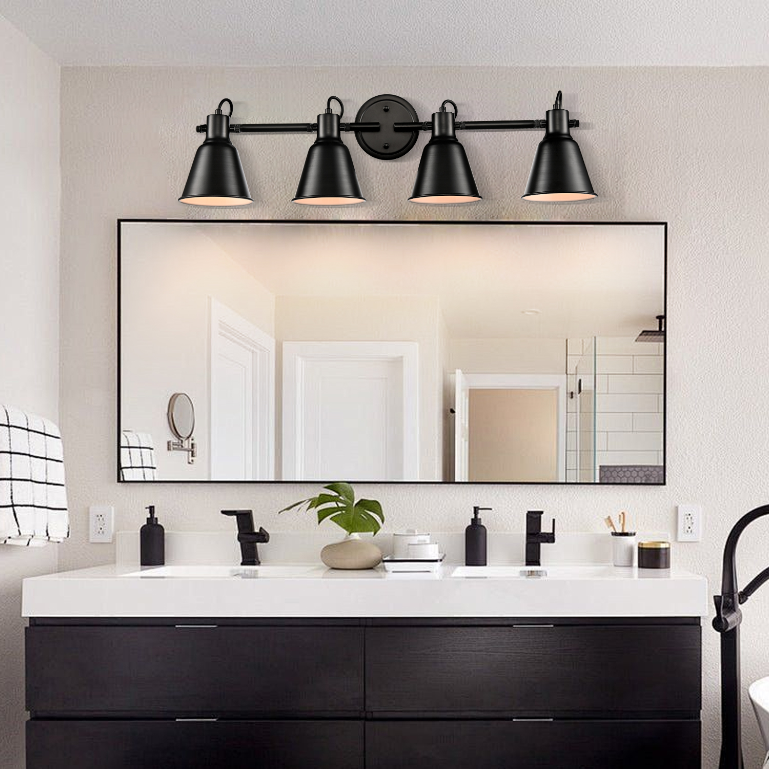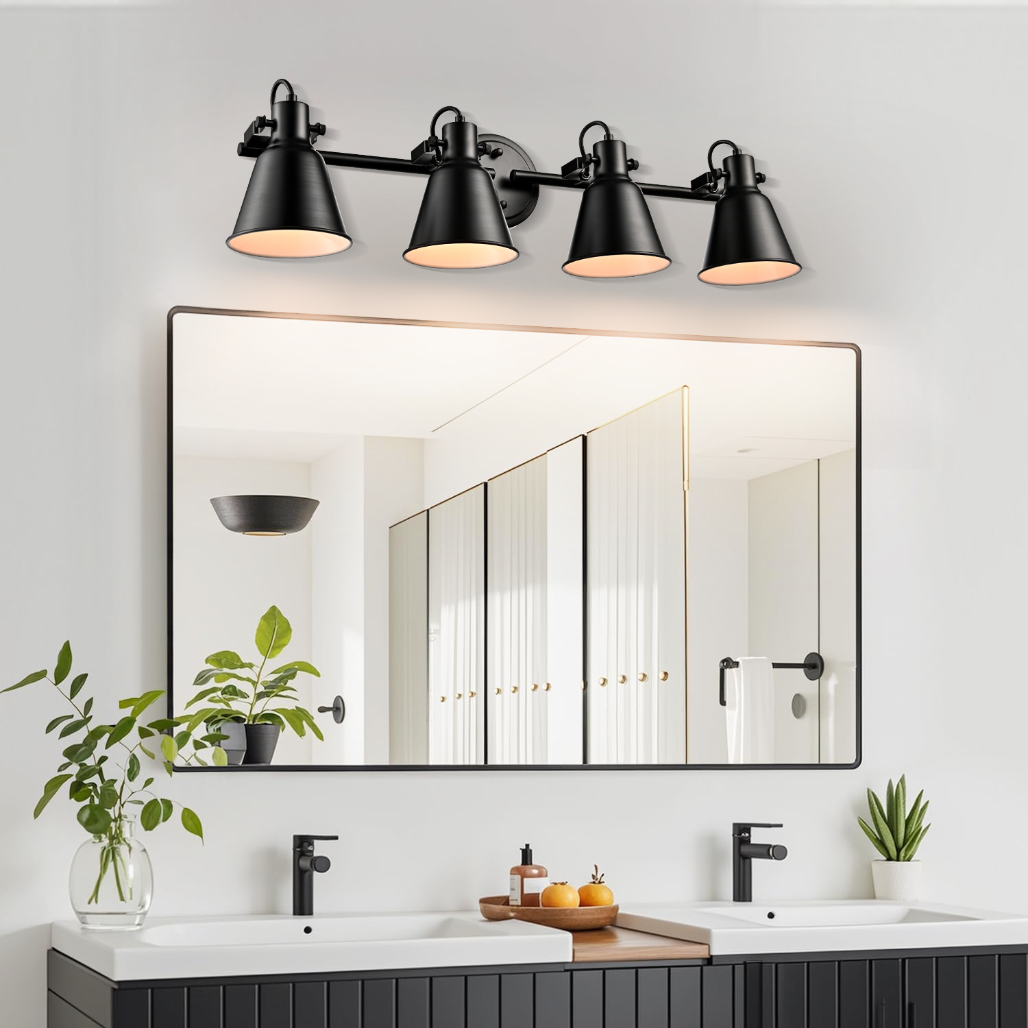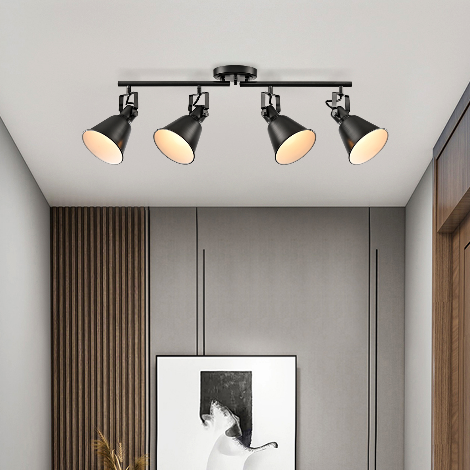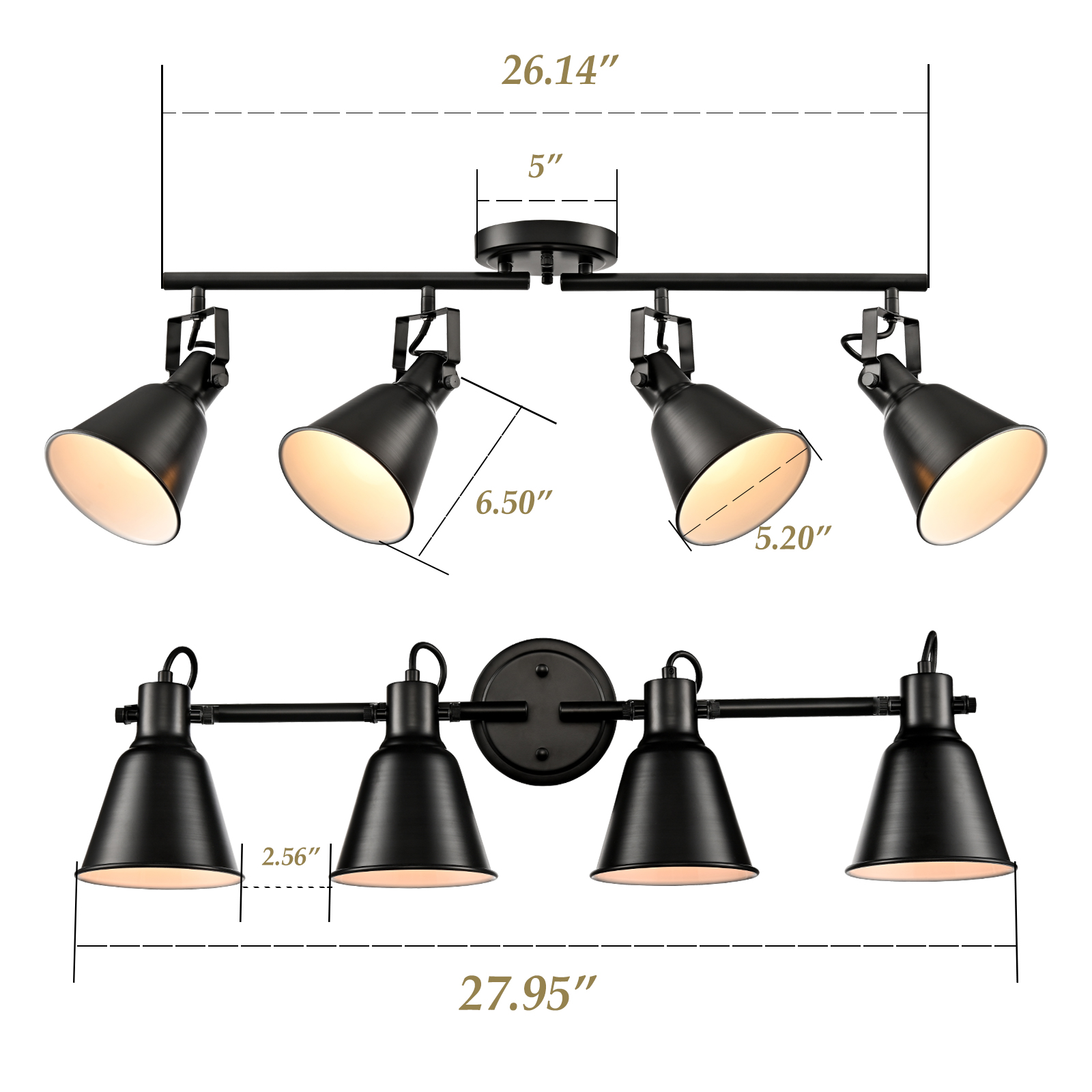 Crafted with solid metal, the ceiling track lighting's lampshades, arm, and canopy boast a rustproof matte black finish on the outer surface while it flaunts a white finish on the inner surface. The white interior of the lampshades helps reflect the light. A mix of finishes encompasses both modern qualities and classic elements, yet maintains an industrial edge. It boasts a minimalist but edgy look with 4 cone shades attached to a matching canopy for a clean and cohesive look. The lampshades’ of ceiling track lighting can be adjusted to direct light where it is needed most. It can either be mounted to ceilings or walls.