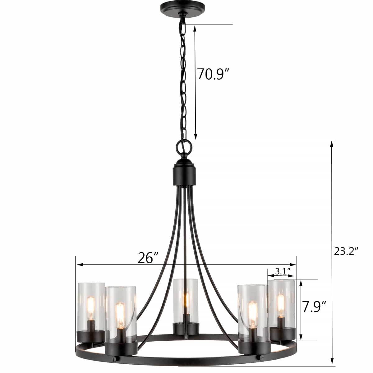 Being finished in semi-gloss black, a five-light wagon wheel chandelier sports an iron round frame. Crafted of impurity-free hand-blown clear glass, its cylinder shades give your aesthetic a touch of geometry.