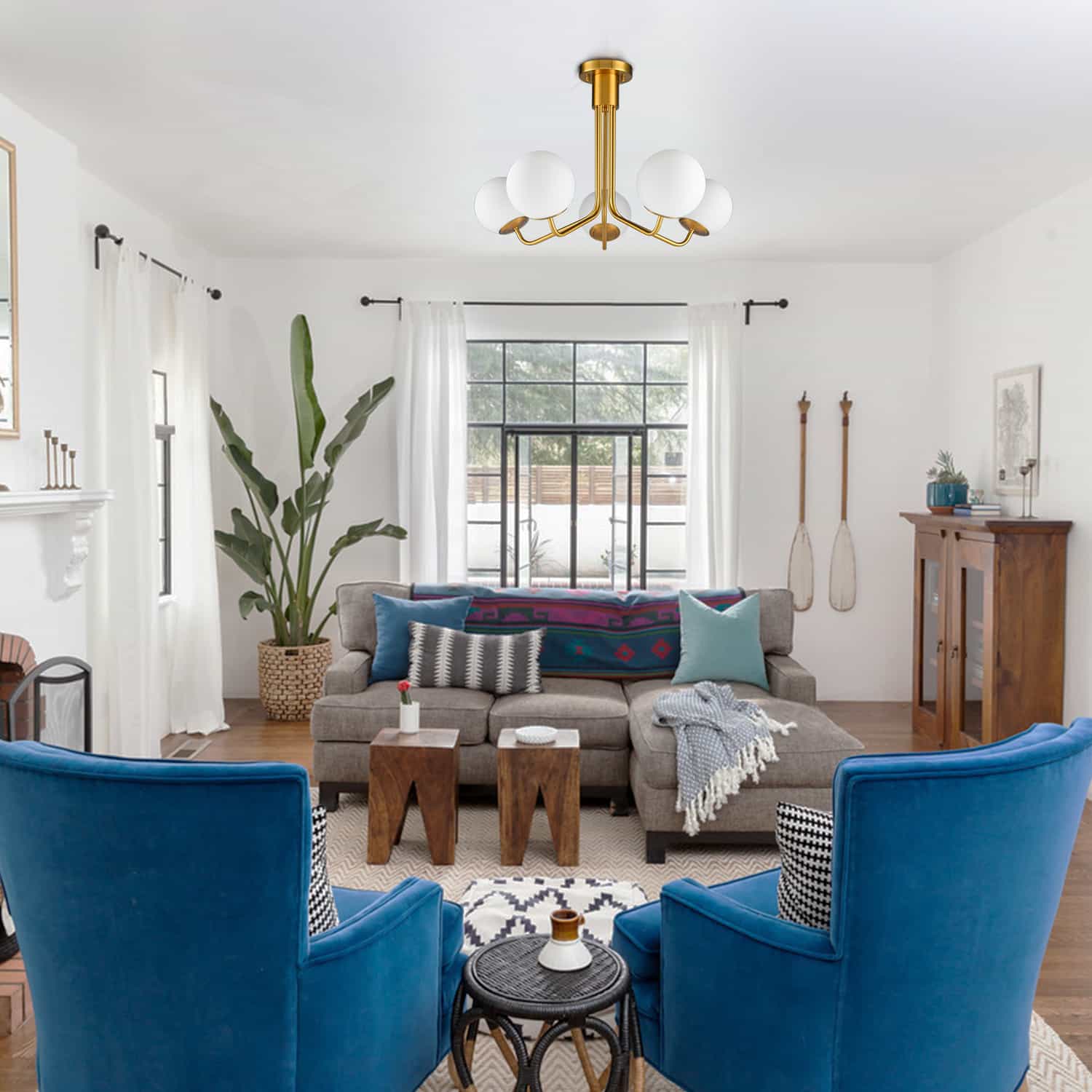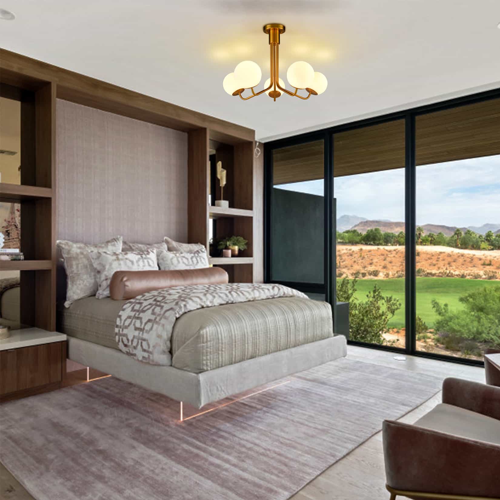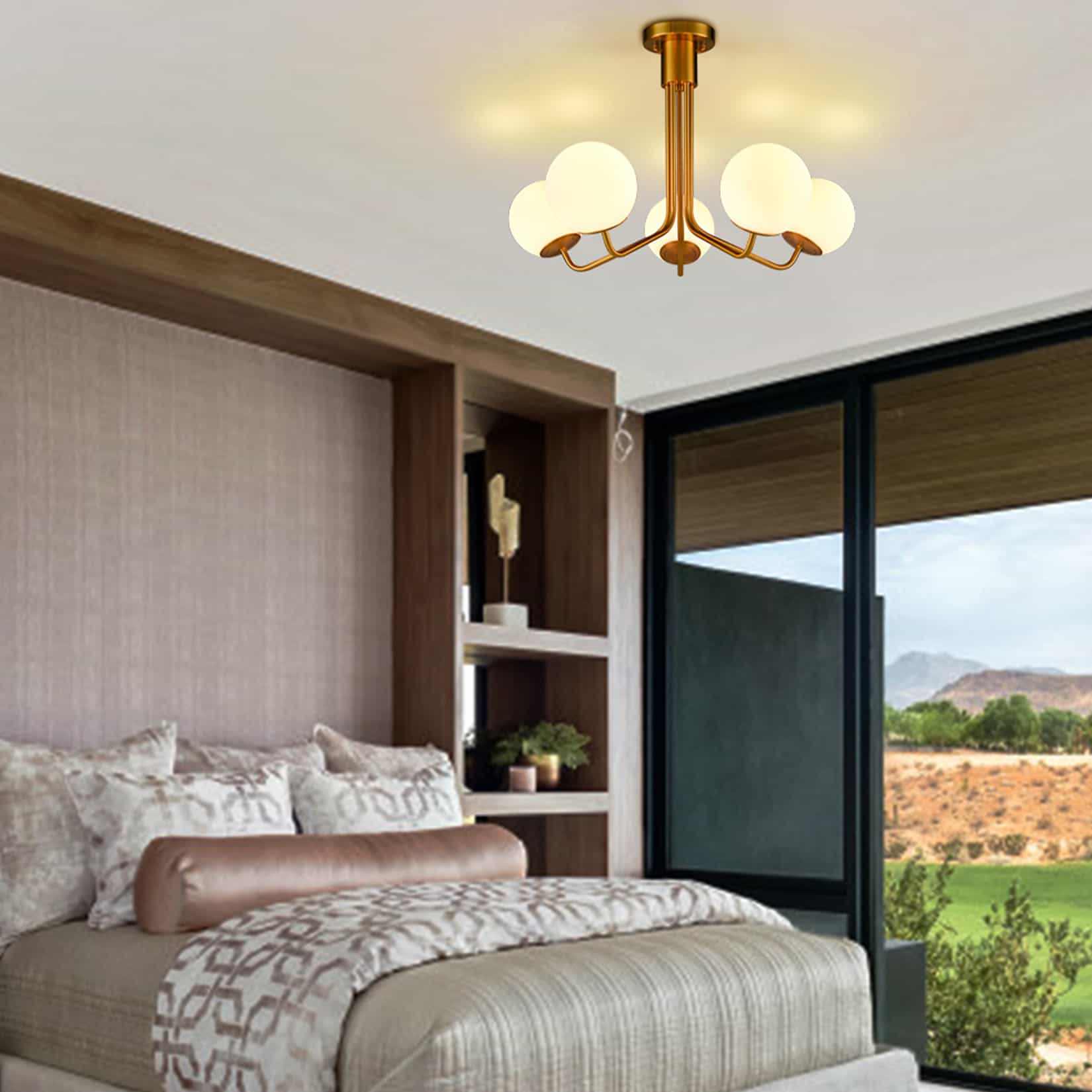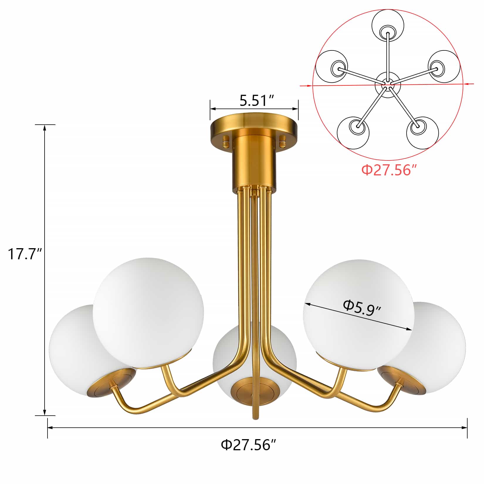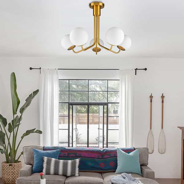 5-Light Mid-Century Modern Gold Semi Flush Mount Globe Ceiling Chandelier Light
