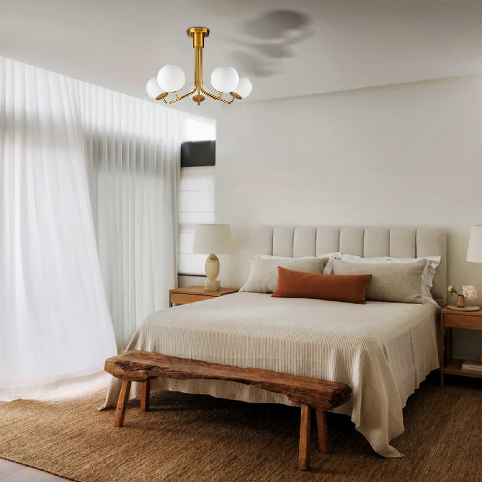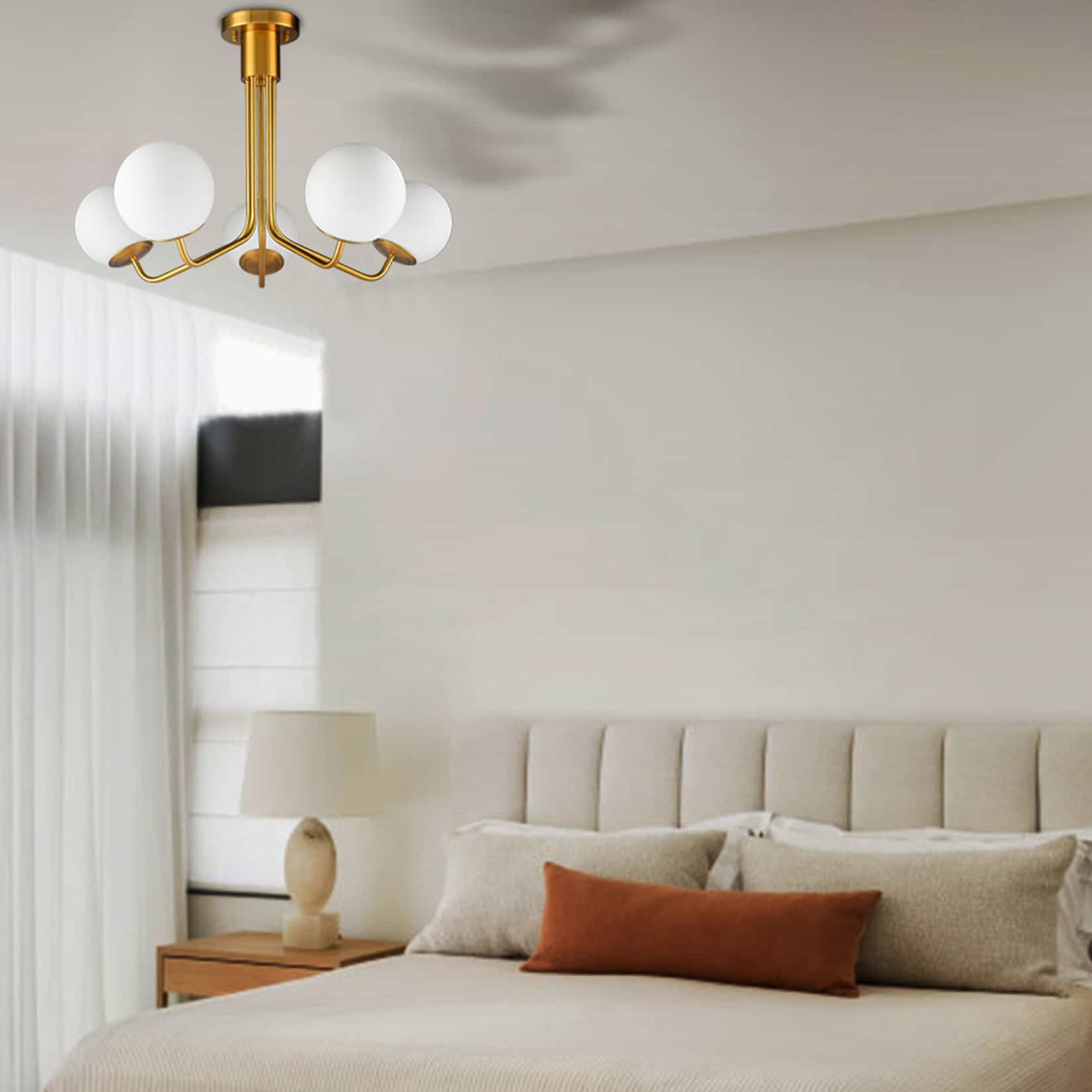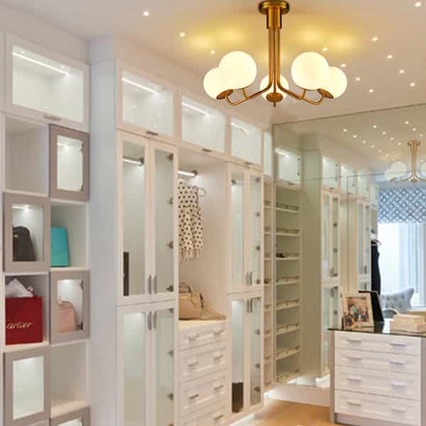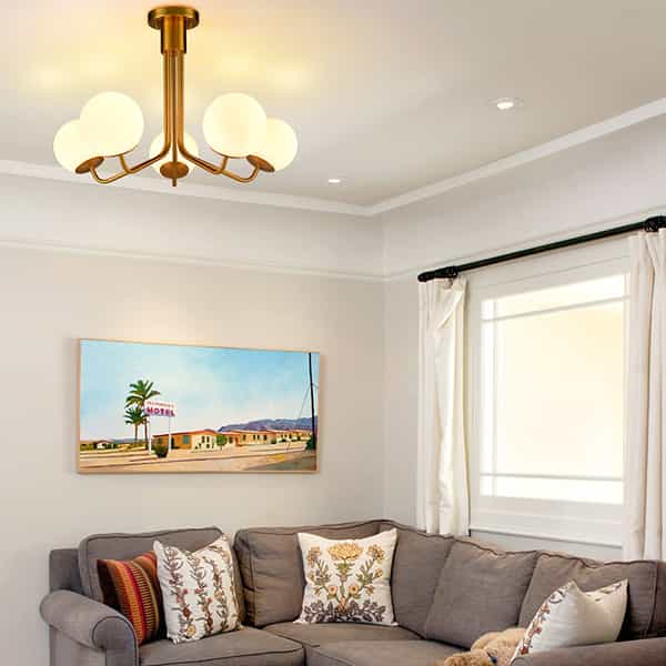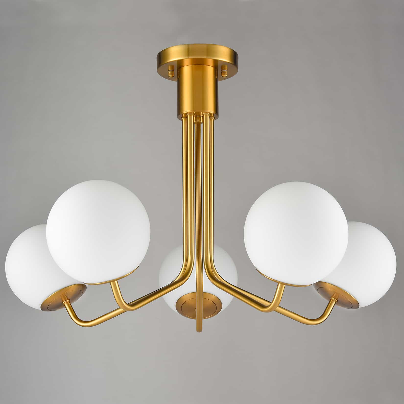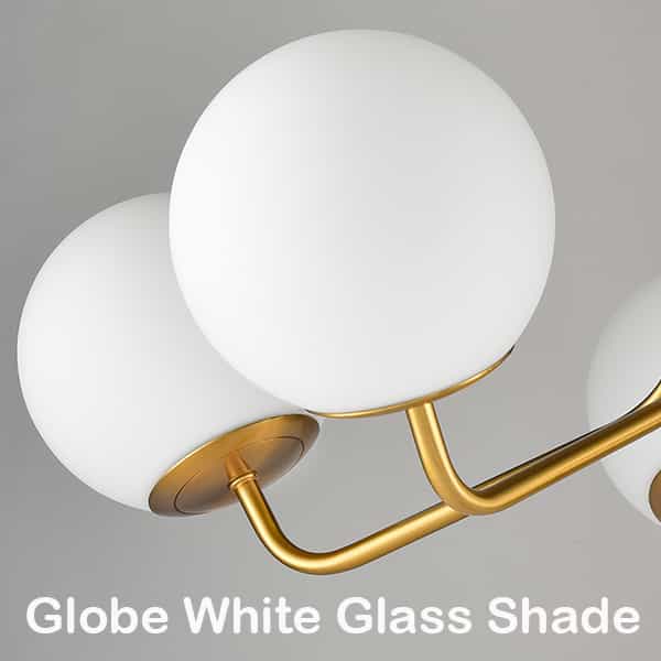 Flaunting a rustproof electrophoretic gold finish, the globe ceiling chandelier light spruces up your living space with a touch of sparkle. Crafted from impurity-free hand-blown opaque opal glass, it provides the perfect blend of mid-century classic and contemporary elements. Five glass shades are supported by gracefully curved arms, conveying a refined touch. Its globe shades contrast the gold finish and add alluring visual interest to the living area.