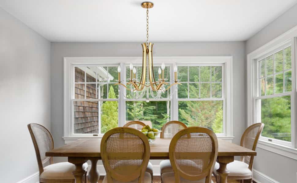 The chandelier adds a retro flair in your space with a rustproof gold plating finish. The crystal on the frame adds a bit of bling to your interior.