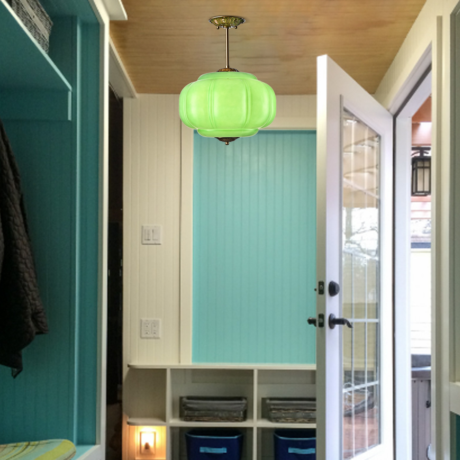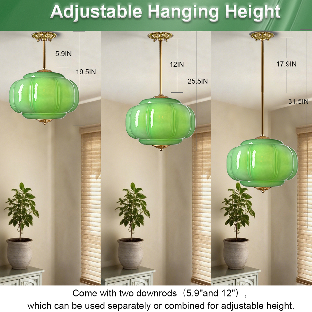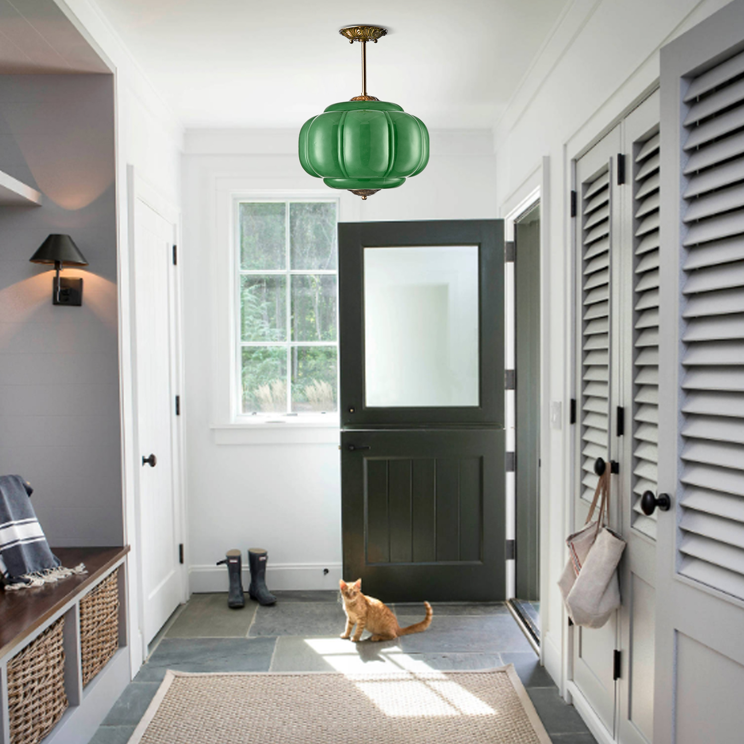 The milk glass ceiling light’s canopy, hanging rod, top accent, and bottom accent showcase a brass finish, livening up your space with glitzy sparkle. Its green glass shade gives your home a snappy look and a glamorous, refreshing vibe. Its mix of finishes encompasses both vintage touch and brisk color, yet maintains an industrial feel. Crafted of impurity-free hand-blown milk glass, its pumpkin-inspired lampshade provides a touch of whimsy to your living space. Its brass finish and the green lampshade draw the eye upward to a beautiful display of glass and metal suspended above. It comes with one 5.9-inch rod and one 12-inch rod.