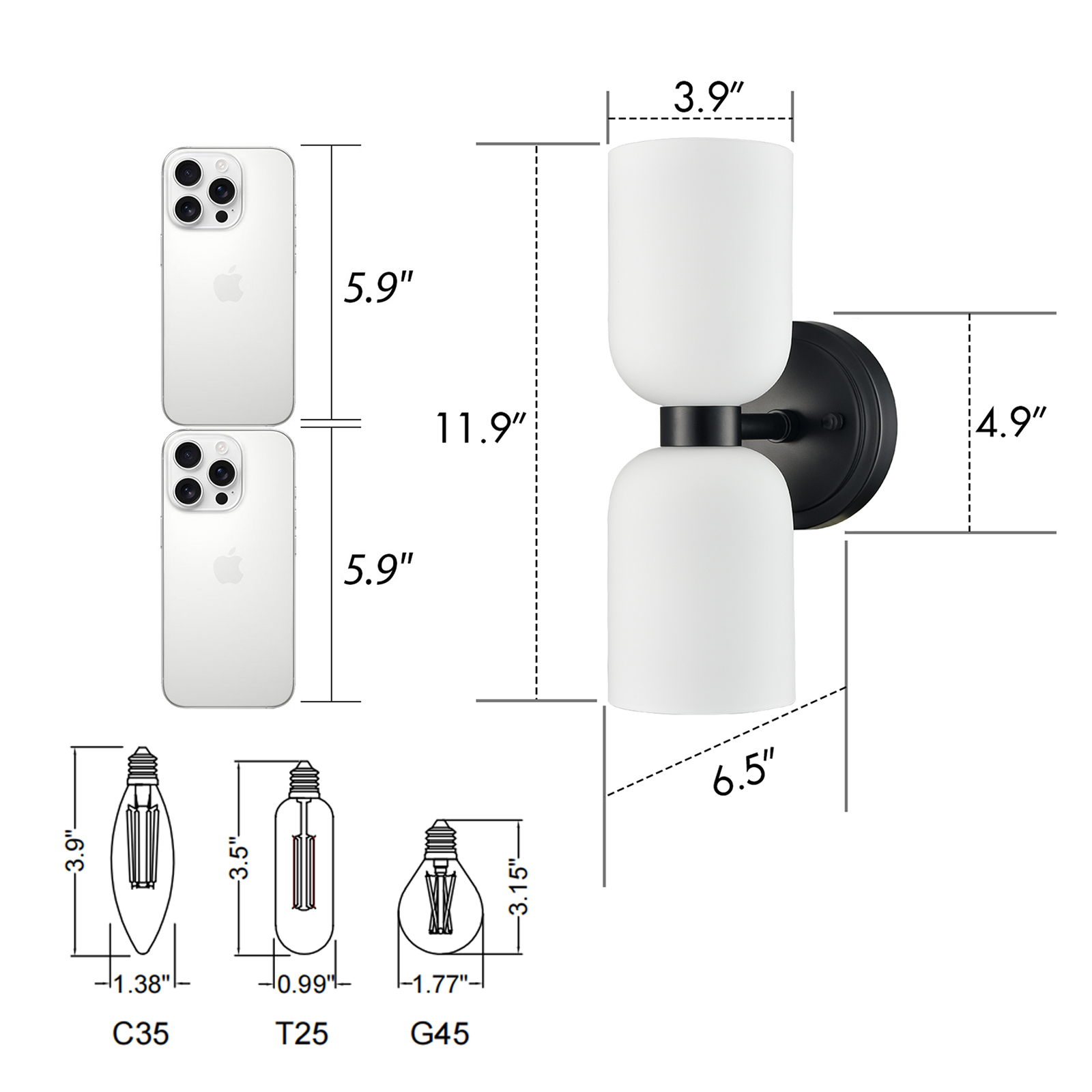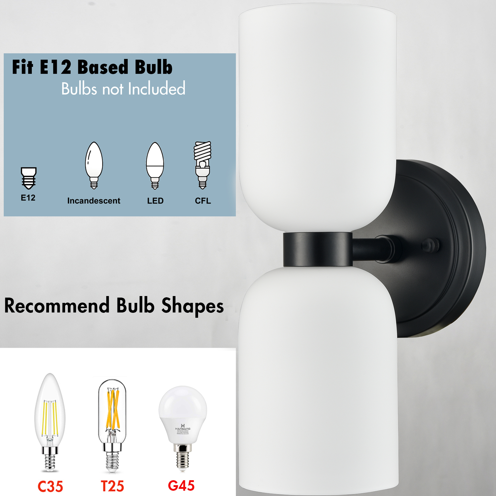 Each wall sconce comes with two E12-base sockets which are compatible with a variety of bulb types: LED, INCANDESCENT, CFL.
