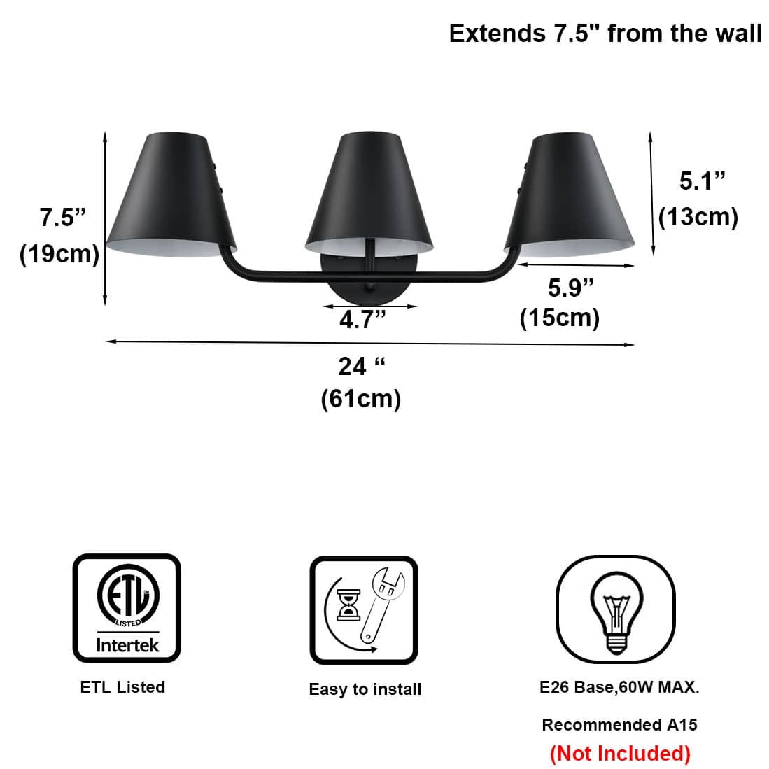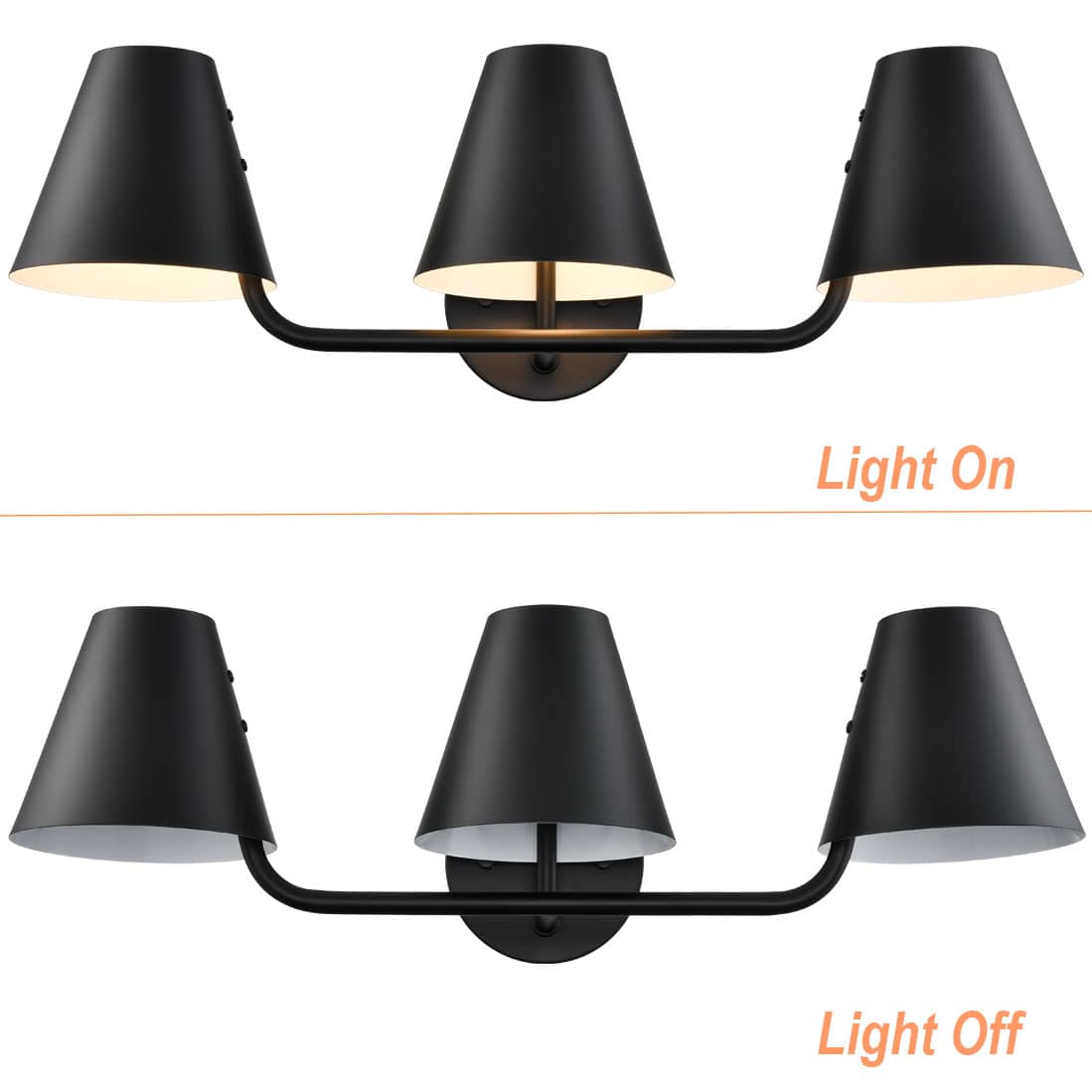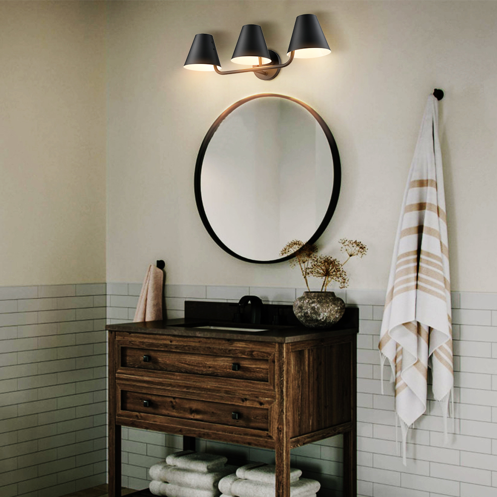 Featuring a rustproof black finish, the 3-light bathroom vanity light gives your living space a touch of urban sophistication. Its cone shades flaunt a black finish on the exterior while they sport a white finish on the interior. Its beautiful dual finish makes an industrial yet classic statement in your home. The white interior of the cone shades perfectly reflects light so that the wall lamp can provide ample and diffused ambient light. Crafted from solid metal, it introduces a farmhouse feel to your living space.