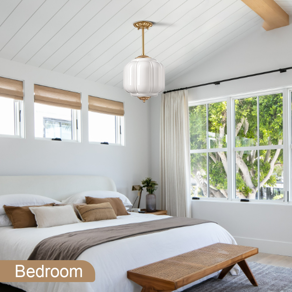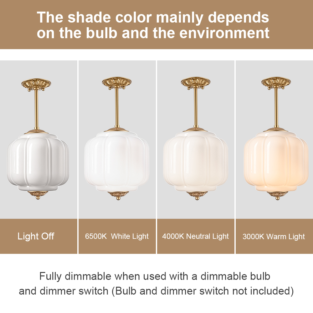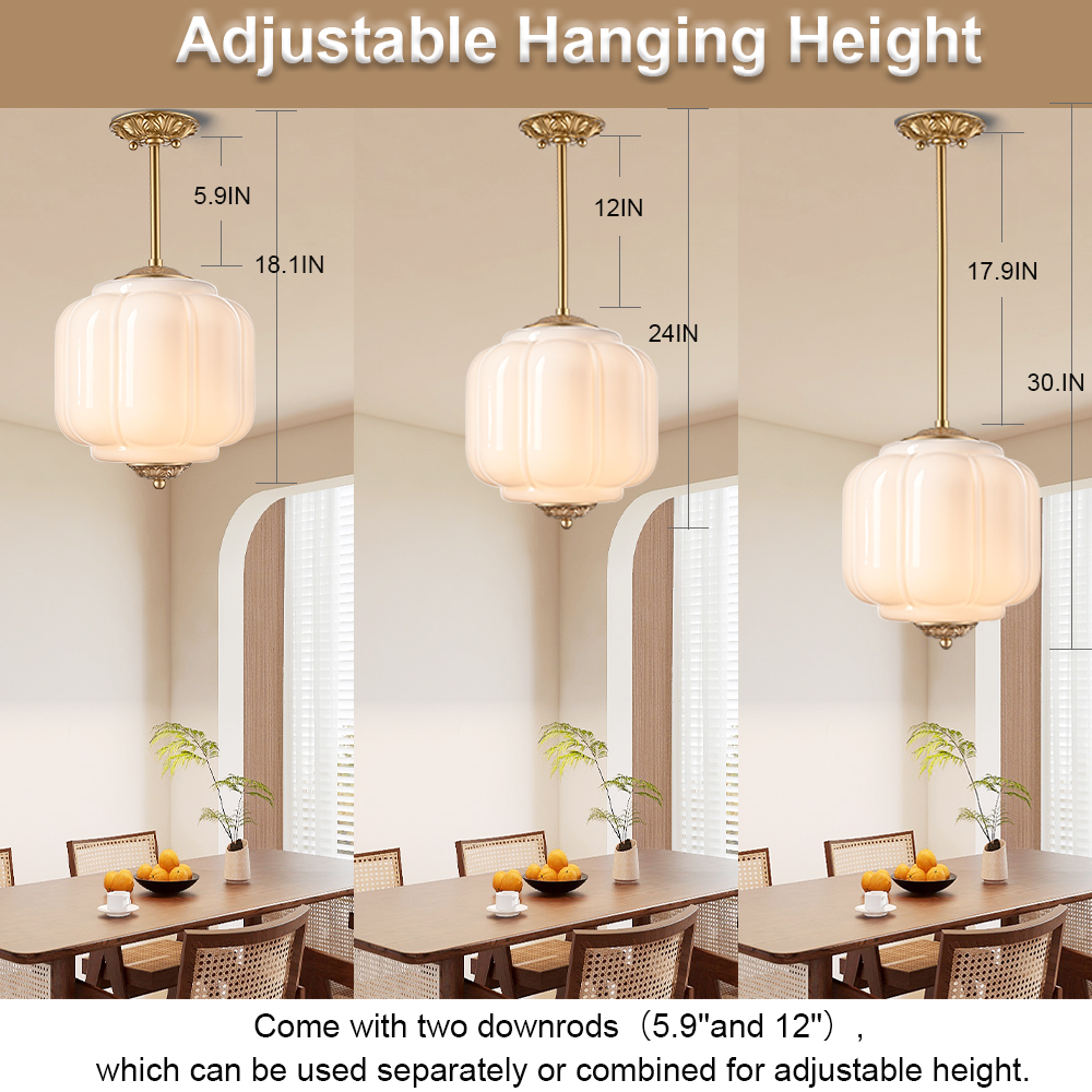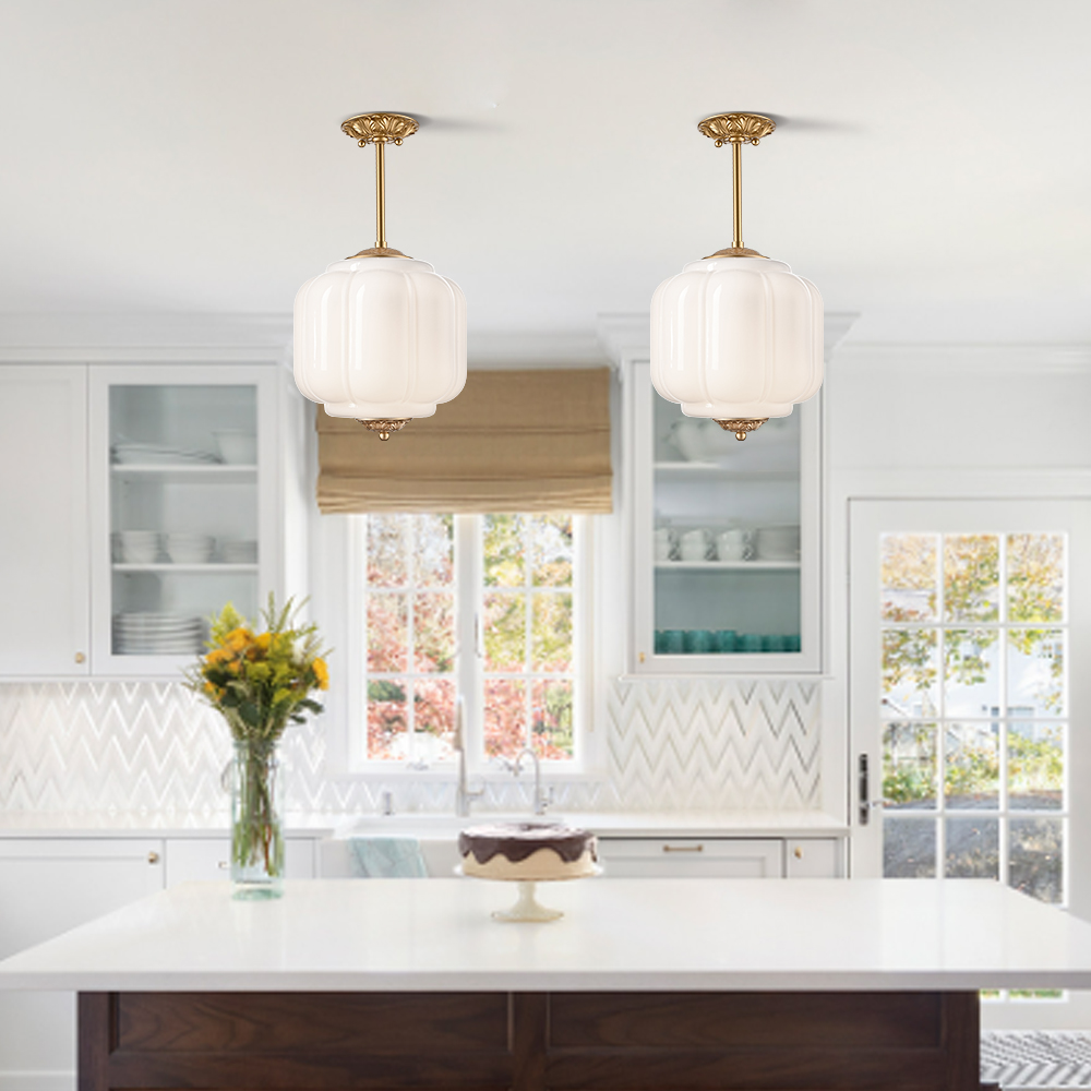 The milk glass ceiling light’s canopy, hanging rod, top accent, and bottom accent showcase a brass finish, livening up your space with glitzy sparkle. Its white glass shade gives your home a snappy look and a glamorous, refreshing vibe. Its mix of finishes encompasses both vintage touch and brisk color, yet maintains an industrial feel. Crafted of impurity-free hand-blown milk glass, its pumpkin-inspired lampshade provides a touch of whimsy to your living space. Its brass finish and the white lampshade draw the eye upward to a beautiful display of glass and metal suspended above. It comes with one 5.9-inch rod and one 12-inch rod.