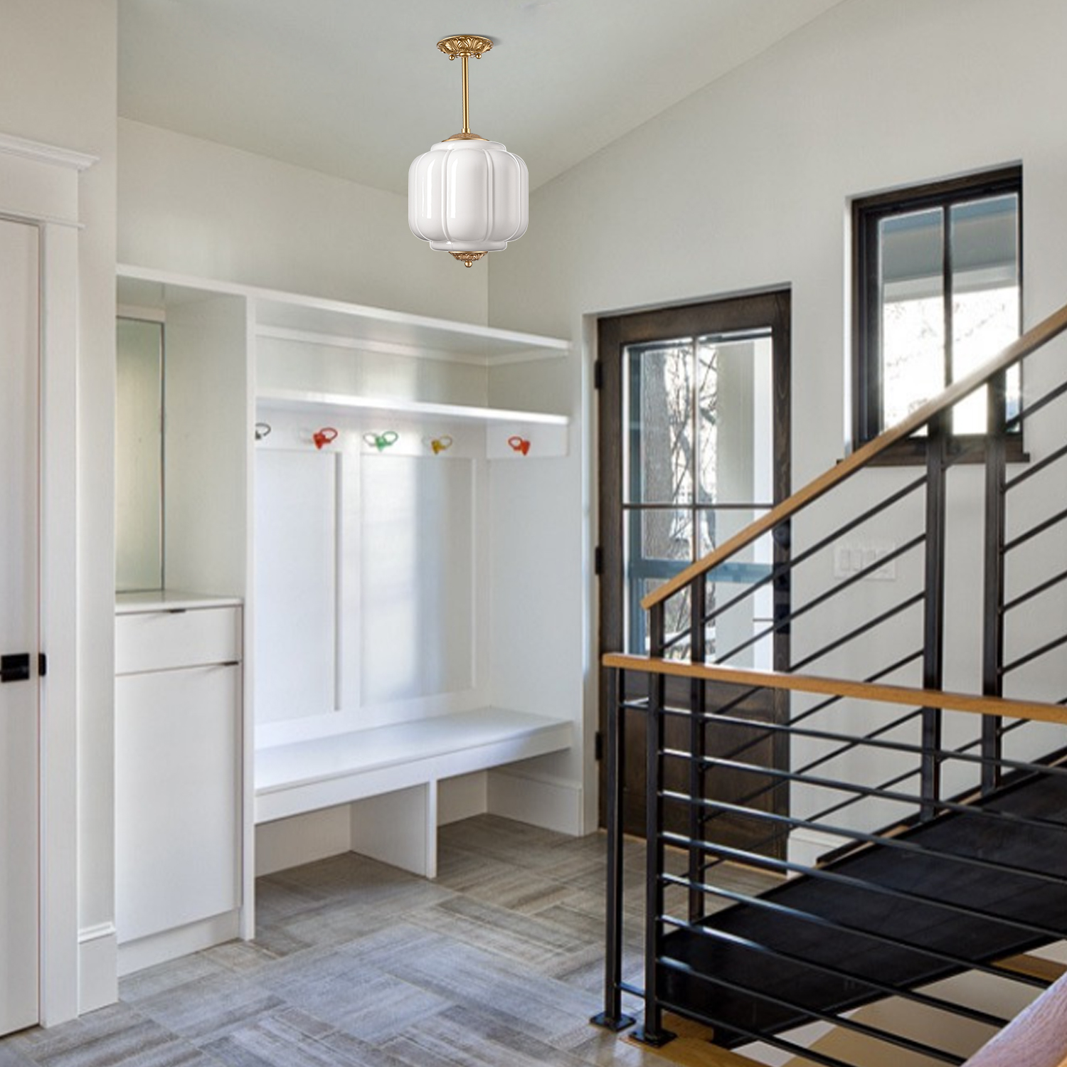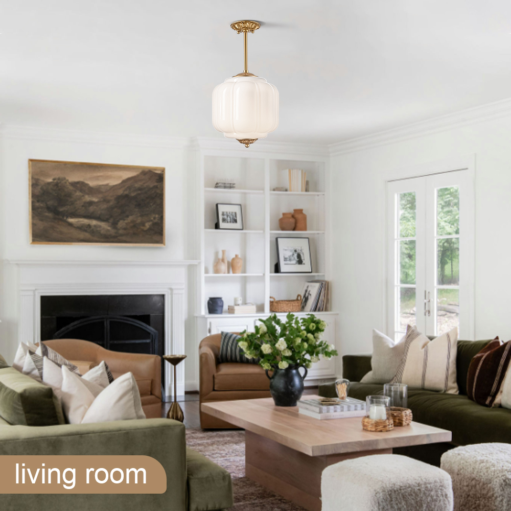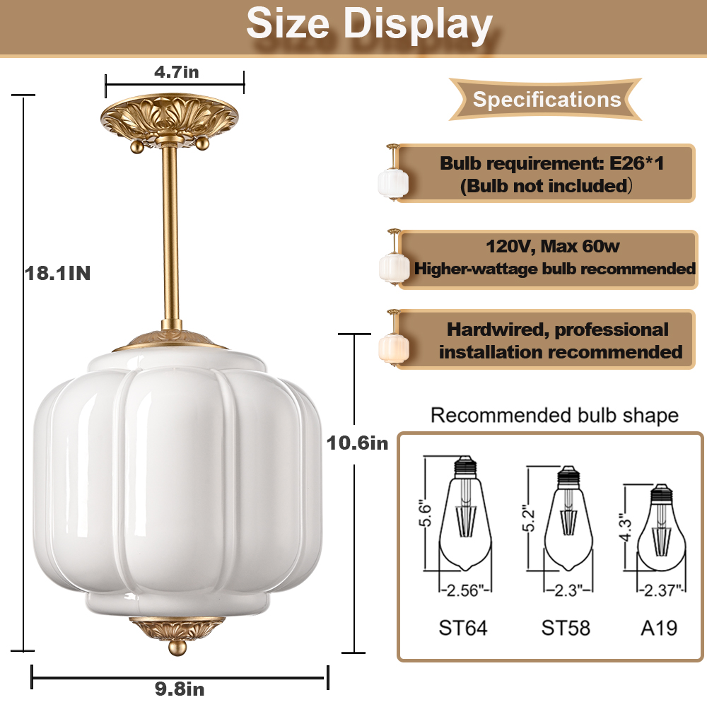 The milk glass ceiling light’s canopy, hanging rod, top accent, and bottom accent showcase a brass finish, livening up your space with glitzy sparkle. Its white glass shade gives your home a snappy look and a glamorous, refreshing vibe. Its mix of finishes encompasses both vintage touch and brisk color, yet maintains an industrial feel. Crafted of impurity-free hand-blown milk glass, its pumpkin-inspired lampshade provides a touch of whimsy to your living space. Its brass finish and the white lampshade draw the eye upward to a beautiful display of glass and metal suspended above. It comes with one 5.9-inch rod and one 12-inch rod.