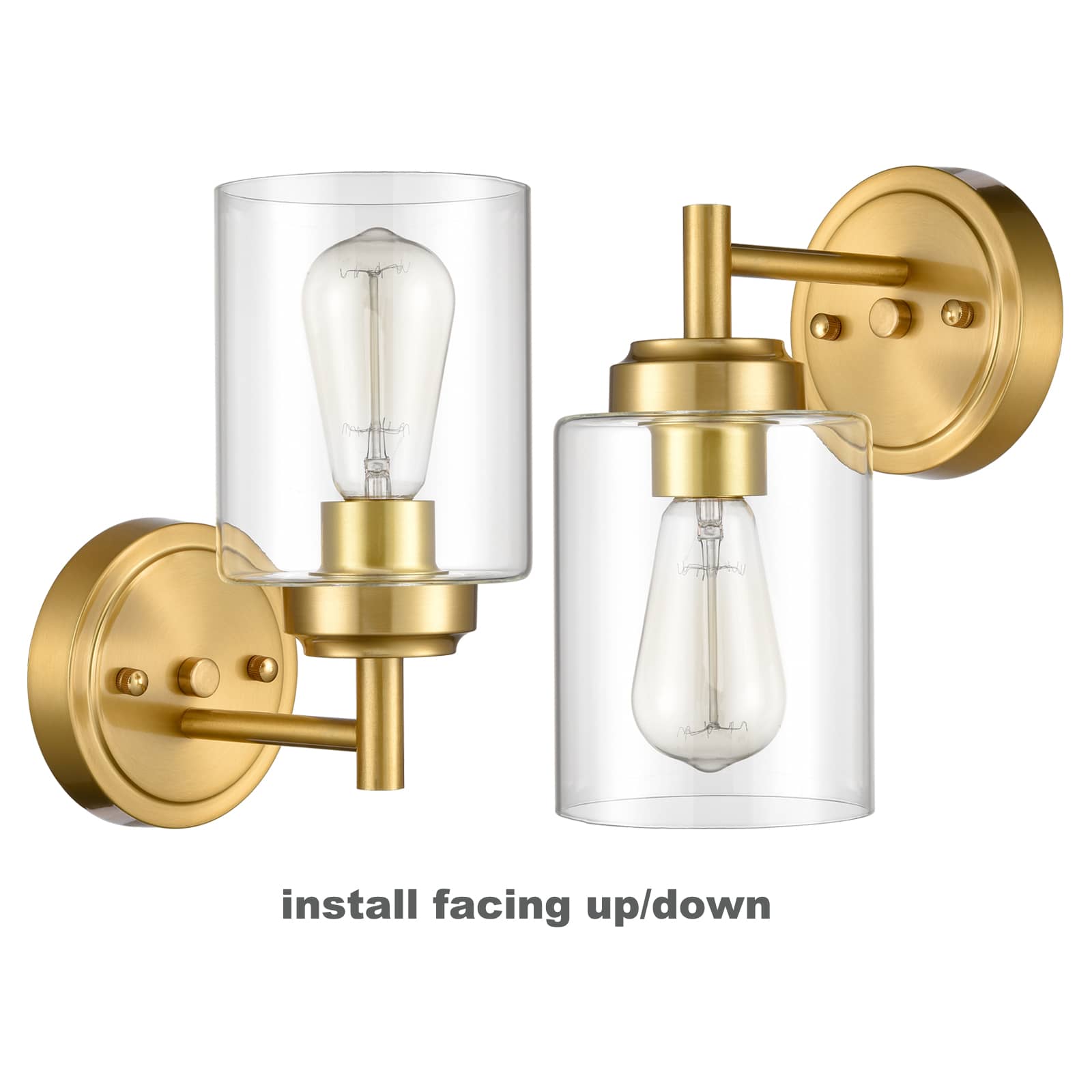 Flaunting a rustproof electrophoretic brass finish, the clear glass vanity wall sconces brighten up your interior with a dash of metallic shimmer. Crafted from clear glass, the cylinder shades with excellent light transmittance round out the design with an elegant touch. Showcasing the beauty of geometry, the clear glass vanity wall sconces can add a touch of modernity to your aesthetic. Their shiny brass finish contrasts the clear glass shades and adds alluring visual interest to the space.
