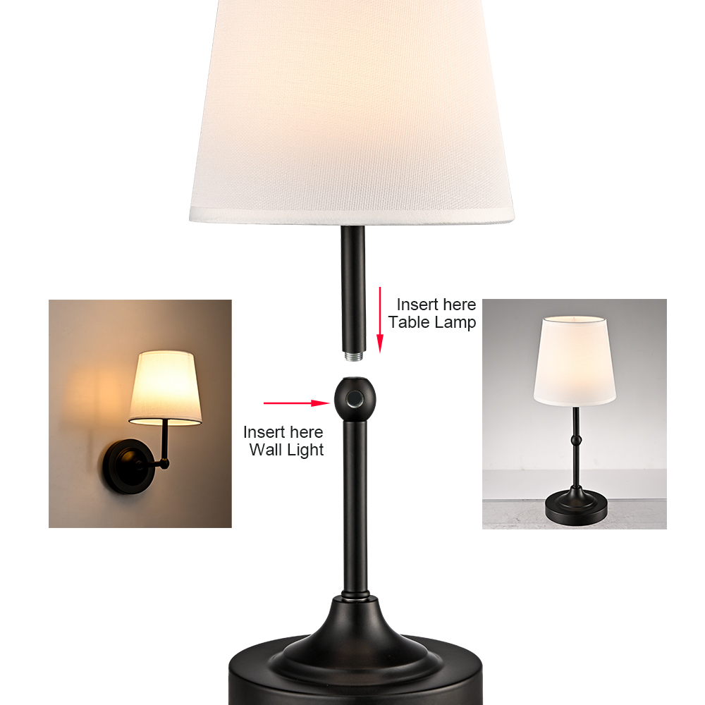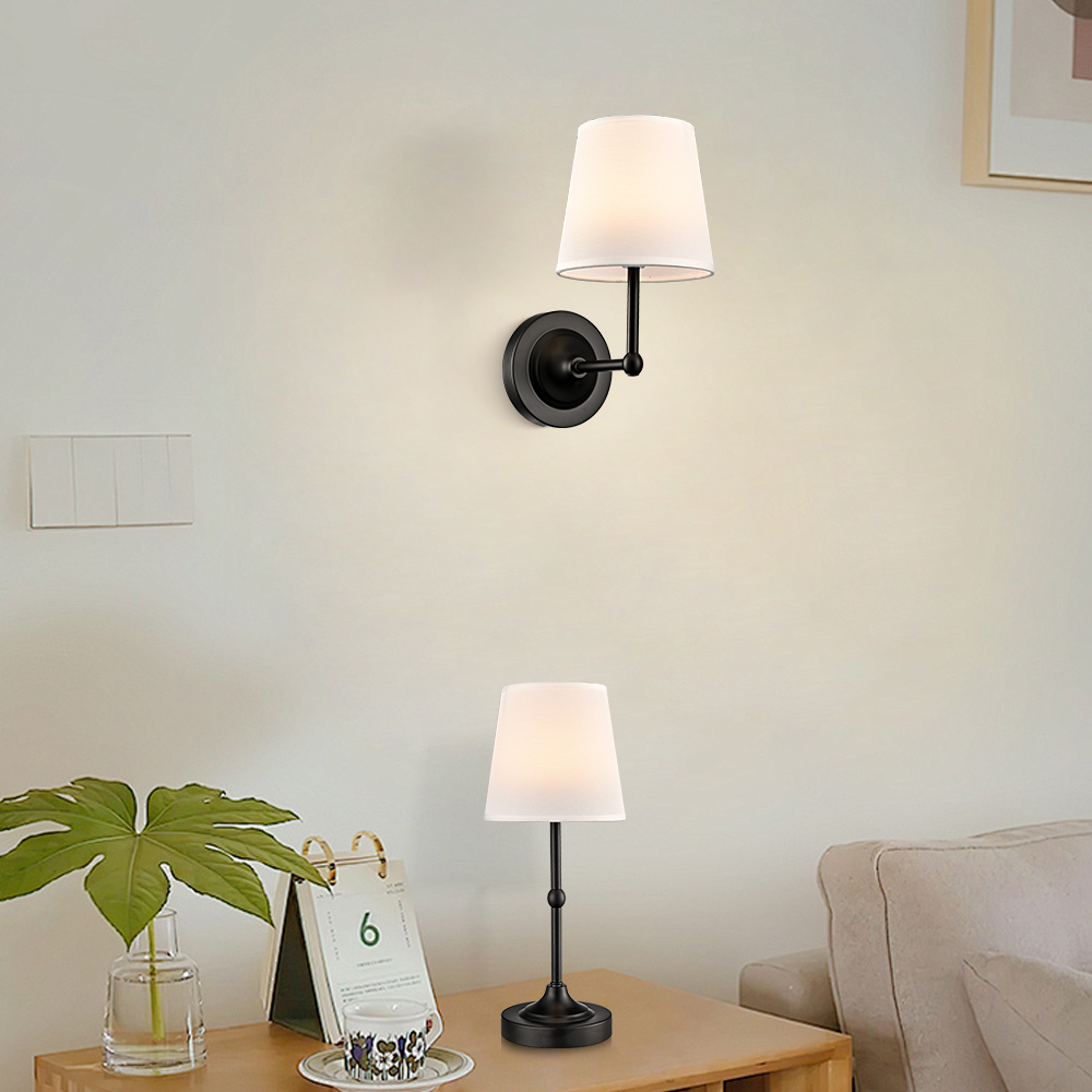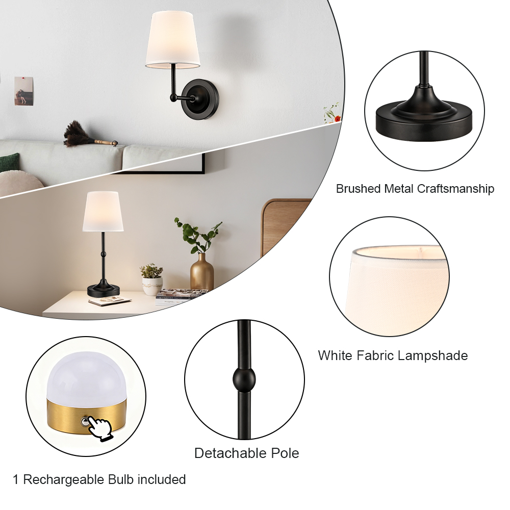 Boasting a semigloss black finish, the battery operated wall sconces liven up your interior with a ton of texture. Their fabric cone shades are held aloft and supported by sturdy detachable black arms, lending a dash of drama and the right amount of style to your interior. Their black finish contrasts with the fabric shades and adds alluring visual interest to the space. The light pouring through the white fabric lampshades is gently muted and fills the room without any glare. They can both be used as wall lights and table lamps.