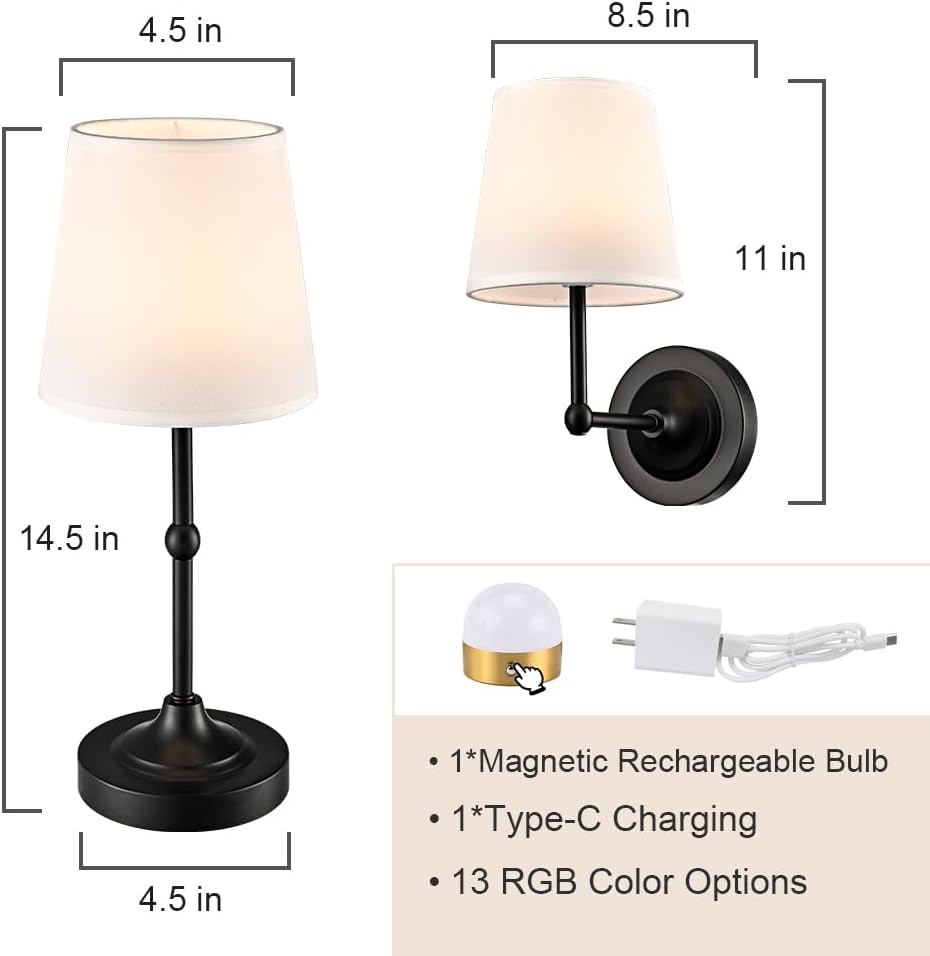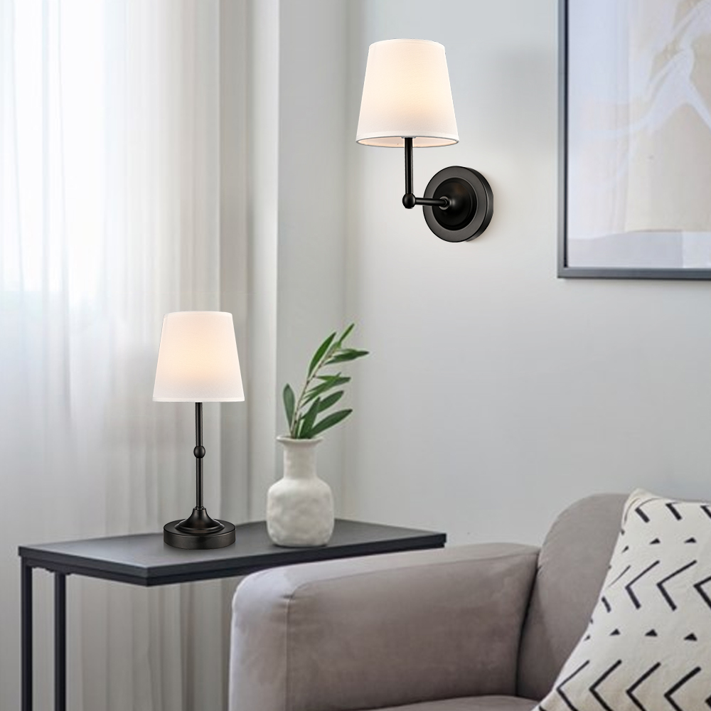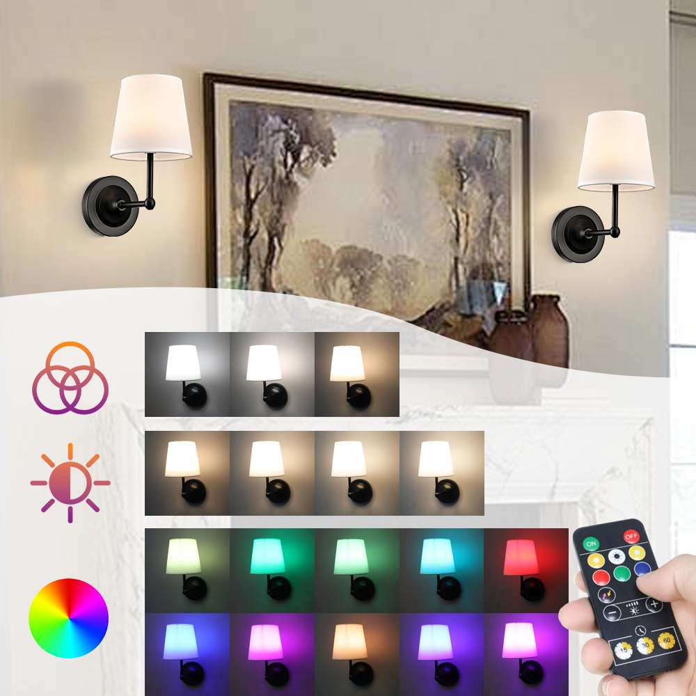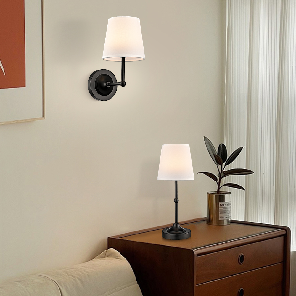 Boasting a semigloss black finish, the battery operated wall sconces liven up your interior with a ton of texture. Their fabric cone shades are held aloft and supported by sturdy detachable black arms, lending a dash of drama and the right amount of style to your interior. Their black finish contrasts with the fabric shades and adds alluring visual interest to the space. The light pouring through the white fabric lampshades is gently muted and fills the room without any glare. They can both be used as wall lights and table lamps.