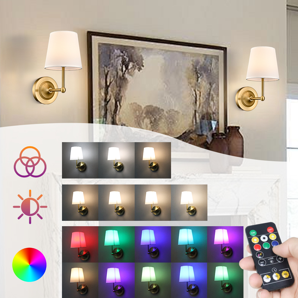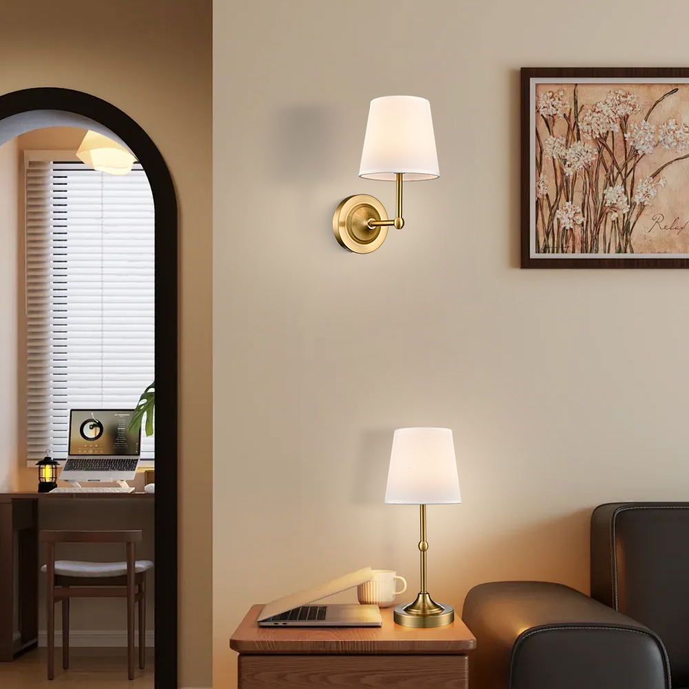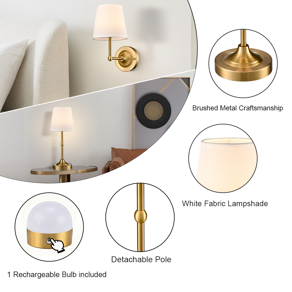 Boasting a shiny gold finish, the battery operated wall sconces elevate the decor with a bit of metallic pizzazz. Their fabric cone shades are held aloft and supported by sturdy detachable gold arms, lending a ton of texture and the right amount of style to your interior. Their gold finish contrasts with the fabric shades and adds alluring visual interest to the space. The light pouring through the white fabric lampshades is gently muted and fills the room without any glare. They can both be used as wall lights and table lamps.