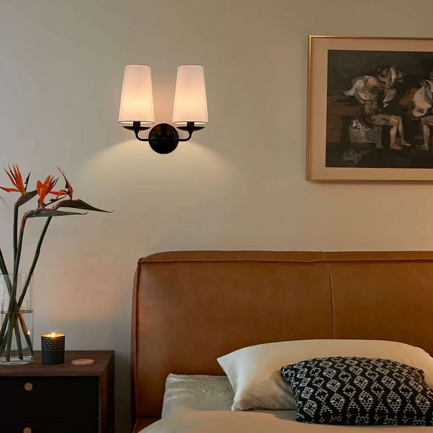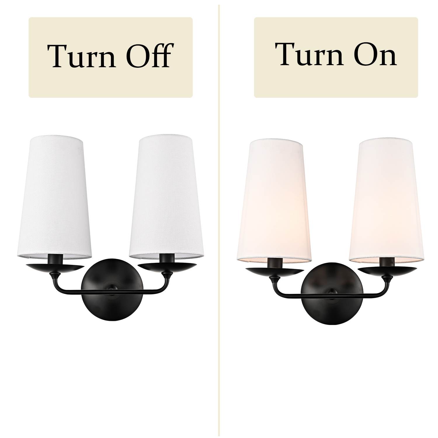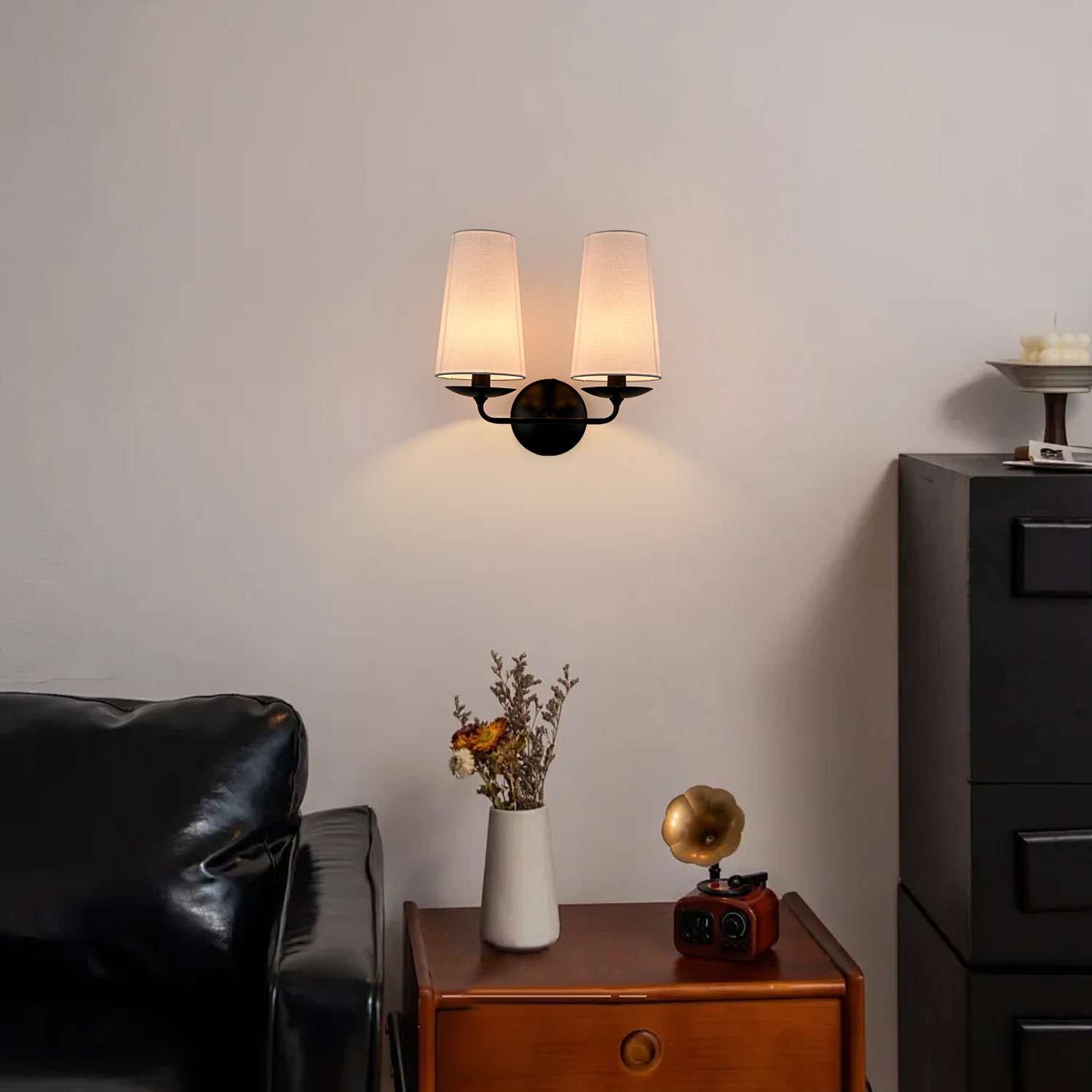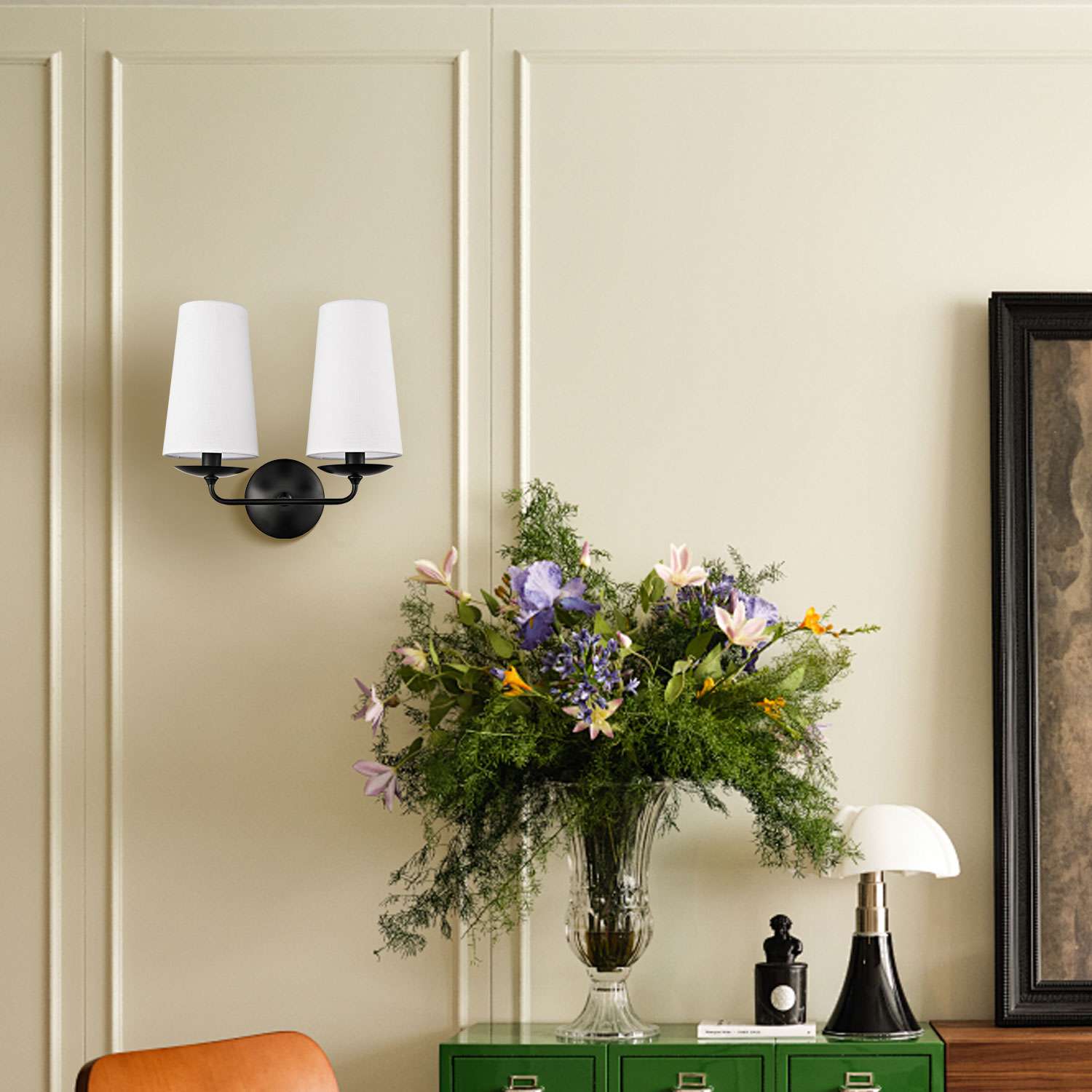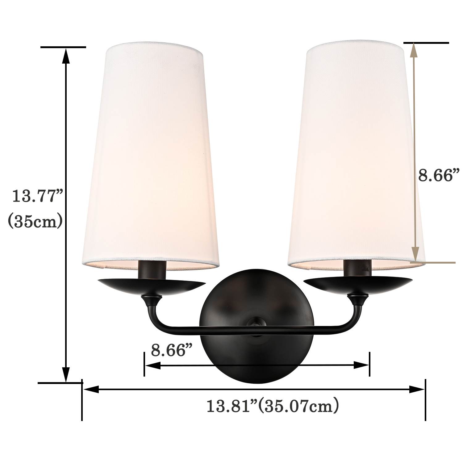 The 2-light wall sconce’s canopy, lamp holders, and arm flaunt a rustproof semigloss black finish, sprucing up your interior with a dash of drama. Its elongated white linen cone shades cast an enchanting aura of elegance and make for a tasteful statement in your home. The light pouring through the linen lampshades is gently muted and fills the room without any glare. Its white linen cone shades contrast the black finish and add alluring visual interest to the living area. It is an awesome addition to your living space with its black and white classic color combo.