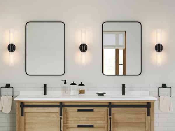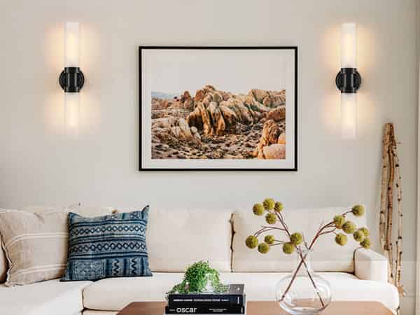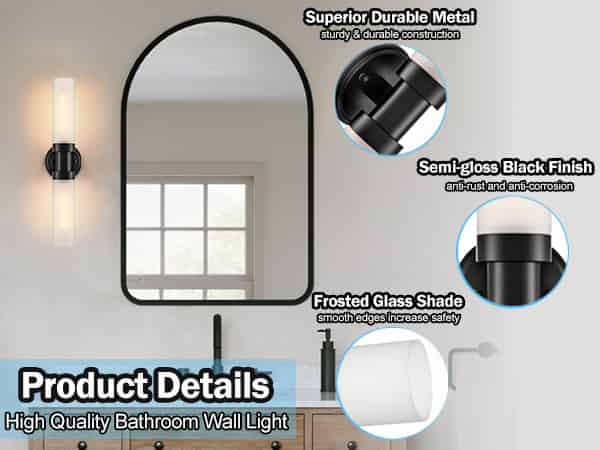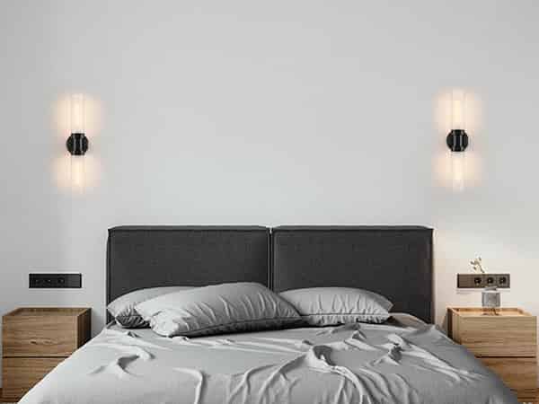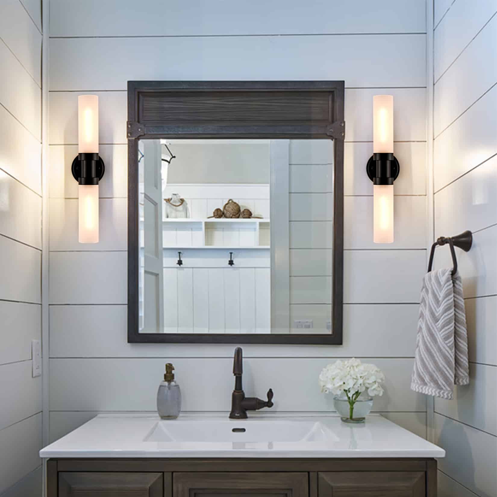 The modern black wall sconce flaunts a rustproof semigloss black finish, bringing a dash of drama and dramatic decorative impact to your living space. It shows off two elongated cylinder shades crafted from impurity-free frosted glass. It is held aloft by a black metal frame in the middle, bringing an unrivaled level of sophistication. Its cylinder shades contrast the black finish and add alluring visual interest to the interior. A charming glow shines through its opaque frosted glass shades, creating intriguing light effects and shades. It can be installed either horizontally or vertically.