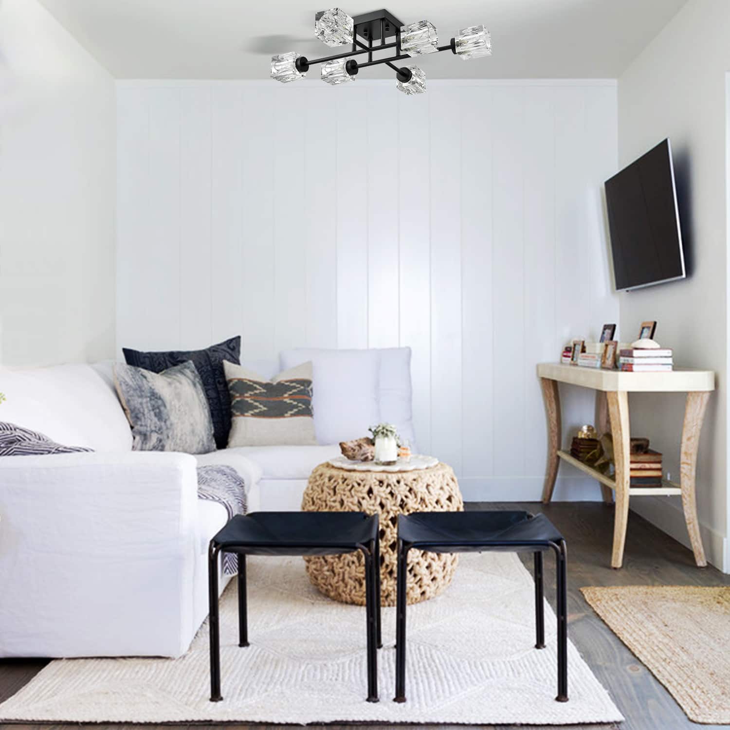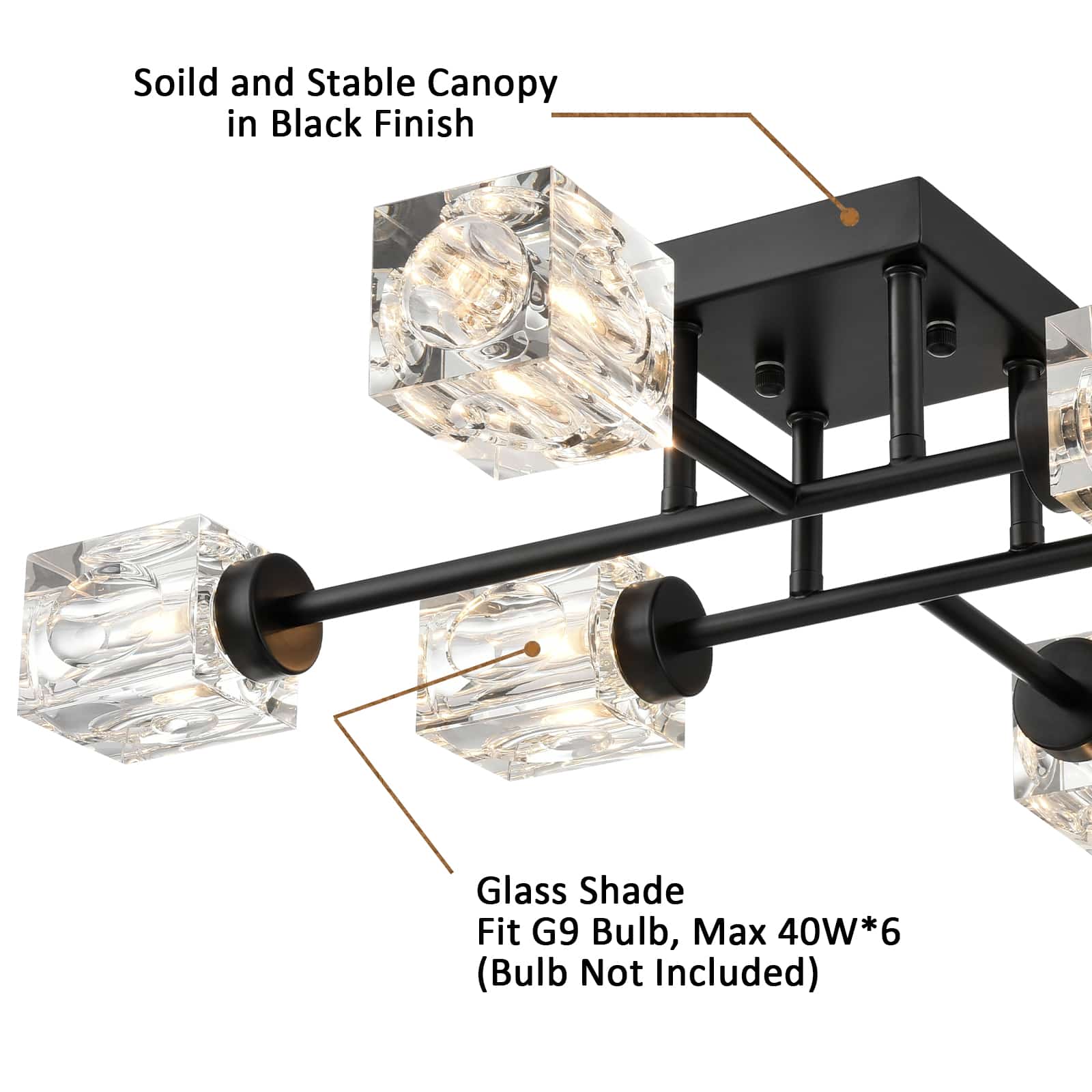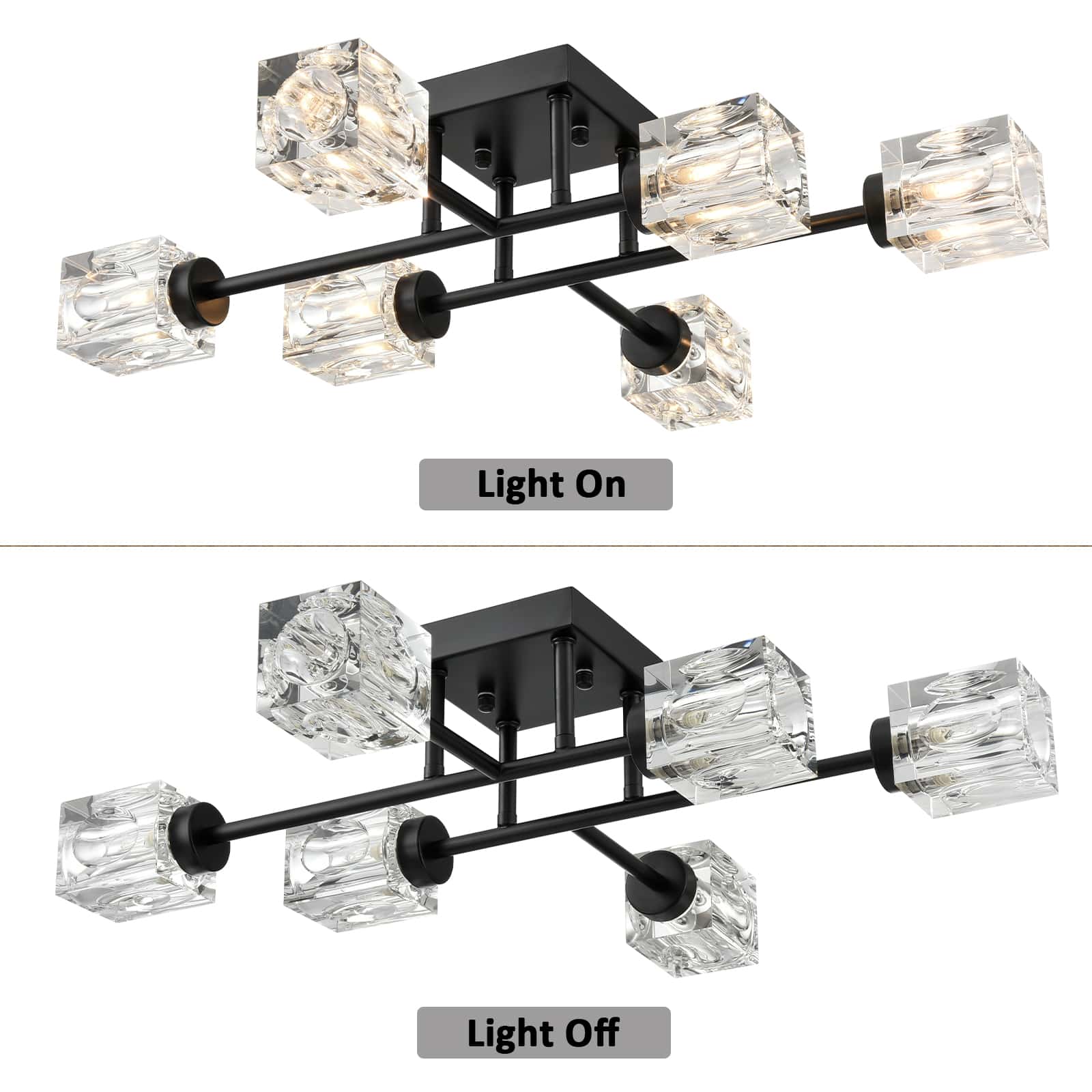 Flaunting a rustproof semigloss black finish, the semi flush mount ceiling light delivers dramatic decorative impact and gives your living space a touch of urban sophistication. Its six intersecting arms spread light in all directions and each arm carries a crystal lampshade at the end. The crystal shades largely resemble the glittering ice cubes. The sputnik-inspired design brings a funky, contemporary update to the living space. This fashionable fixture flaunts a futuristic starburst silhouette, providing a whimsical touch and a dash of drama to your space. Its crystal cubes contrast the black finish and add alluring visual interest to the living area.
