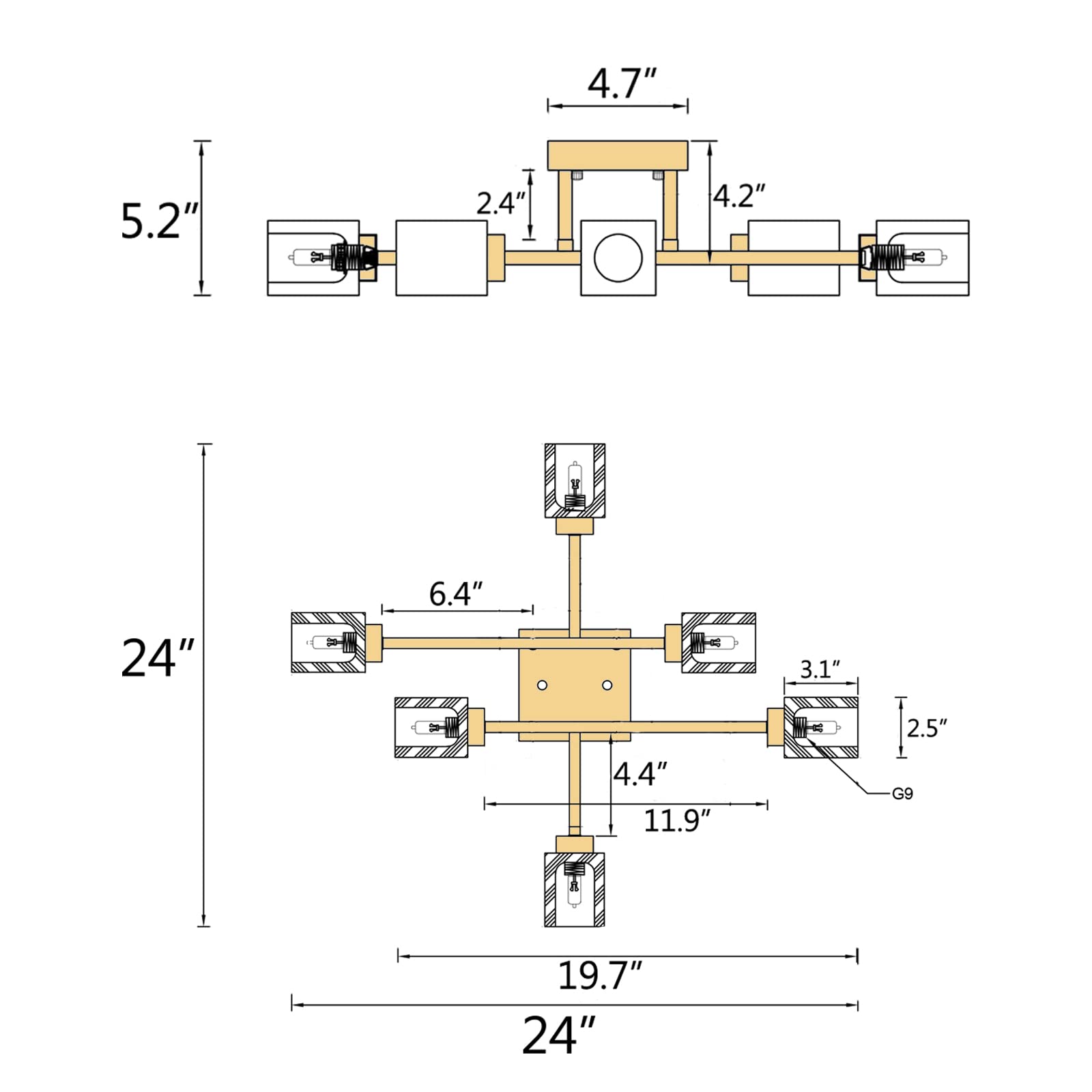 The ceiling light comes with six G9-base sockets which are compatible with a variety of bulb types: LED, INCANDESCENT, CFL.