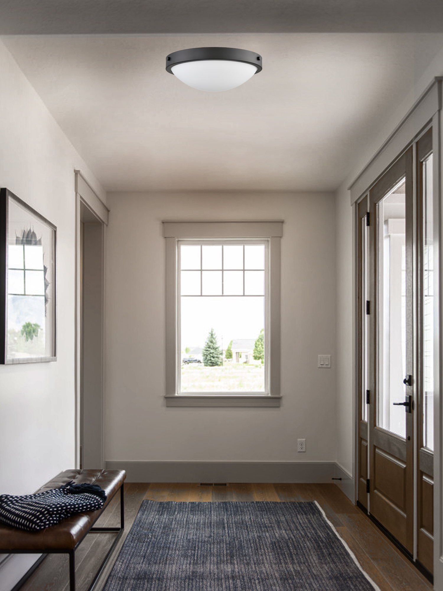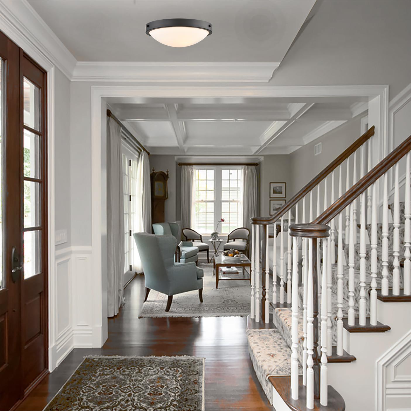 Finished in semi-gloss black color, the flush mount light possesses a low profile bowl-shape white glass lampshade, adding a modern farmhouse aesthetic statement in your living spaces.