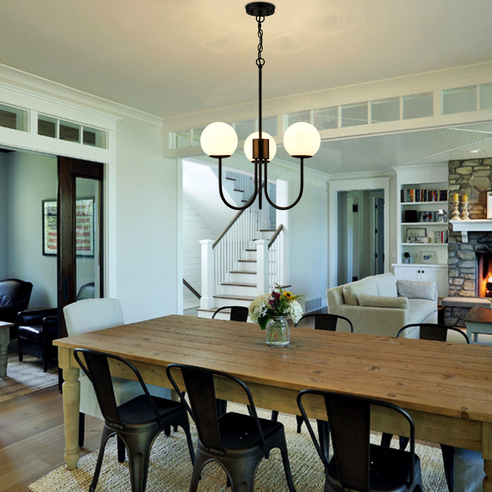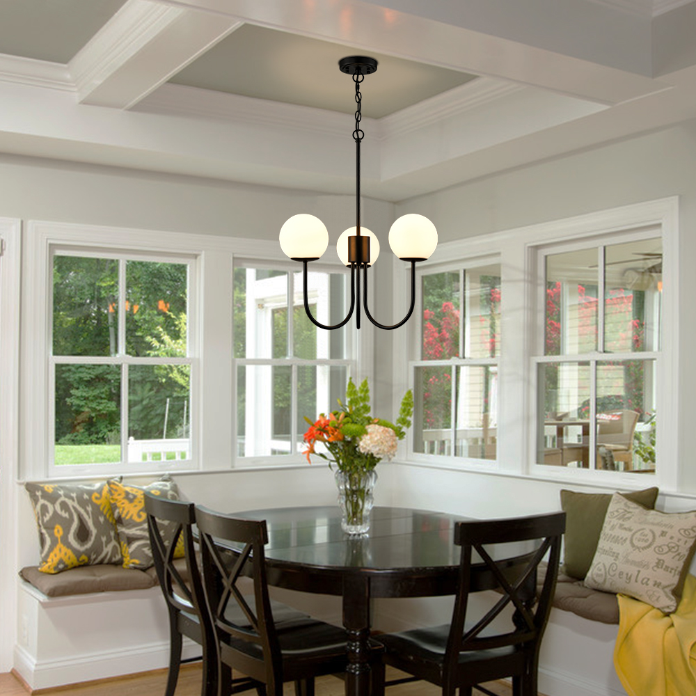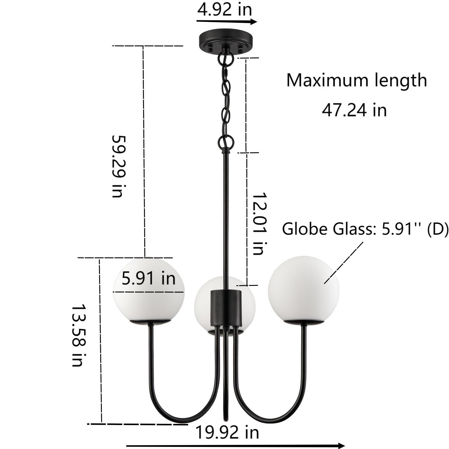 Flaunting a rustproof semigloss black finish, the glass globe chandelier gives your interior a touch of modern sophistication. It supplies a dash of drama to the living space and makes your home fizz with a pop of personality. Crafted from hand-blown opaque opal glass, it provides the perfect blend of mid-century classic and contemporary elements. Three glass shades are supported by gracefully curved arms extending upward, conveying a refined touch. Its opal glass shades contrast the black finish and add alluring visual interest to the space. It comes with one 12-inch rod and one 47.24-inch adjustable chain.