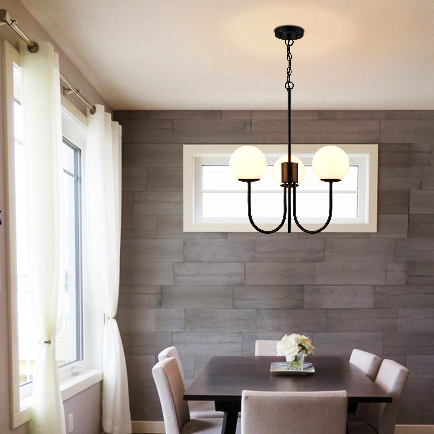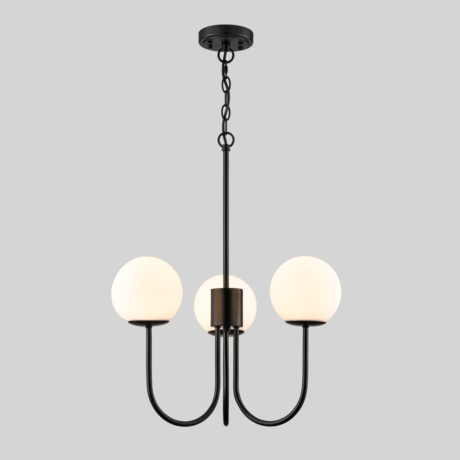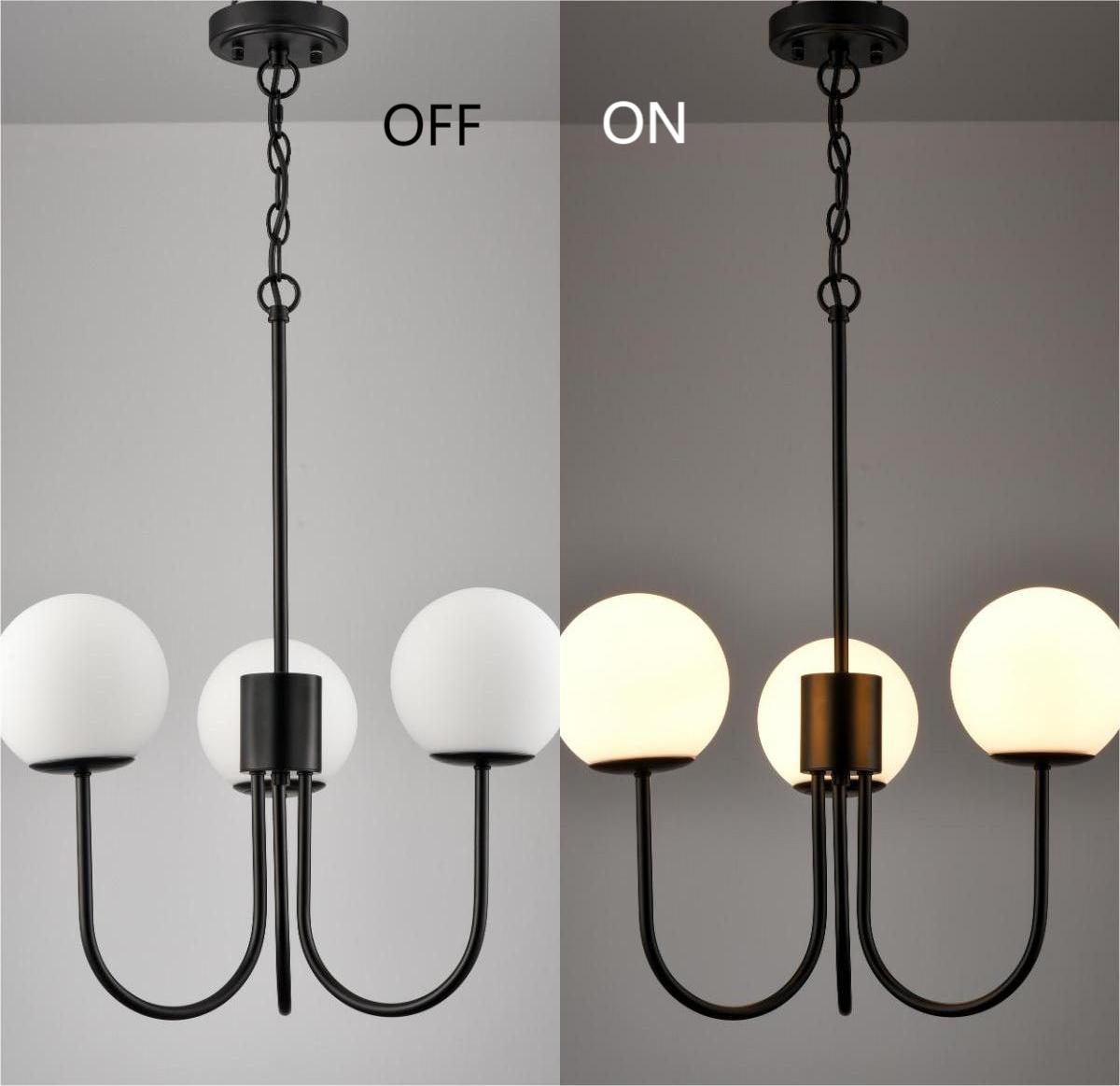 Flaunting a rustproof semigloss black finish, the glass globe chandelier gives your interior a touch of modern sophistication. It supplies a dash of drama to the living space and makes your home fizz with a pop of personality. Crafted from hand-blown opaque opal glass, it provides the perfect blend of mid-century classic and contemporary elements. Three glass shades are supported by gracefully curved arms extending upward, conveying a refined touch. Its opal glass shades contrast the black finish and add alluring visual interest to the space. It comes with one 12-inch rod and one 47.24-inch adjustable chain.