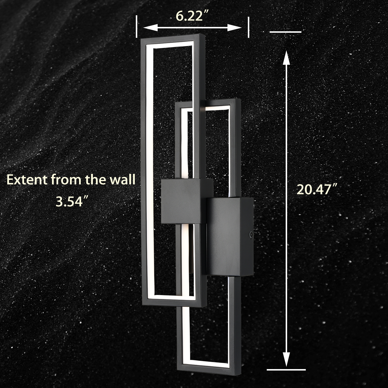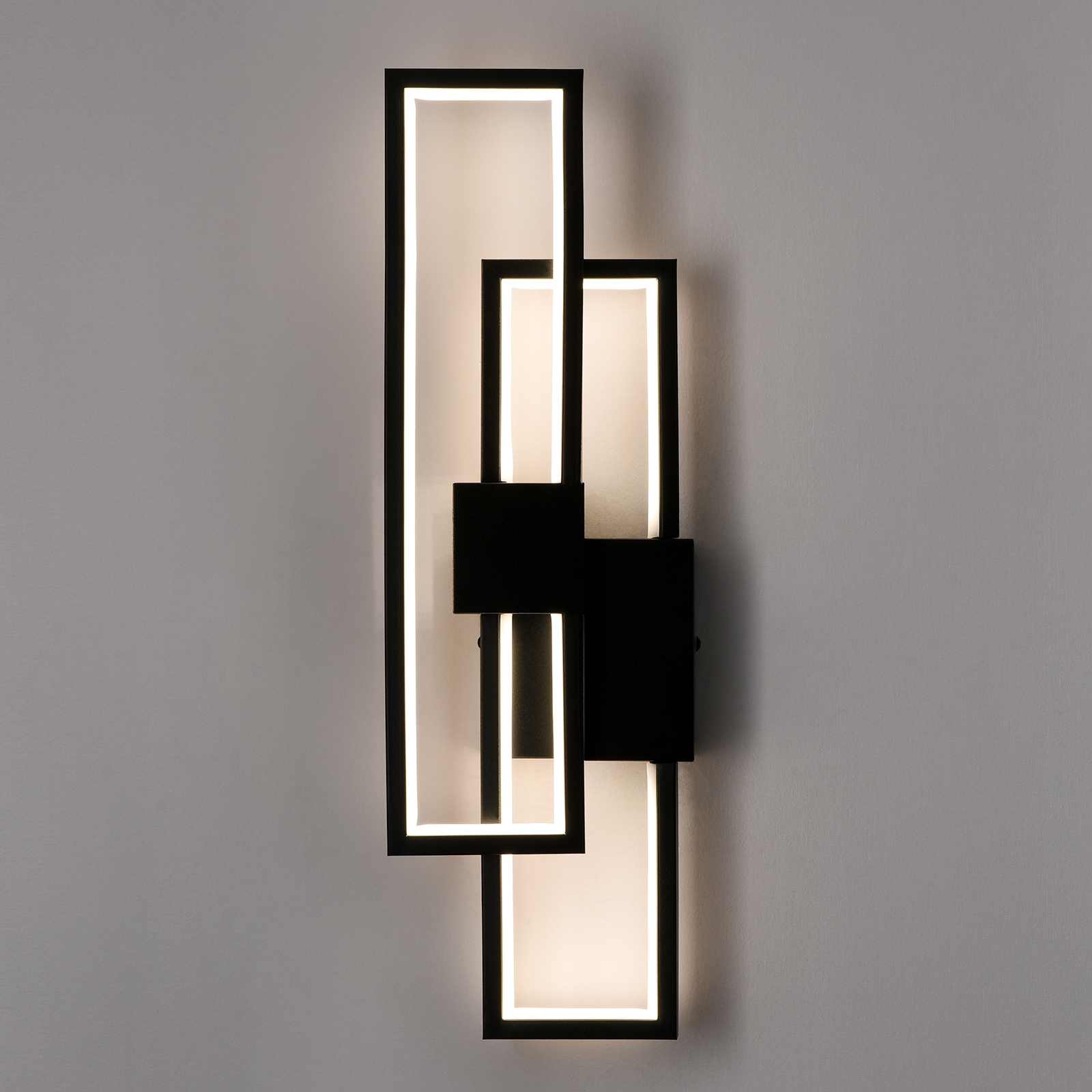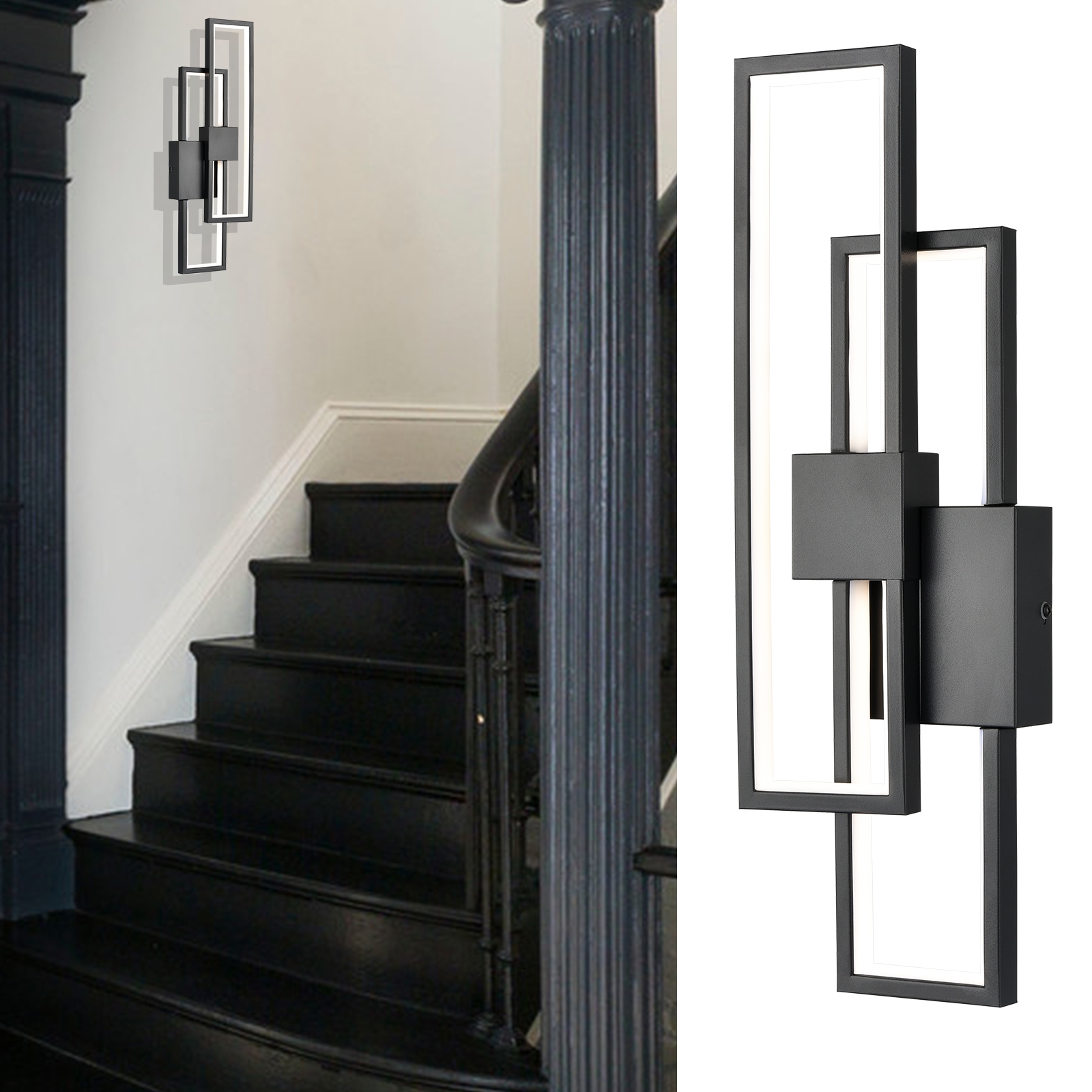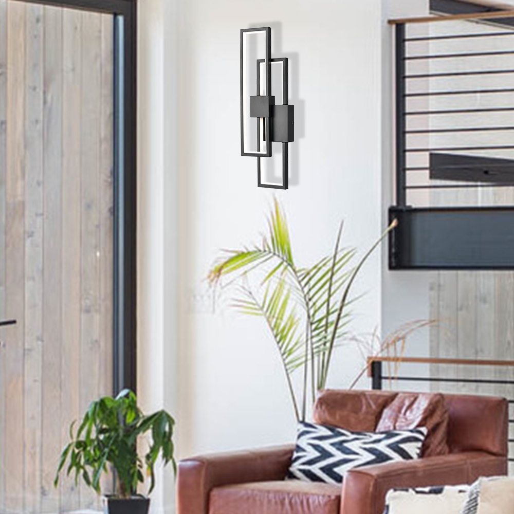 Flaunting a matte black finish, the black LED wall sconce adds a touch of modern sophistication to your interior. It shows off a simple but edgy design as an energy-efficient wall light. Two rectangular black metal frames intersect and are held aloft by the smaller rectangular metal frames in the middle, presenting an intricate yet whimsical look. It provides a surprising twist and an attractive eye appeal. A charming glow shines through the light, filling the space without any glare. It supplies a dash of drama and showcases the beauty of geometry. It can be installed horizontally or vertically.